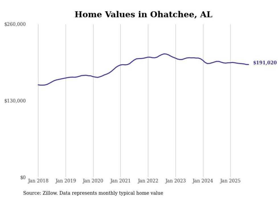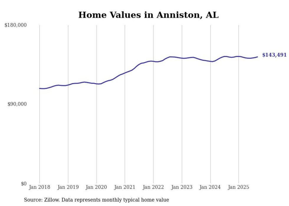 Stacker compiled a list of cities with the most expensive homes in the Anniston metro area using data from Zillow. Charts show the monthly typical home value since January 2018. All 9 cities and towns with data available were included in the list.
