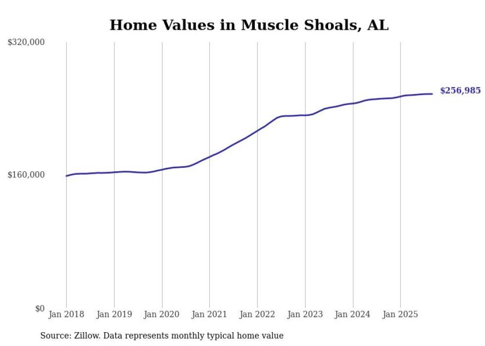 Stacker compiled a list of cities with the most expensive homes in the Florence-Muscle Shoals, AL metro area using data from Zillow. Charts show the monthly typical home value since January 2018.