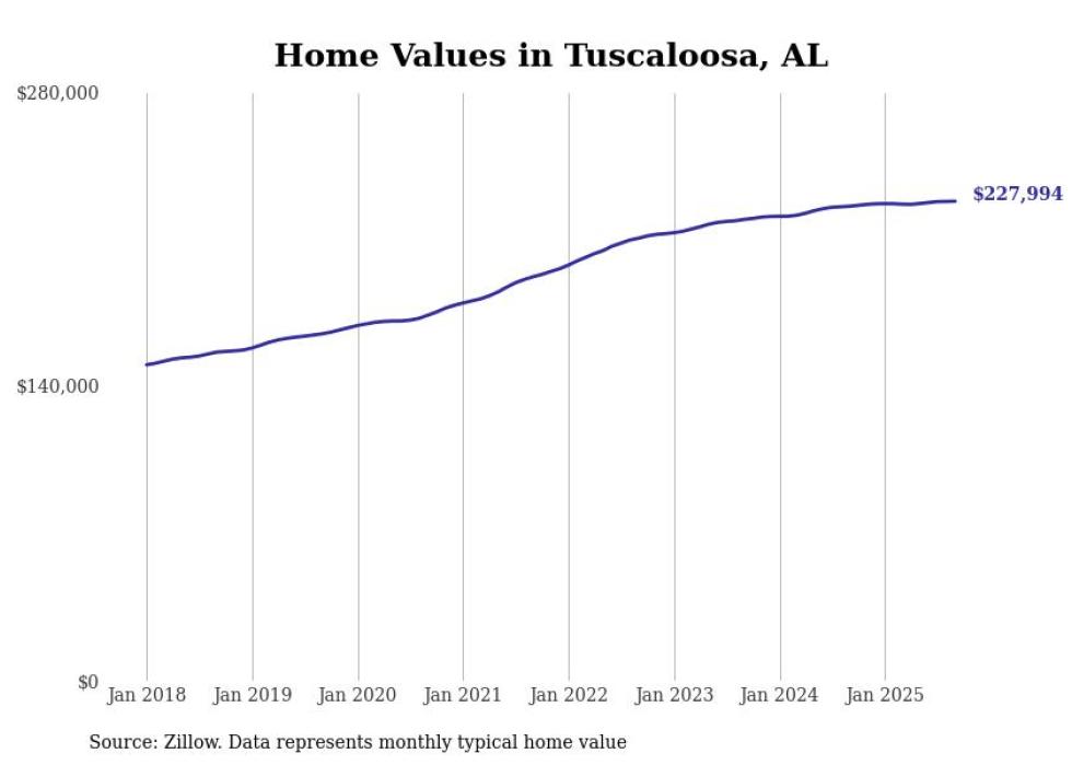 Stacker compiled a list of cities with the most expensive homes in the Tuscaloosa metro area using data from Zillow. Charts show the monthly typical home value since January 2018. All 19 cities and towns with data available were included in the list.