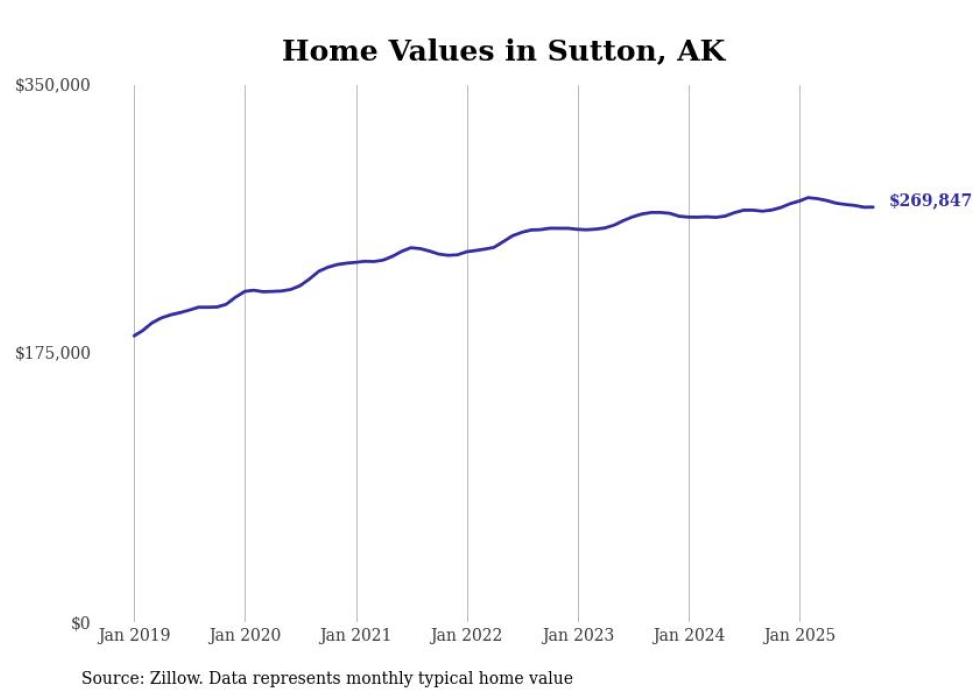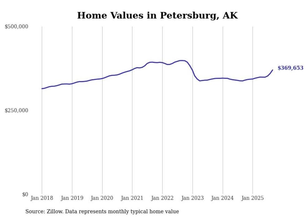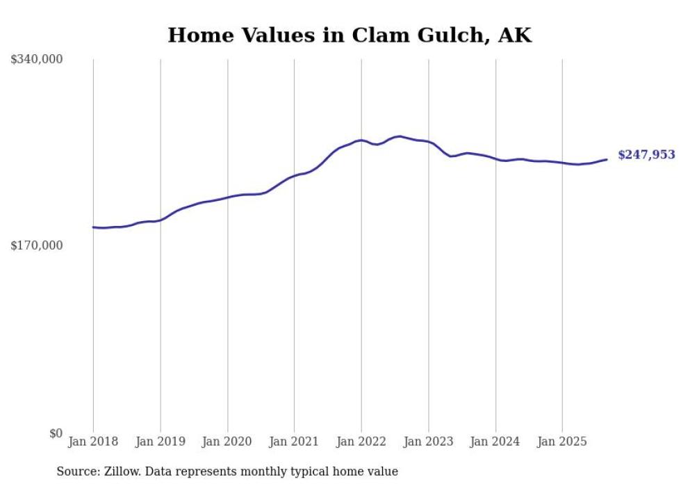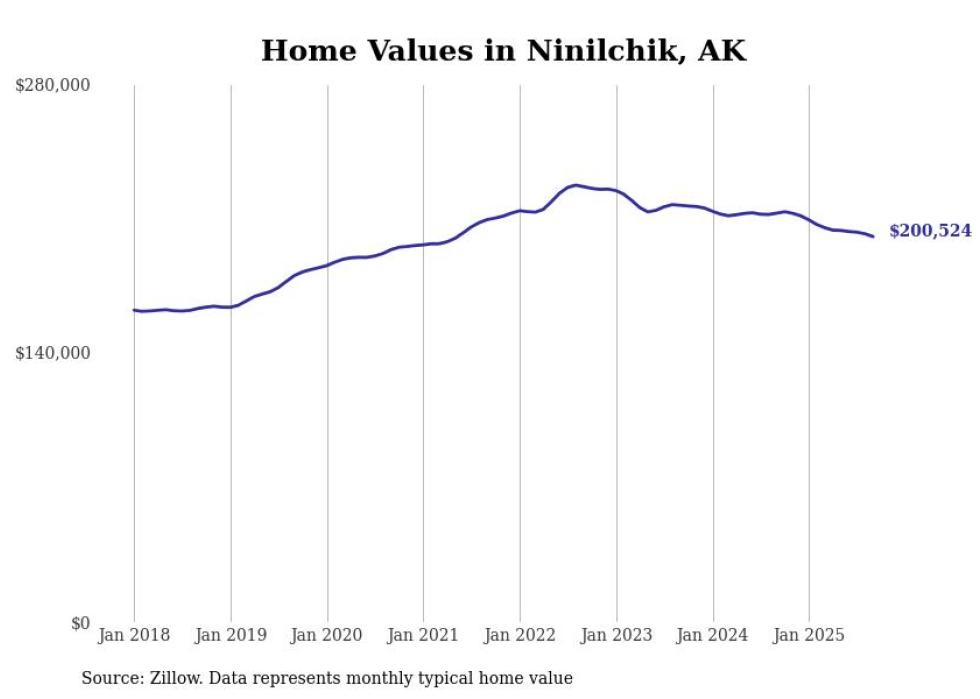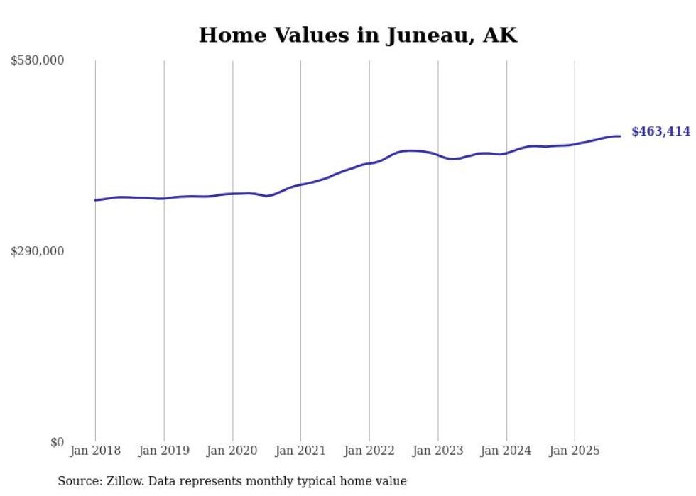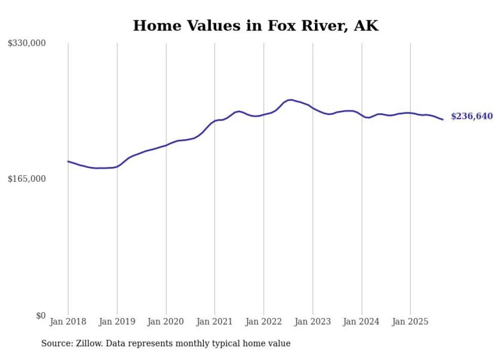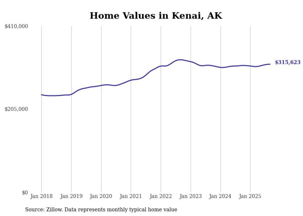Stacker compiled a list of cities with the fastest-growing home prices in Alaska using data from Zillow. Cities are ranked by the dollar change in the Zillow Home Values Index for all homes from the 12 months ending September 2025. The charts in this story were created automatically using Matplotlib. Data was available for 40 cities and towns in Alaska.