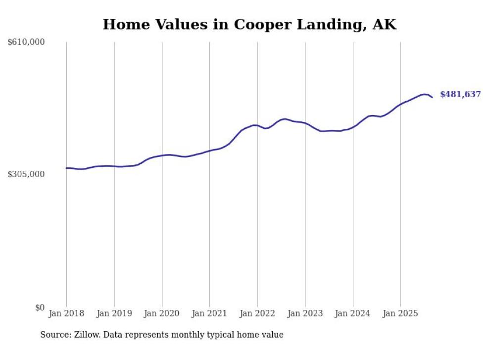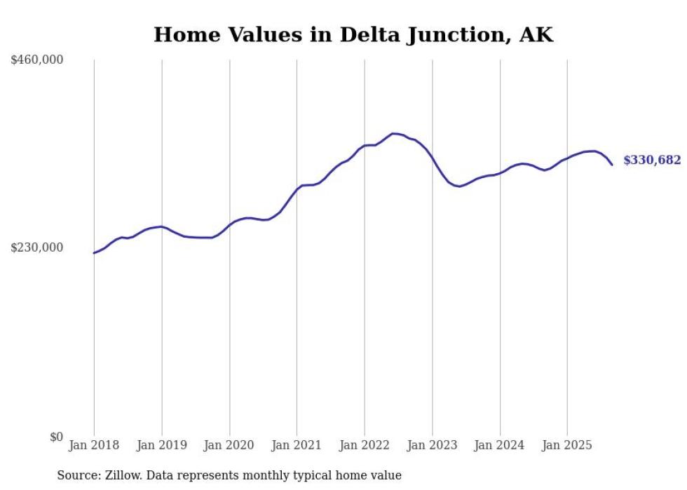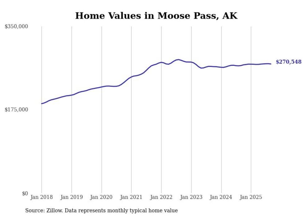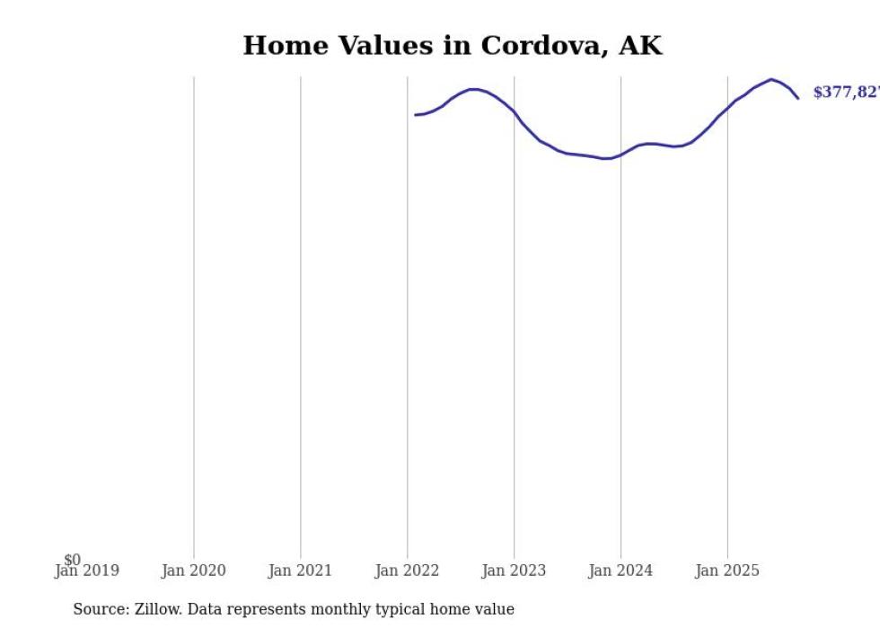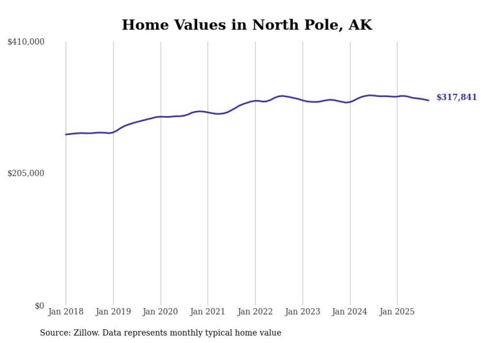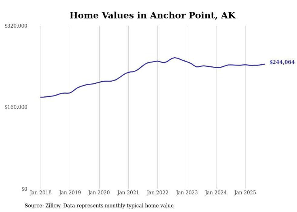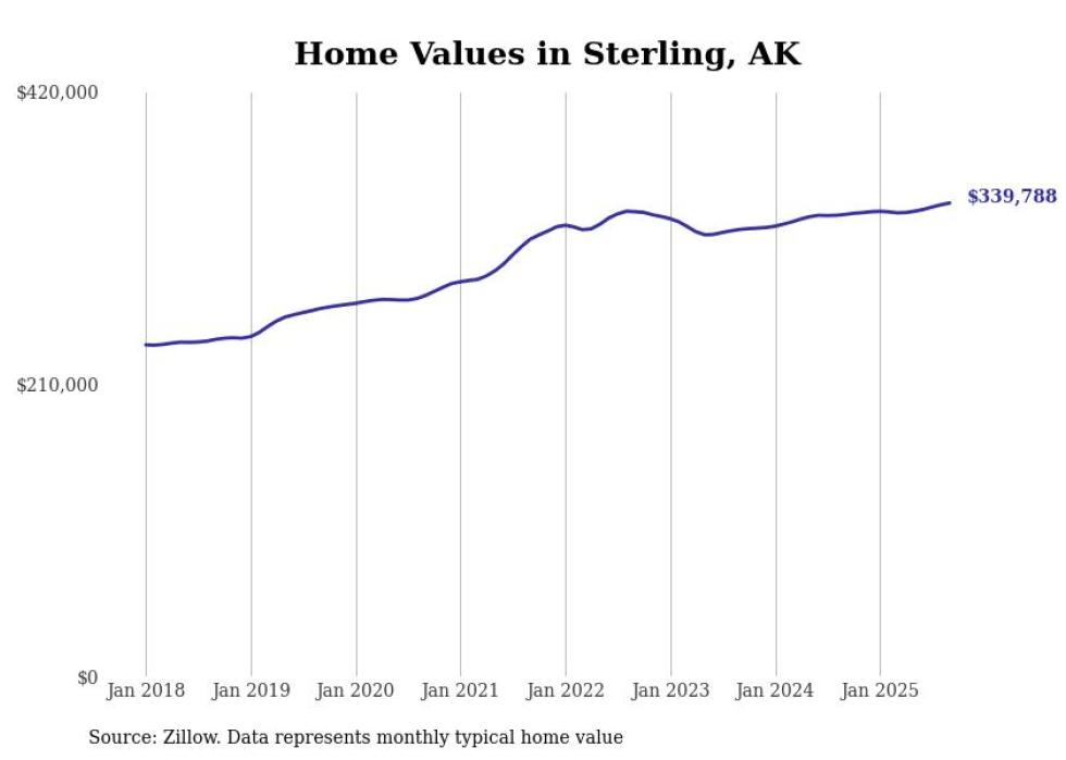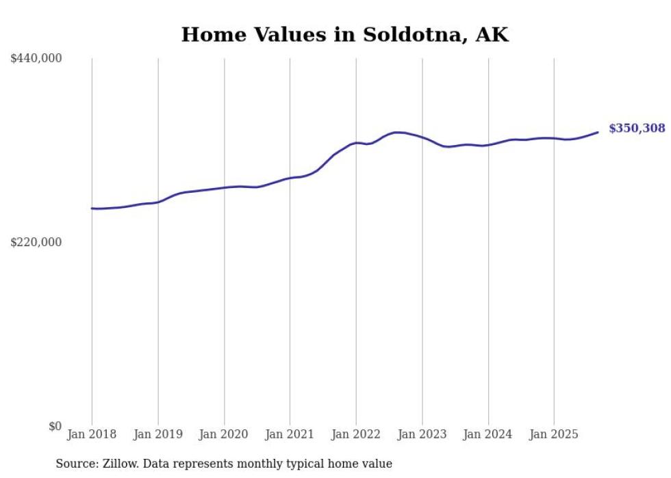Stacker compiled a list of cities with the fastest-growing home prices in Alaska using data from Zillow. Cities are ranked by the dollar change in the Zillow Home Values Index for all homes from the 12 months ending September 2025. The charts in this story were created automatically using Matplotlib. Data was available for 40 cities and towns in Alaska.