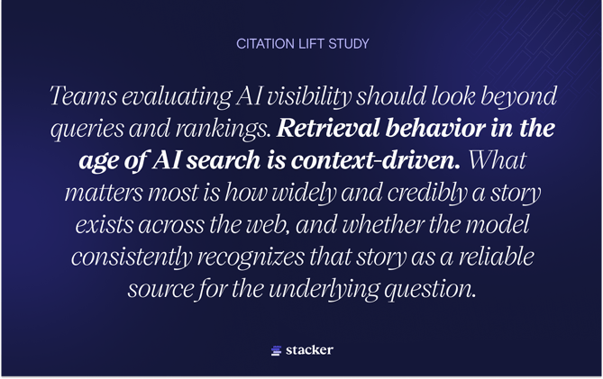 Additionally, these patterns indicate that teams evaluating AI visibility should look beyond queries and rankings. Retrieval behavior in the age of AI search is context-driven. What matters most is how widely and credibly a story exists across the web, and whether the model consistently recognizes that story as a reliable source for the underlying question. A strong presence across multiple reputable domains gives AI systems more opportunities to encounter and validate the information, which increases the likelihood of being cited.