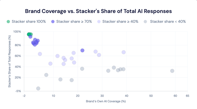 Earned media via Stacker-distribution's share of total AI visibility was highest where a brand's own domain coverage was lowest. The network carried the most weight for brands with the smallest existing AI footprint.