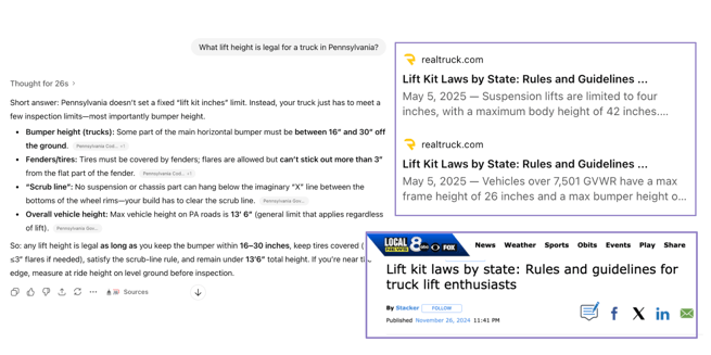 Five months after RealTruck and Stacker parted ways, a RealTruck marketer got curious. They could see in Stacker’s dashboard that the Lift Laws story had great pickup, but they decided to test ChatGPT, asking, “What lift height is legal for a truck in Pennsylvania?”