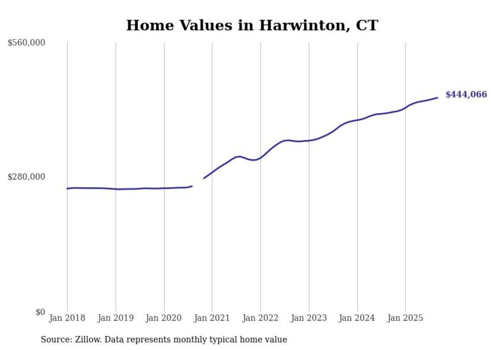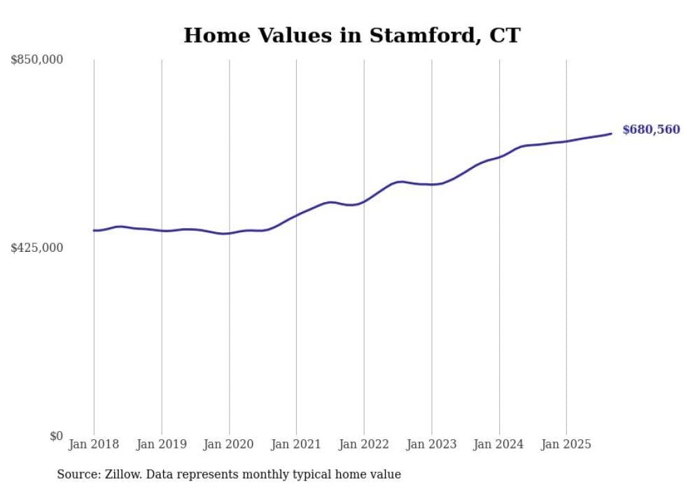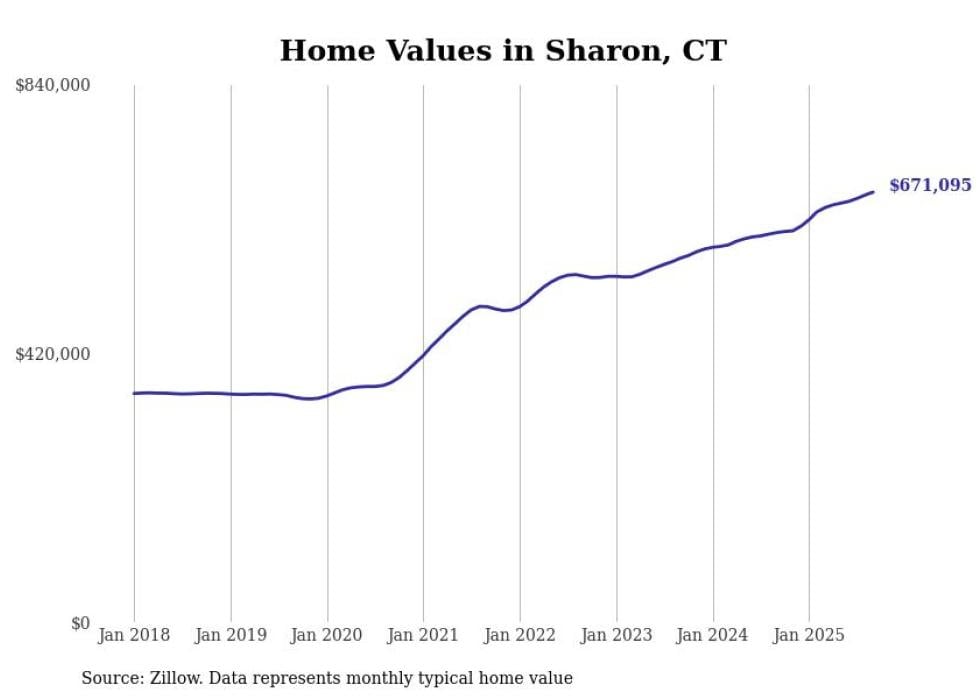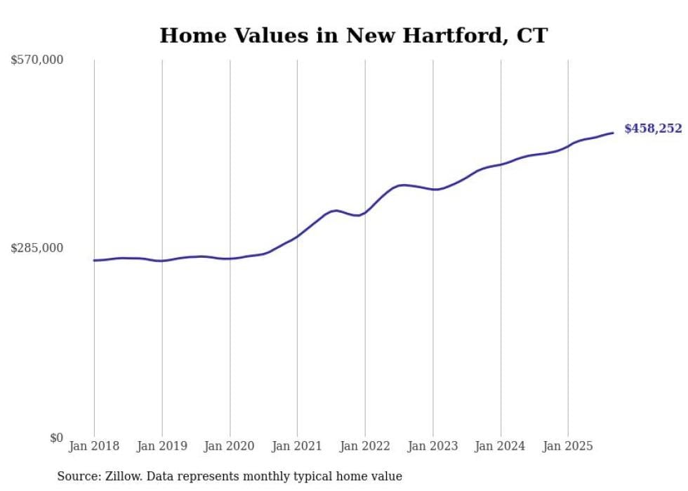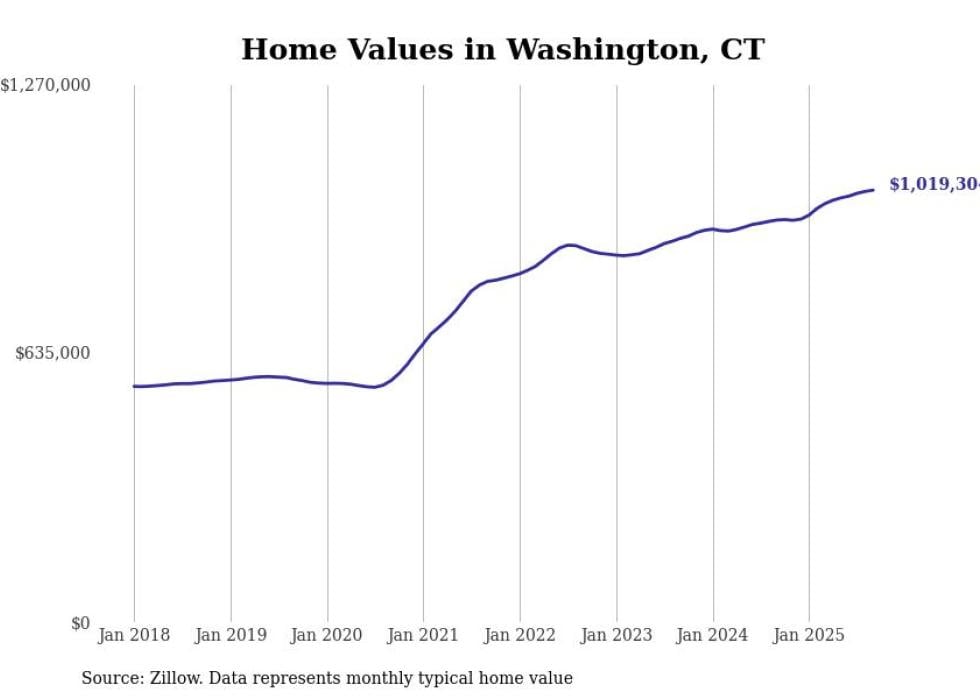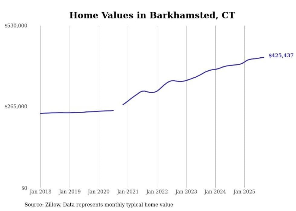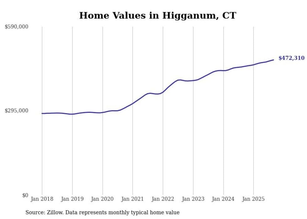 Stacker compiled a list of cities with the fastest-growing home prices in Connecticut using data from Zillow. Cities are ranked by the dollar change in the Zillow Home Values Index for all homes from the 12 months ending September 2025. The charts in this story were created automatically using Matplotlib. Data was available for 50 cities and towns in Connecticut.