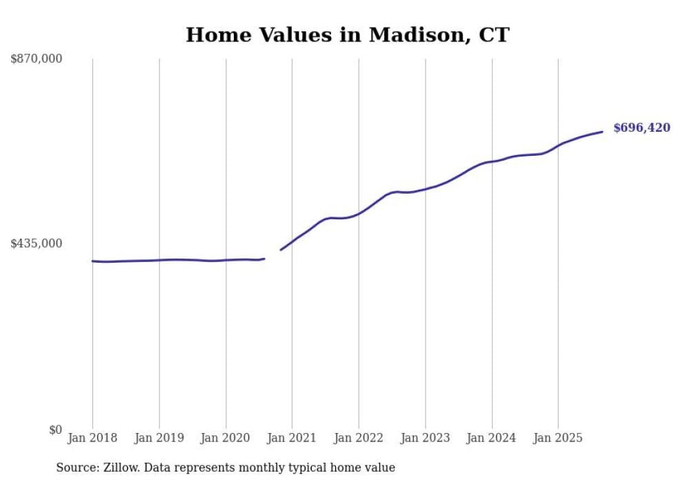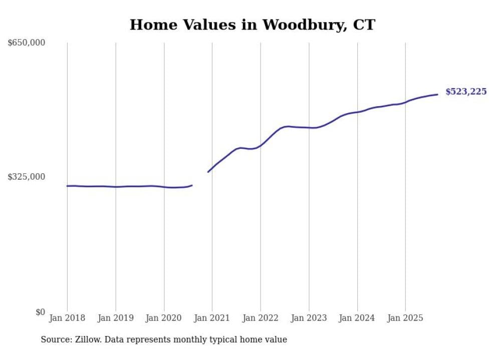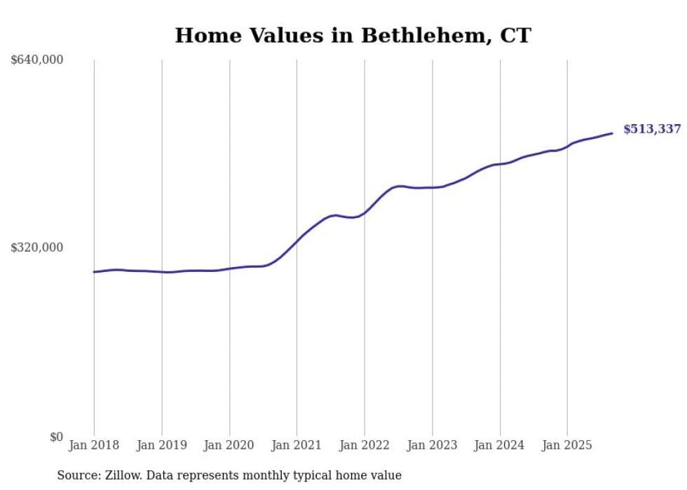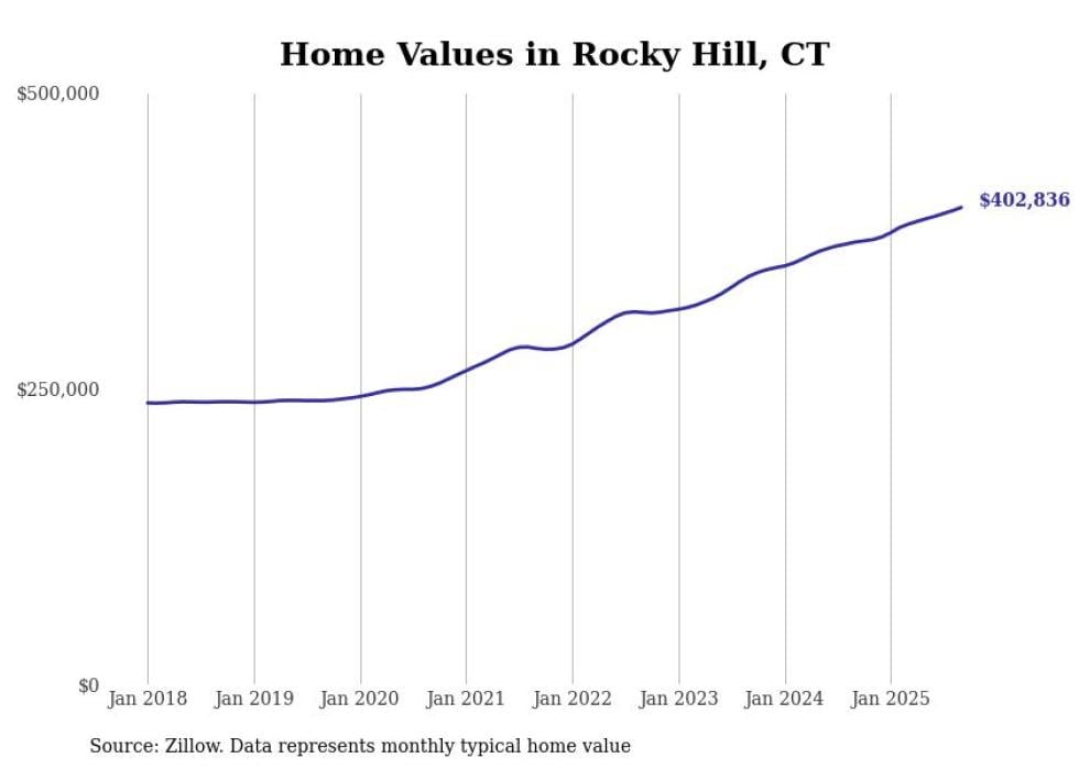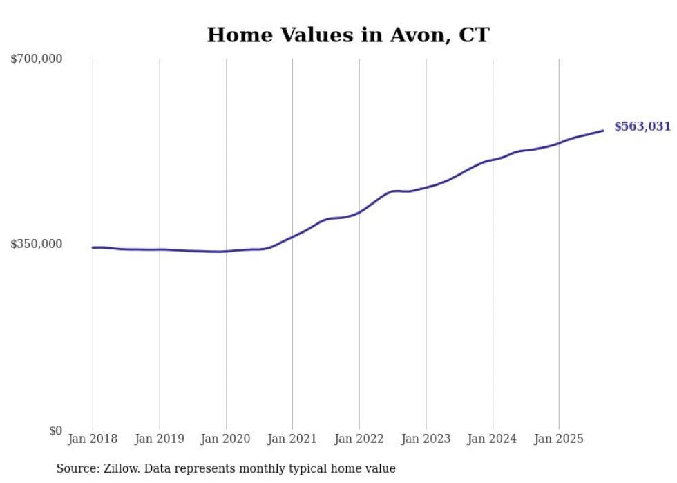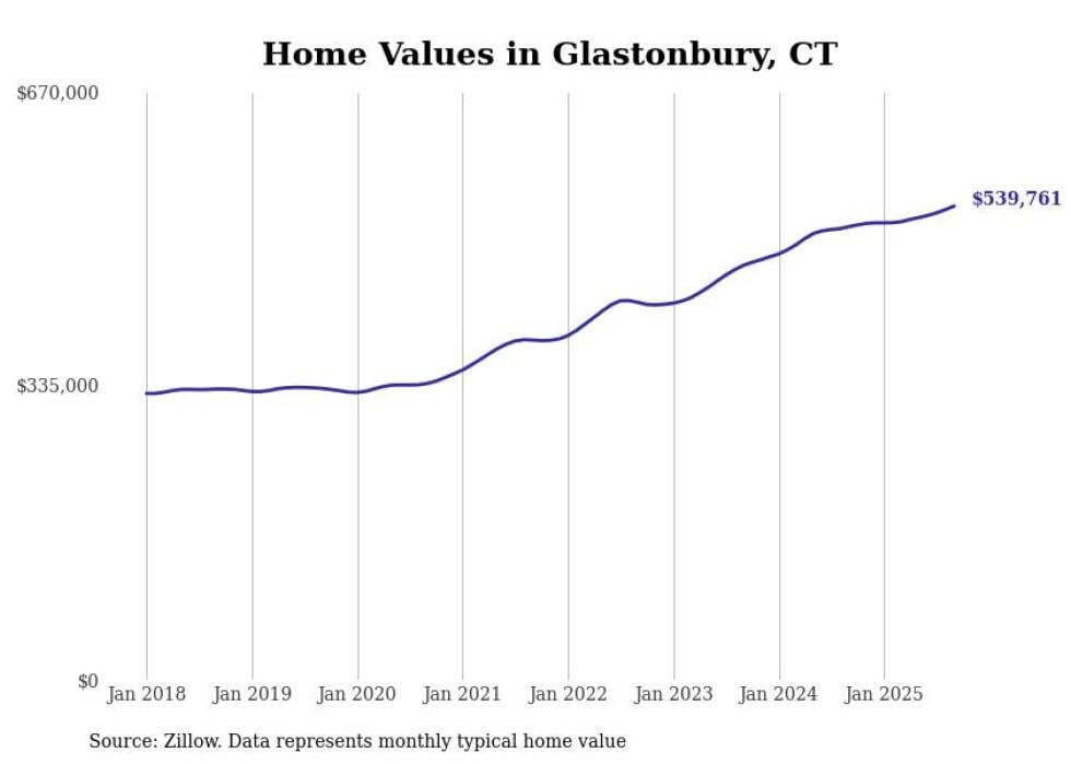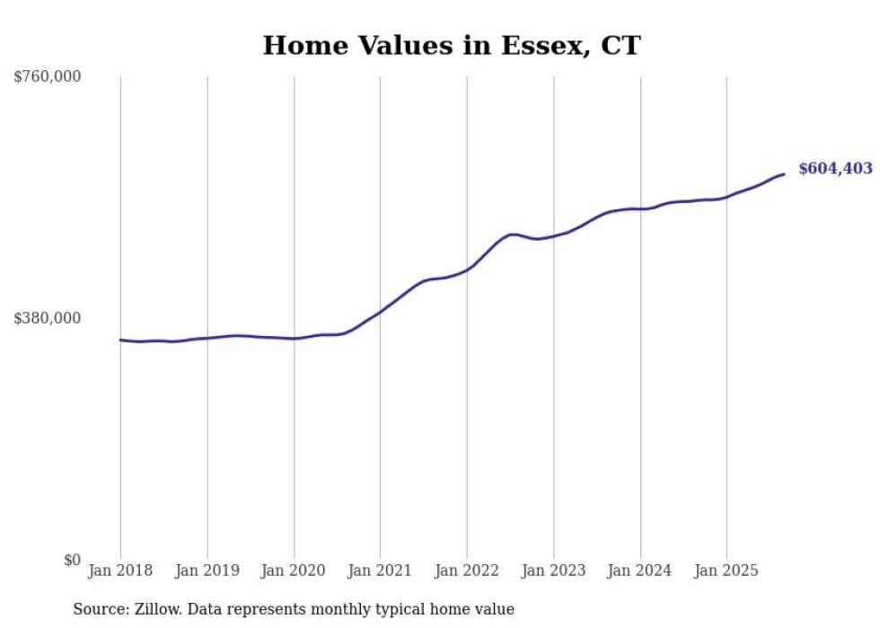 Stacker compiled a list of cities with the fastest-growing home prices in Connecticut using data from Zillow. Cities are ranked by the dollar change in the Zillow Home Values Index for all homes from the 12 months ending September 2025. The charts in this story were created automatically using Matplotlib. Data was available for 50 cities and towns in Connecticut.