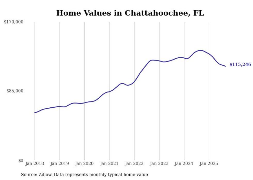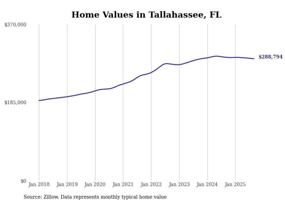 Stacker compiled a list of cities with the most expensive homes in the Tallahassee metro area using data from Zillow. Charts show the monthly typical home value since January 2018. All 11 cities and towns with data available were included in the list.