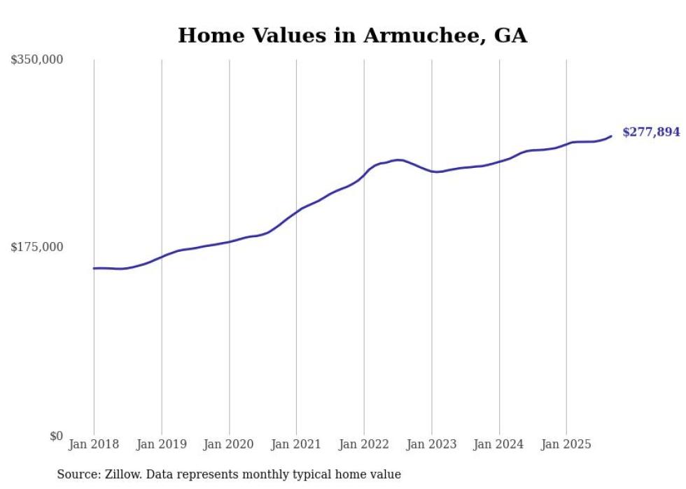 Stacker compiled a list of cities with the most expensive homes in the Rome metro area using data from Zillow. Charts show the monthly typical home value since January 2018. All 5 cities and towns with data available were included in the list.