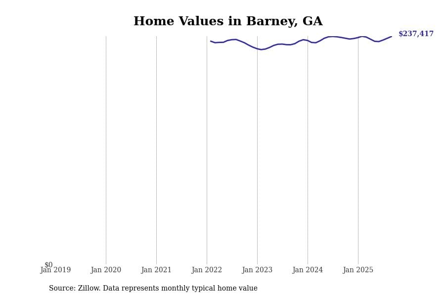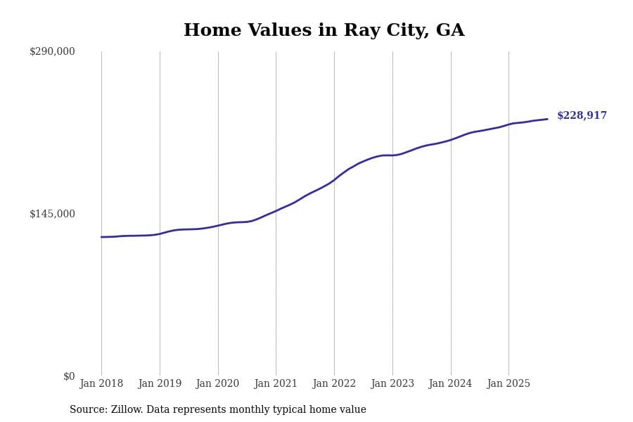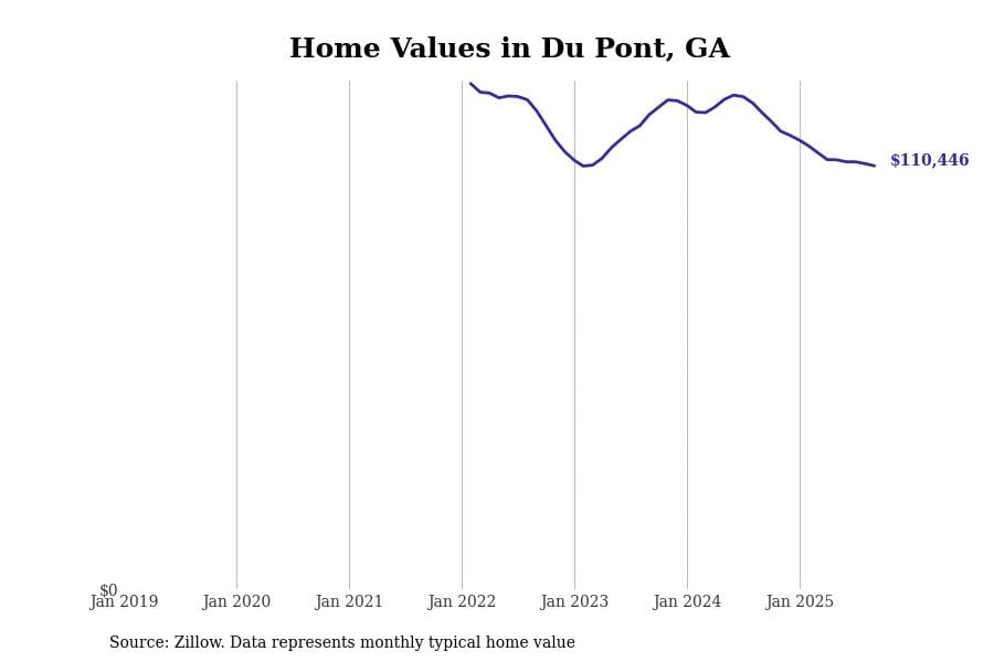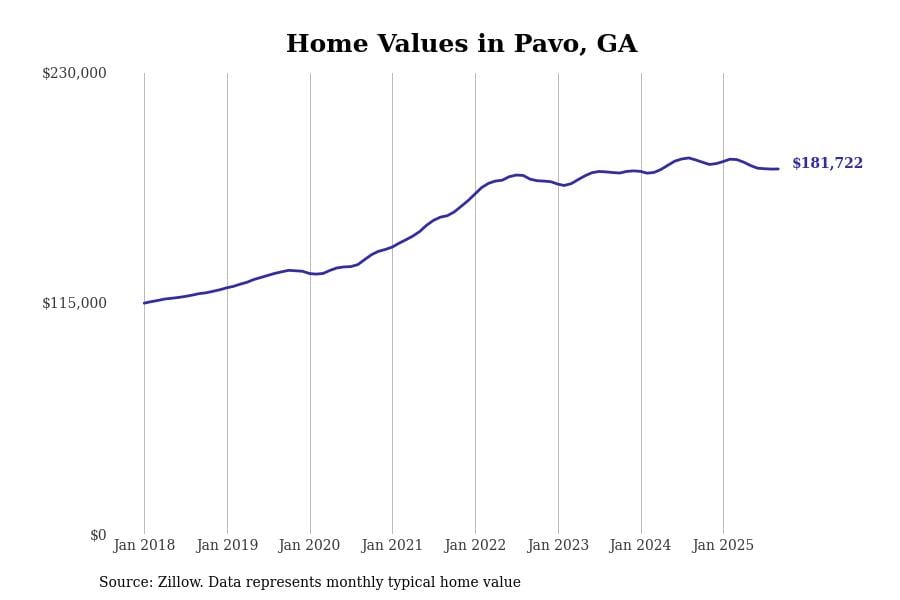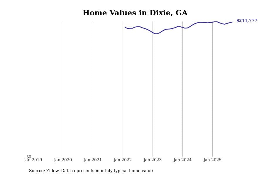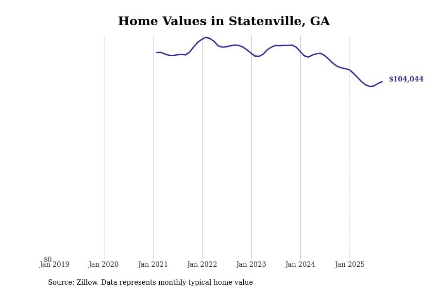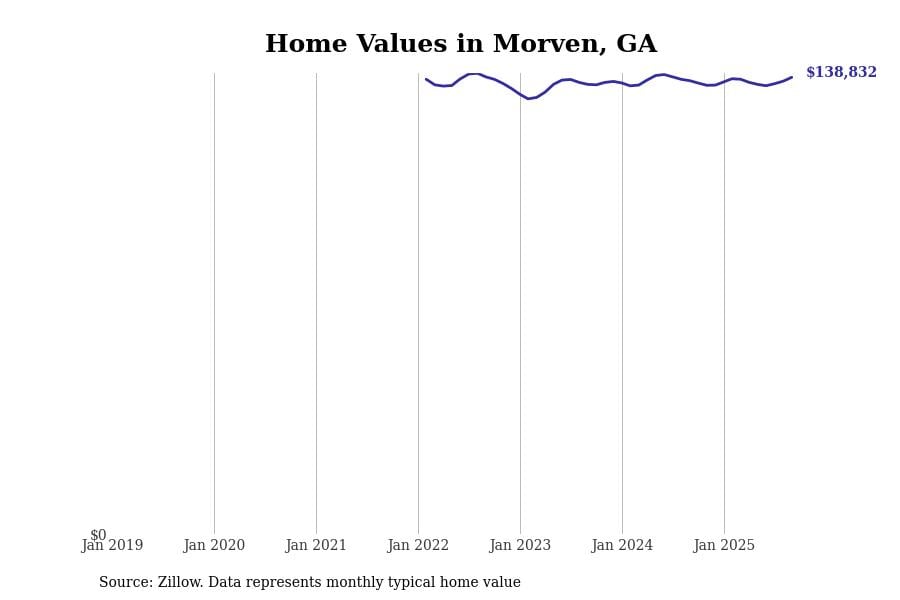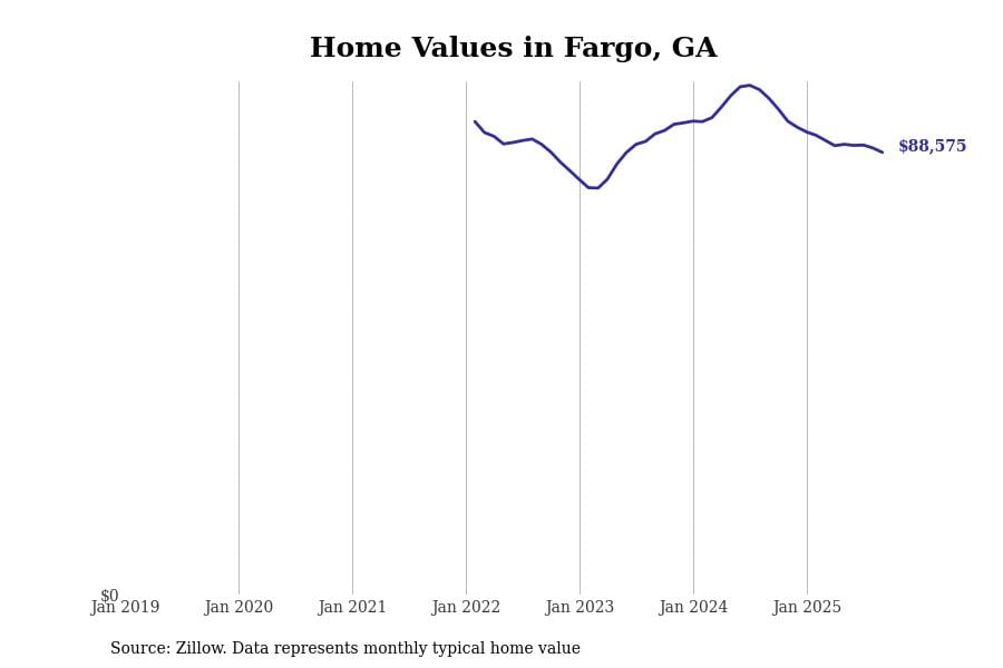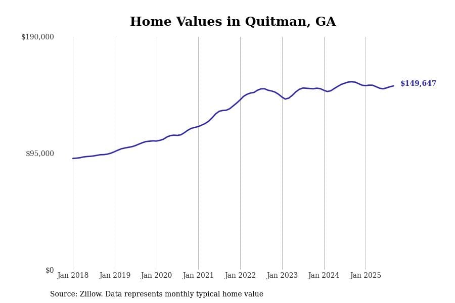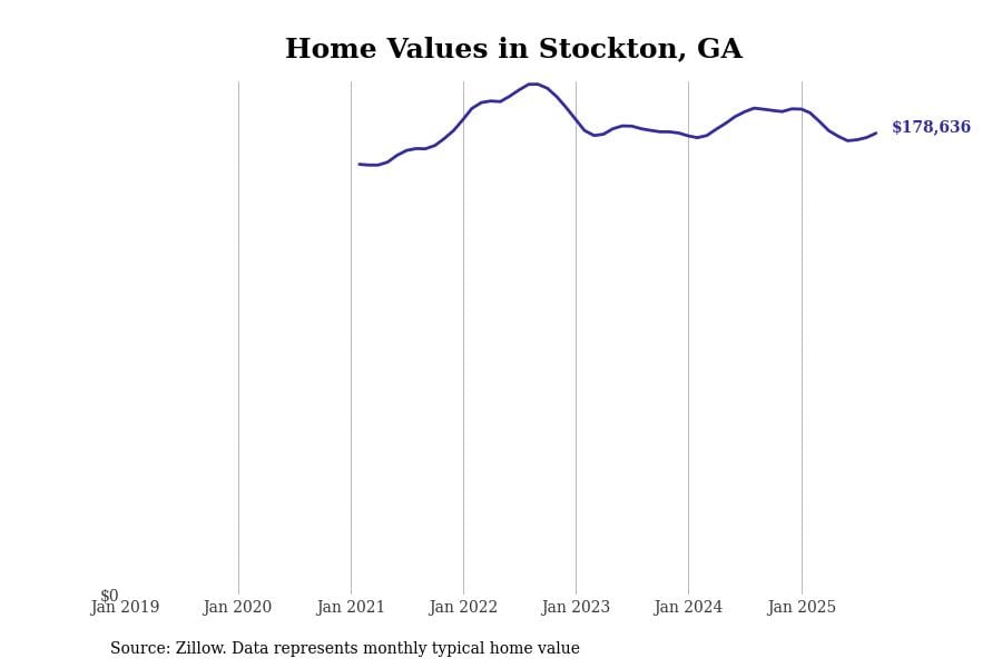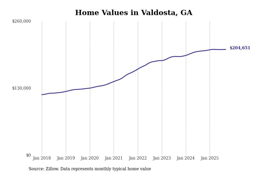 Stacker compiled a list of cities with the most expensive homes in the Valdosta metro area using data from Zillow. Charts show the monthly typical home value since January 2018. All 17 cities and towns with data available were included in the list.