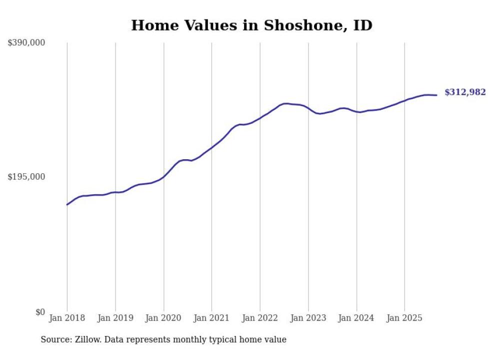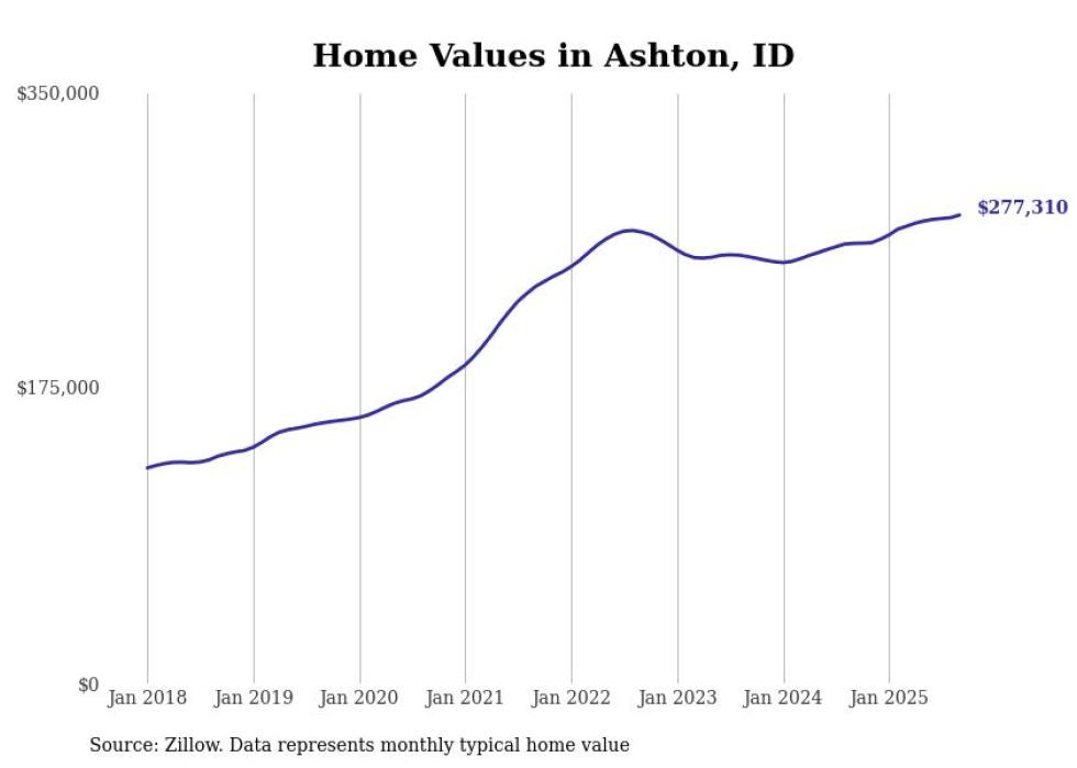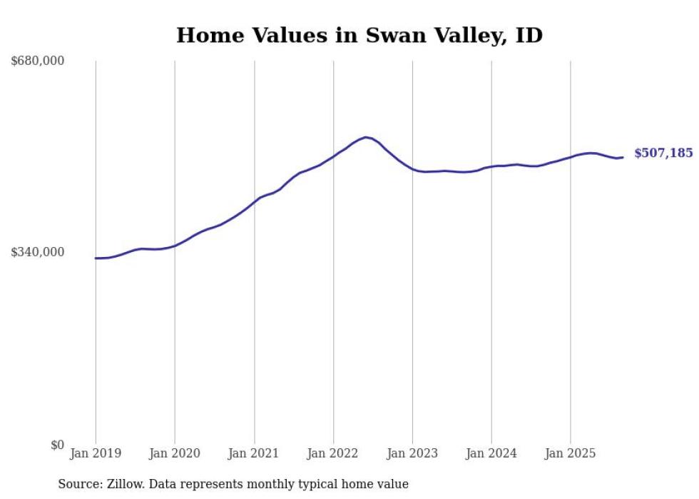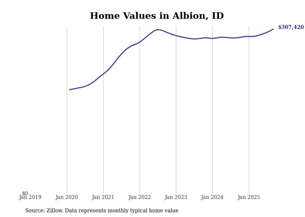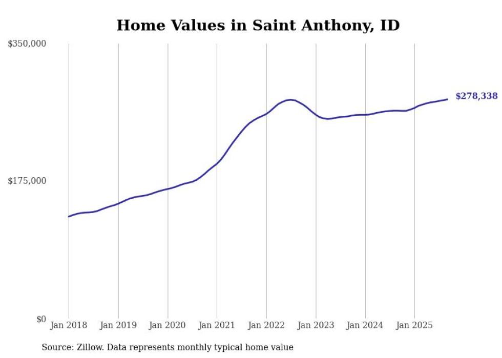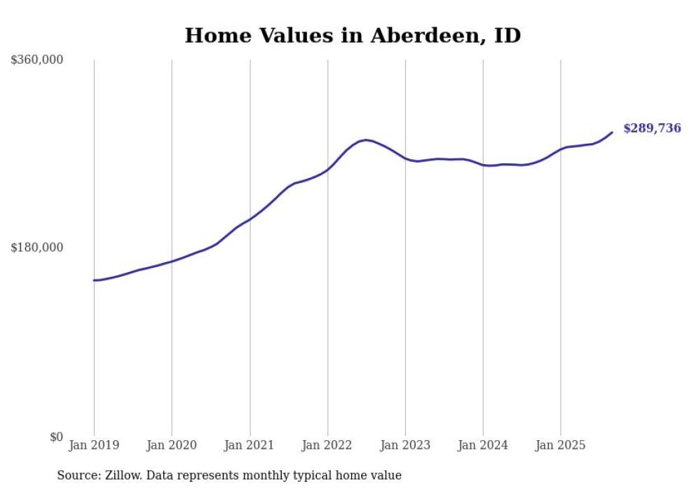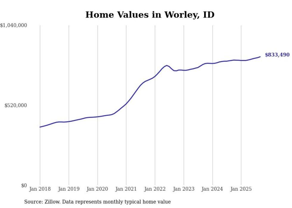 Stacker compiled a list of cities with the fastest-growing home prices in Idaho using data from Zillow. Cities are ranked by the dollar change in the Zillow Home Values Index for all homes from the 12 months ending September 2025. The charts in this story were created automatically using Matplotlib. Data was available for 50 cities and towns in Idaho.