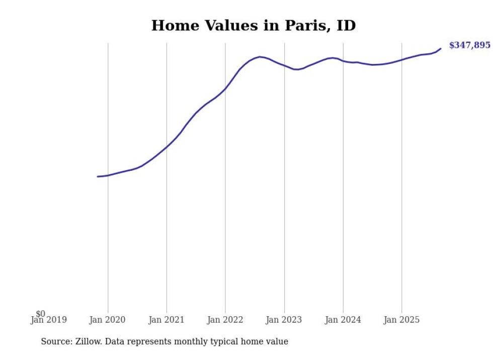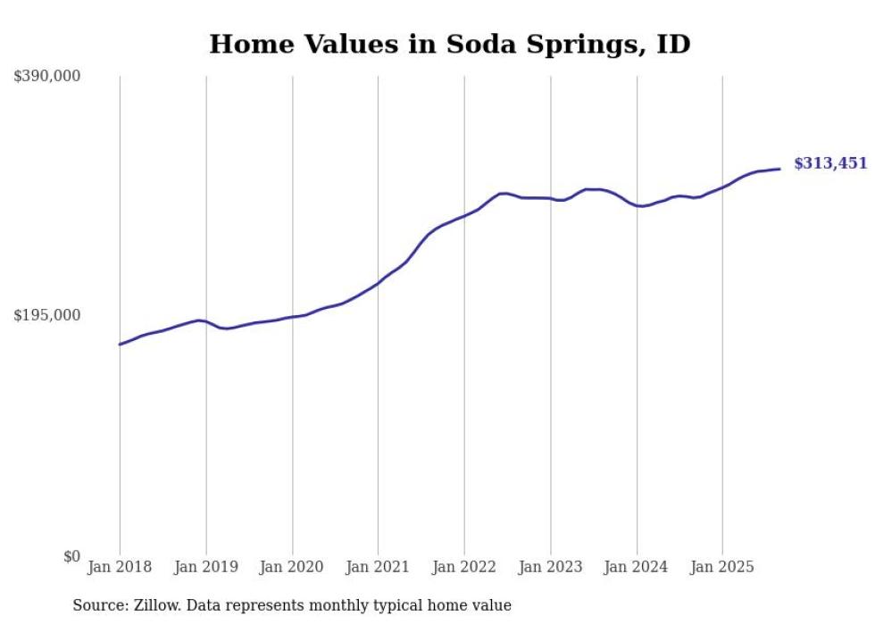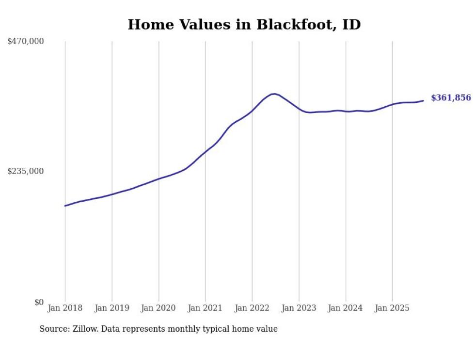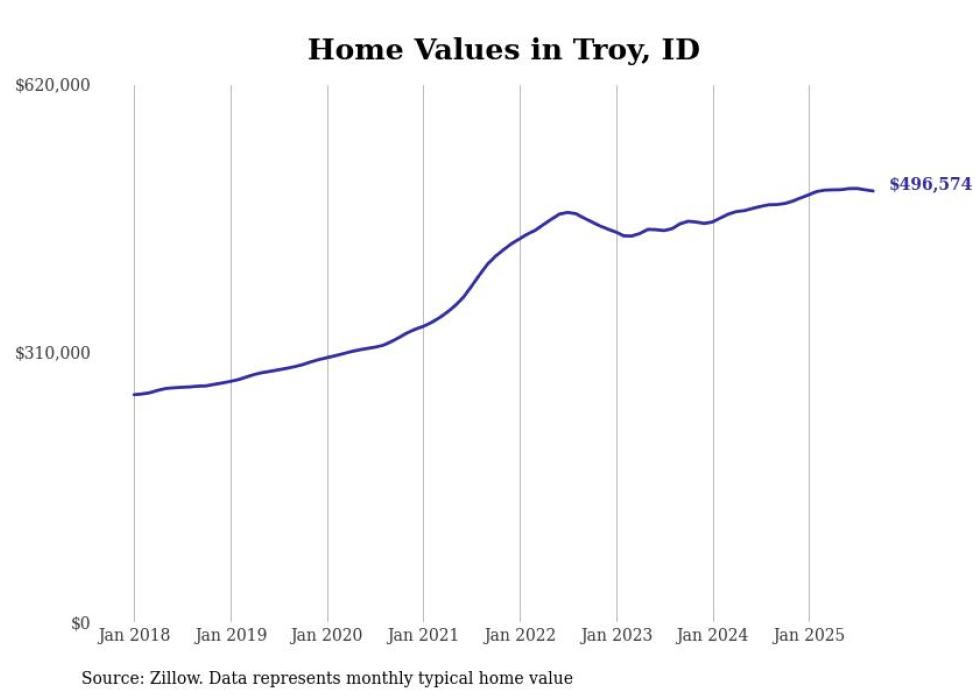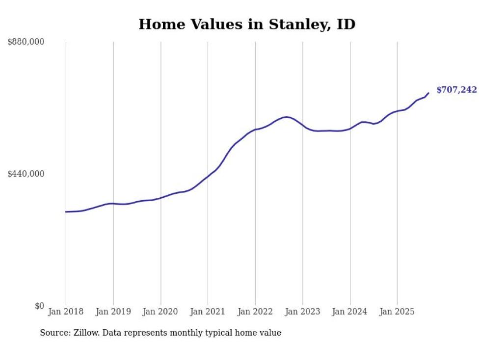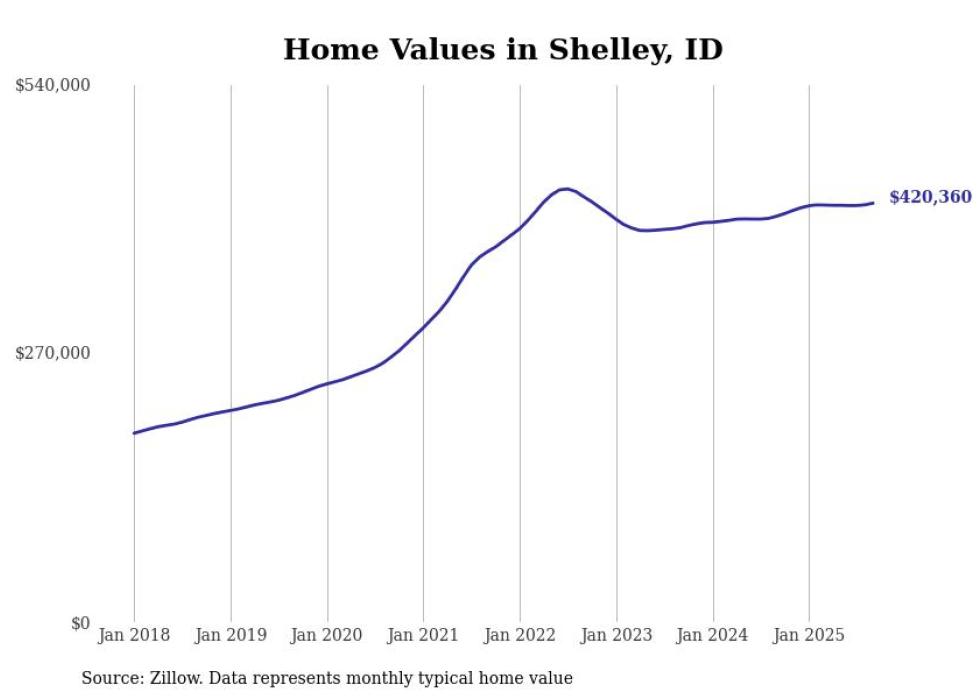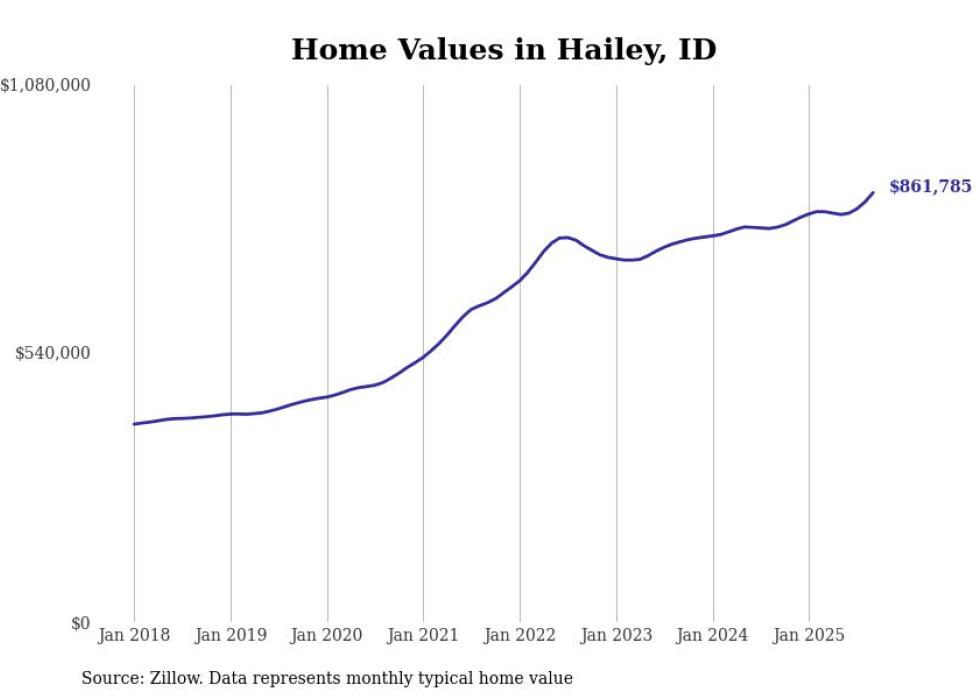 Stacker compiled a list of cities with the fastest-growing home prices in Idaho using data from Zillow. Cities are ranked by the dollar change in the Zillow Home Values Index for all homes from the 12 months ending September 2025. The charts in this story were created automatically using Matplotlib. Data was available for 50 cities and towns in Idaho.