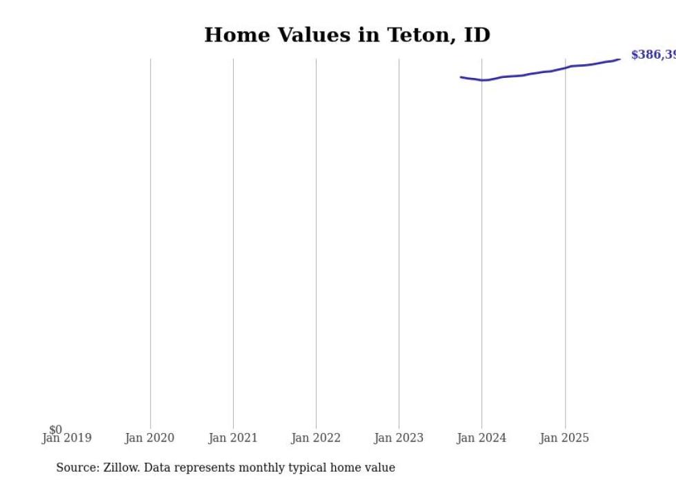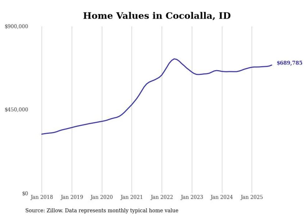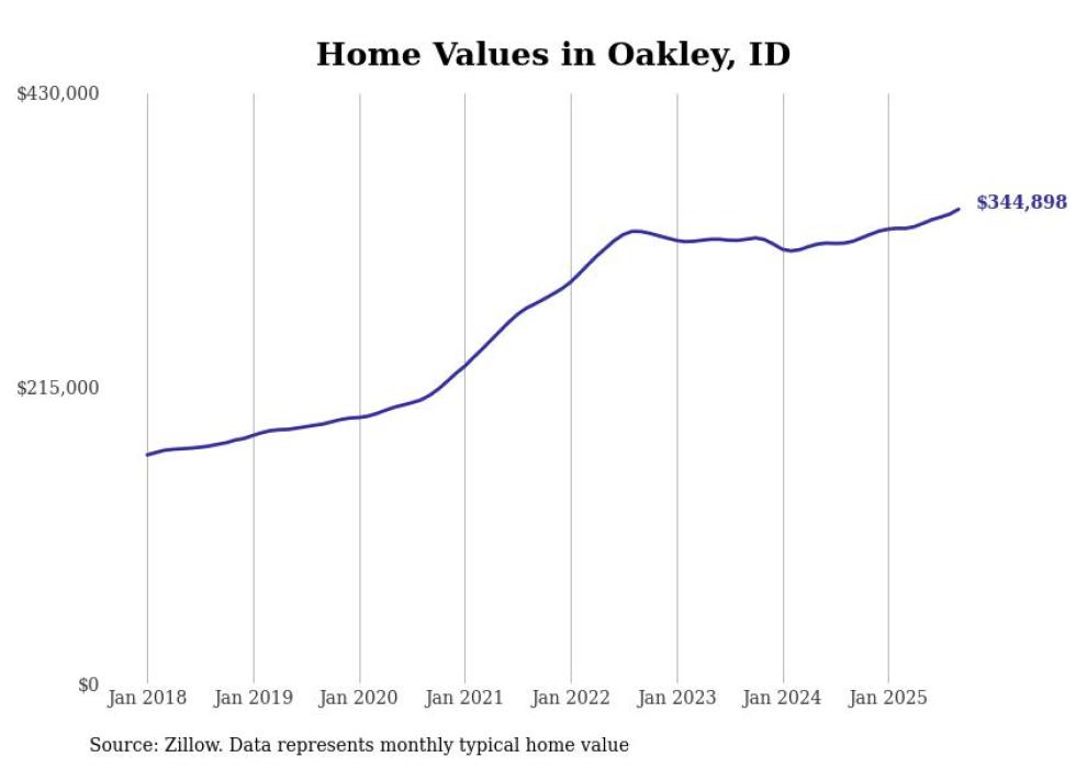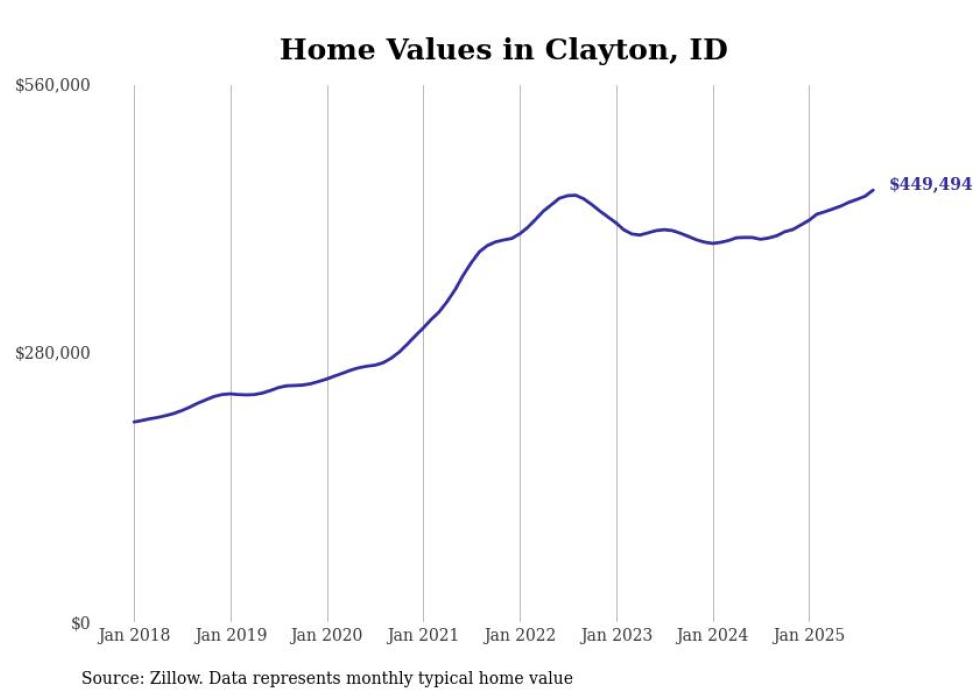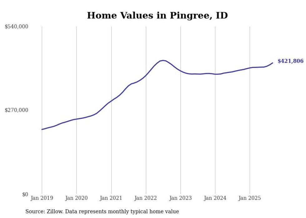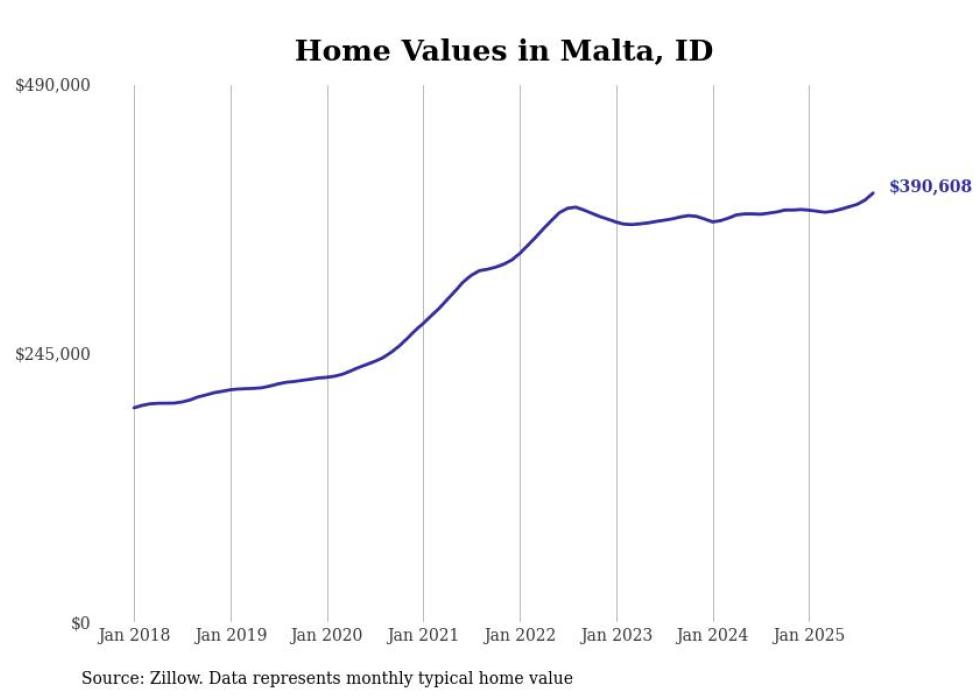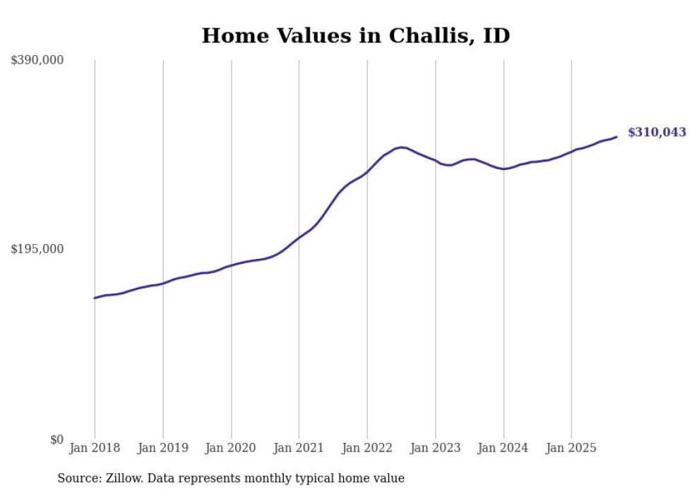 Stacker compiled a list of cities with the fastest-growing home prices in Idaho using data from Zillow. Cities are ranked by the dollar change in the Zillow Home Values Index for all homes from the 12 months ending September 2025. The charts in this story were created automatically using Matplotlib. Data was available for 50 cities and towns in Idaho.