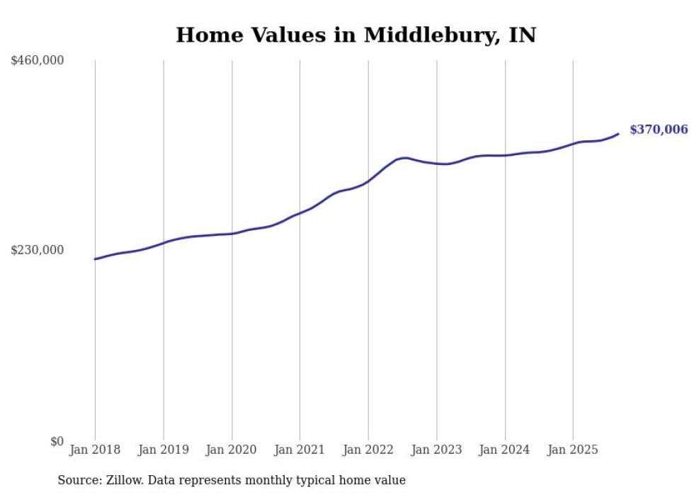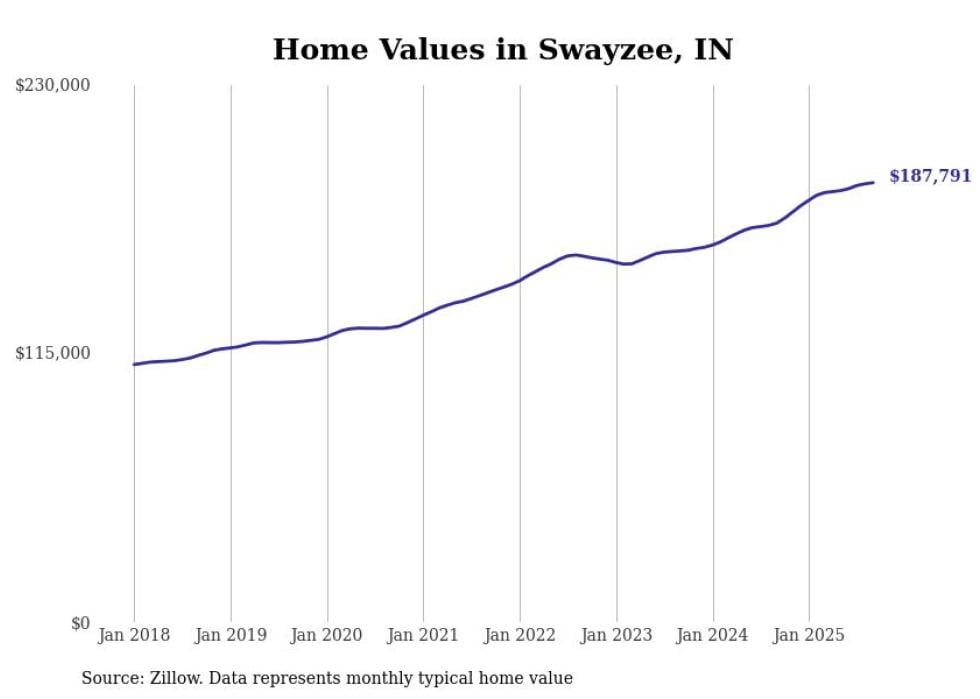 Stacker compiled a list of cities with the fastest-growing home prices in Indiana using data from Zillow. Cities are ranked by the dollar change in the Zillow Home Values Index for all homes from the 12 months ending September 2025. The charts in this story were created automatically using Matplotlib. Data was available for 50 cities and towns in Indiana.