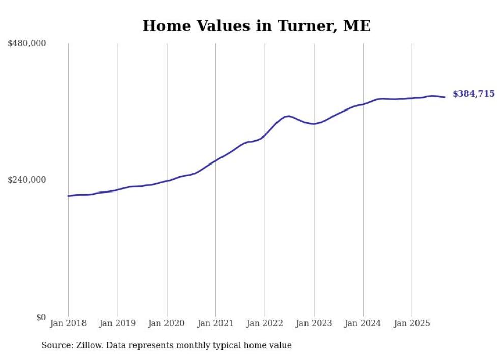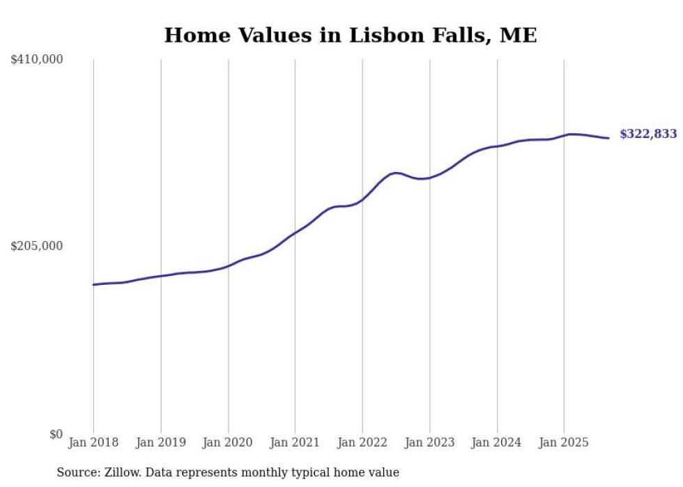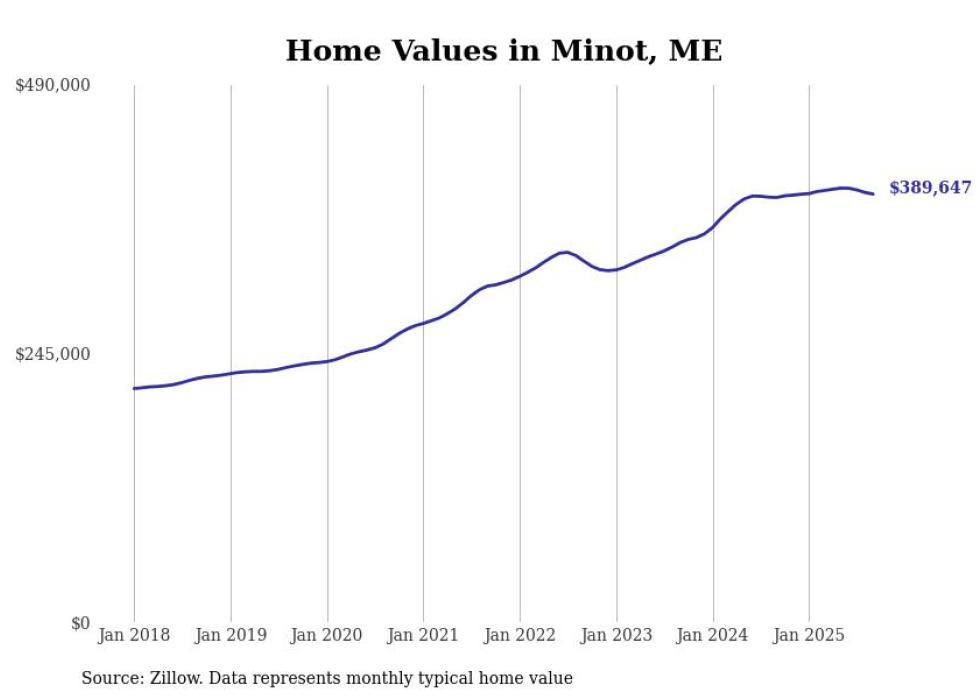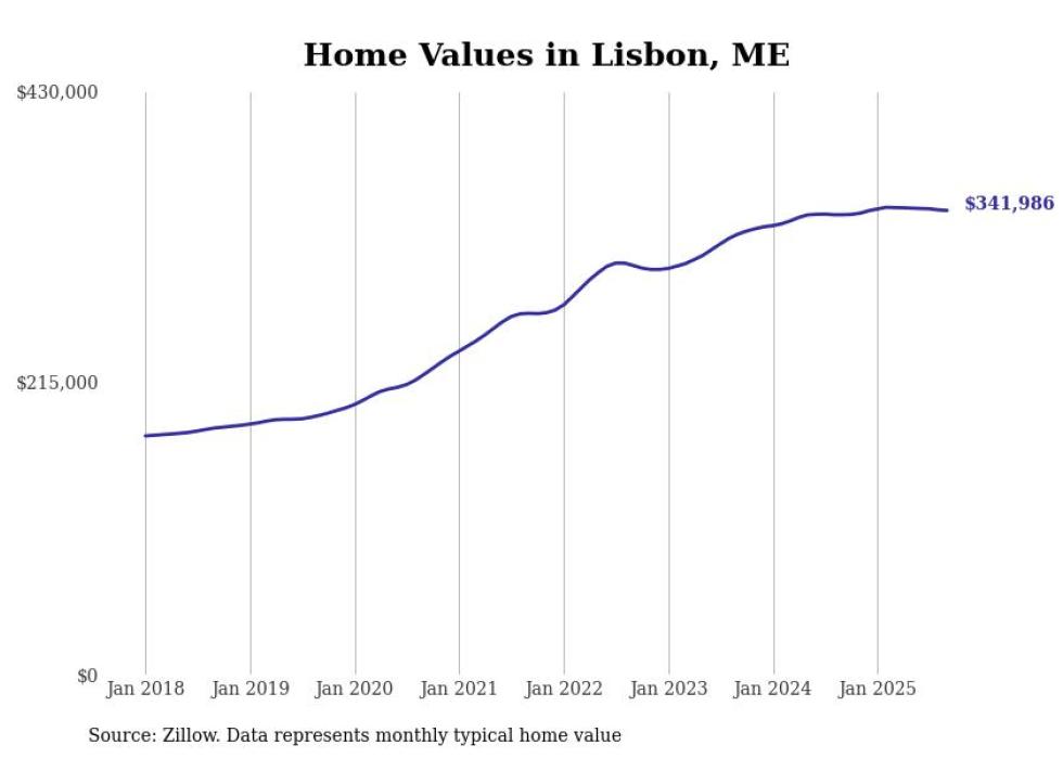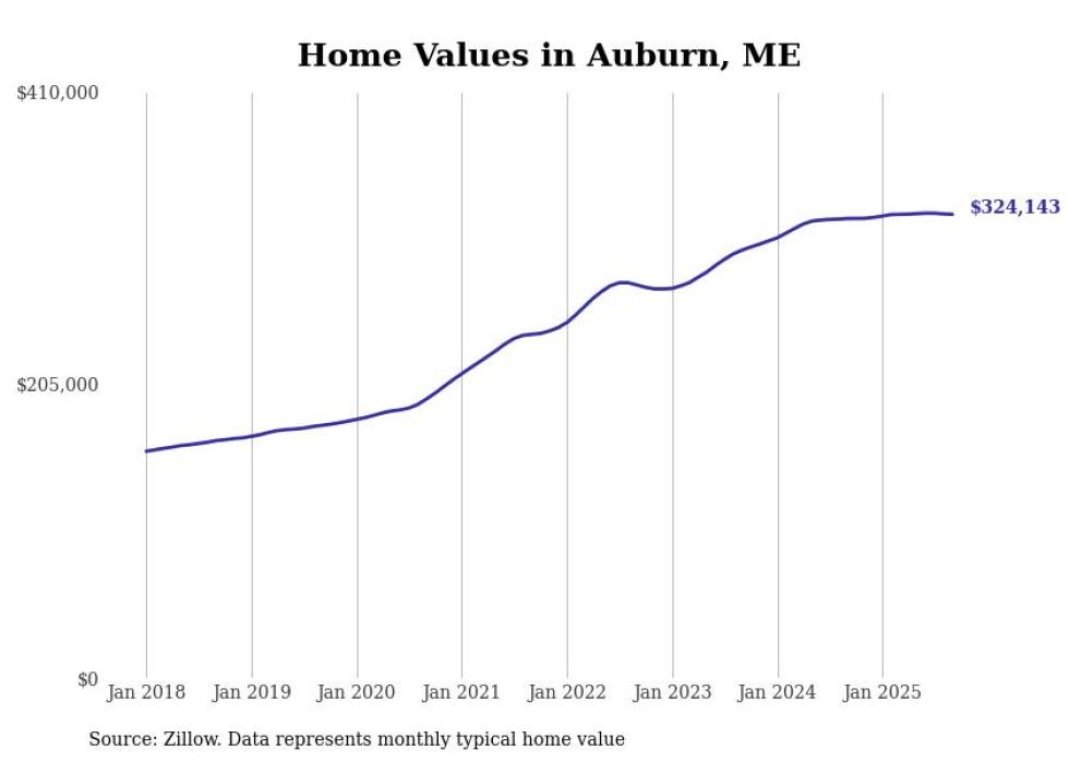Stacker compiled a list of cities with the most expensive homes in the Lewiston, Maine metro area using data from Zillow. Charts show the monthly typical home value since January 2018. All 15 cities and towns with data available were included in the list.