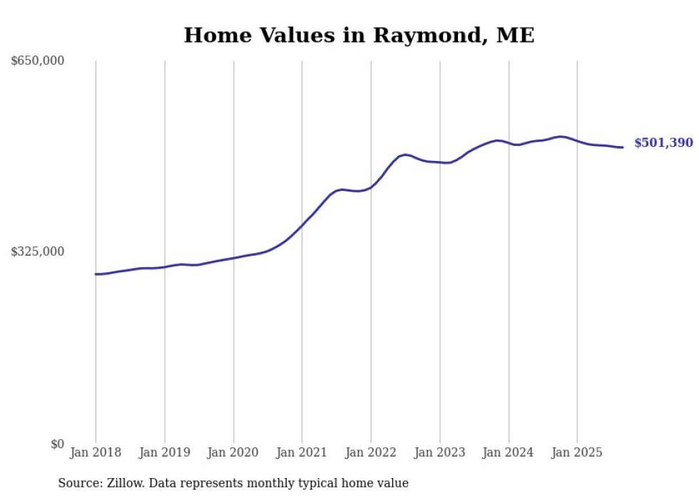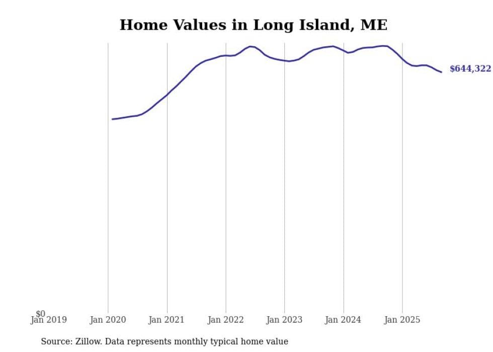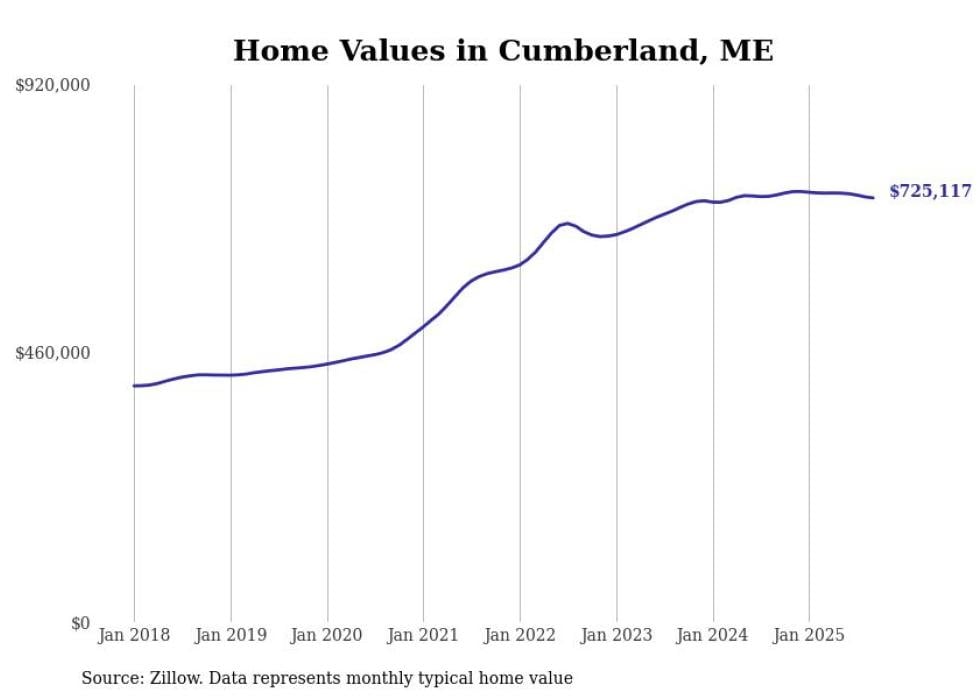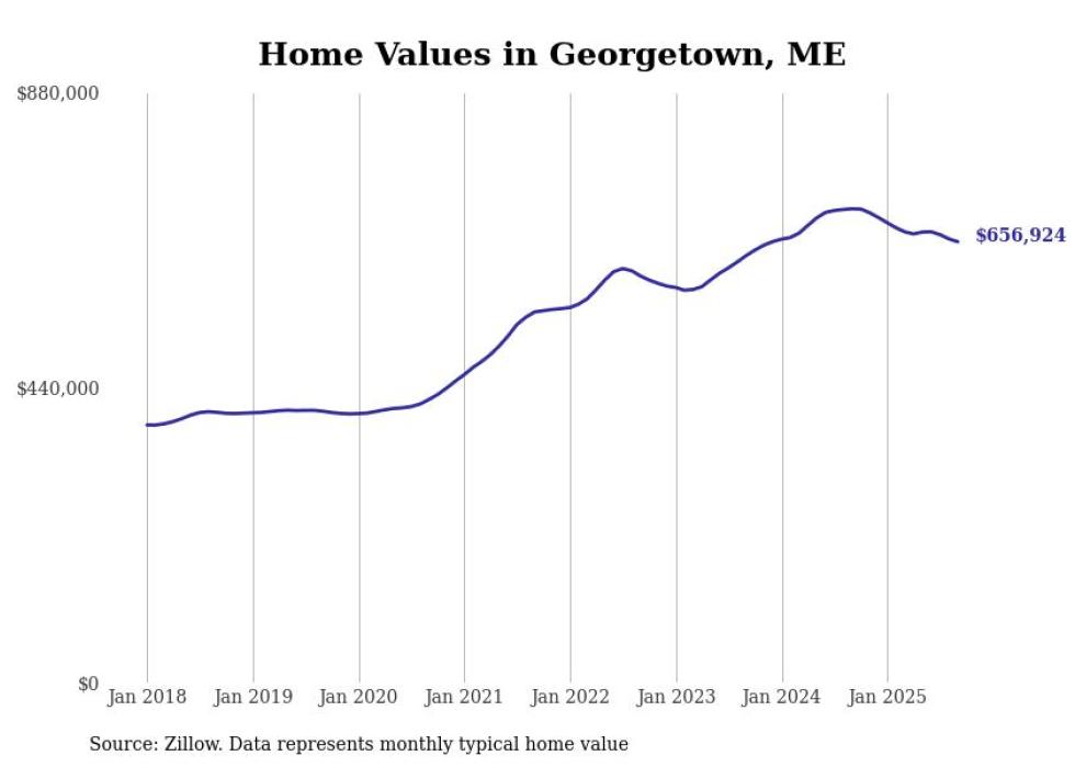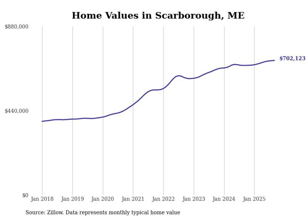 Stacker compiled a list of cities with the most expensive homes in the Portland, Maine metro area using data from Zillow. Charts show the monthly typical home value since January 2018. Data was available for 65 cities and towns.
