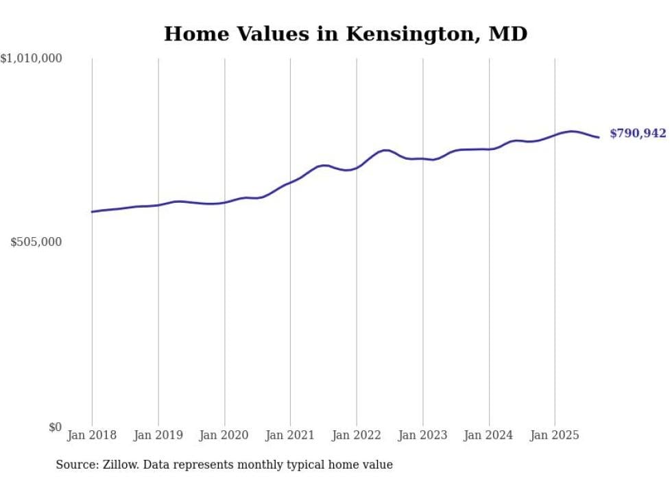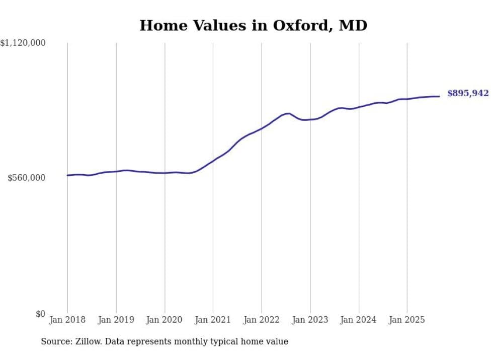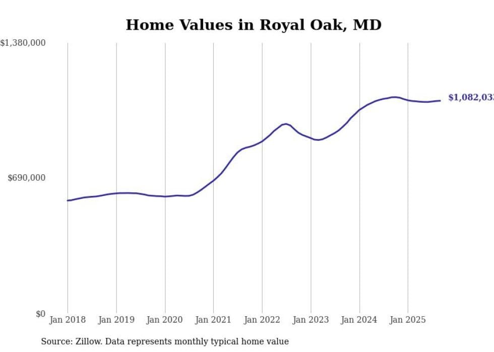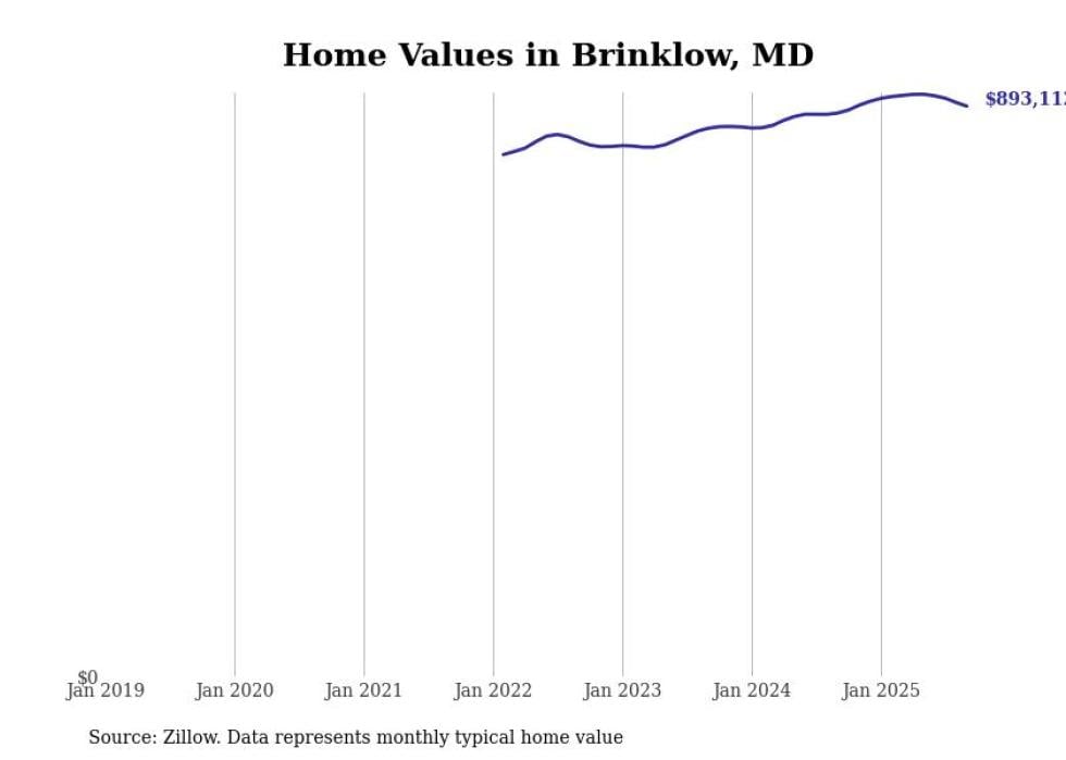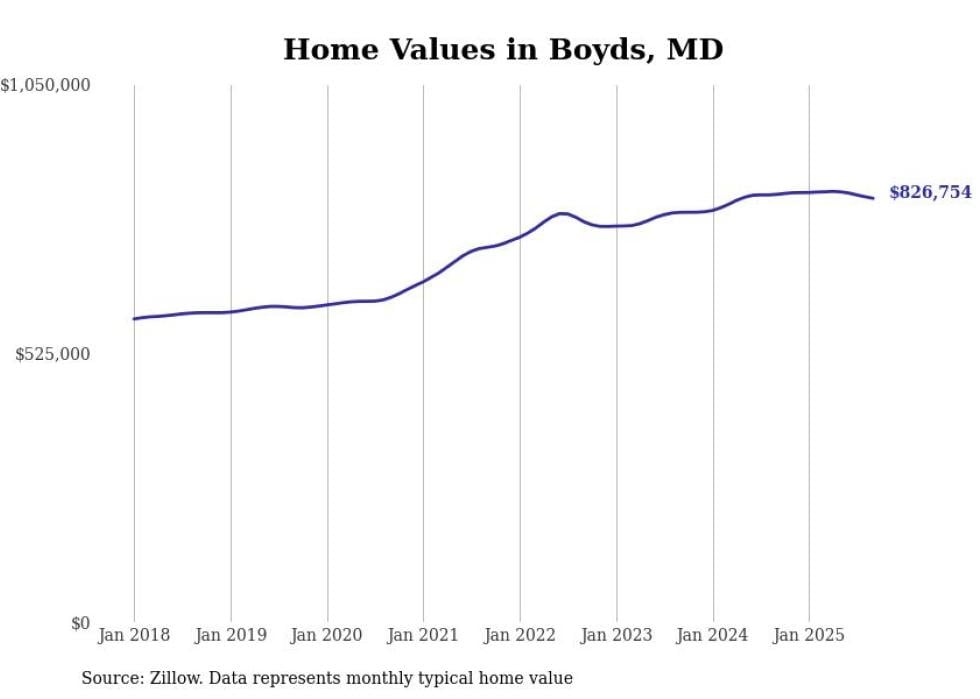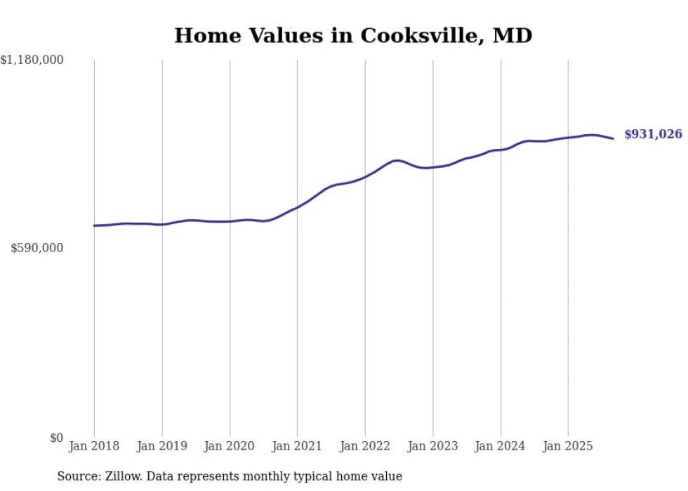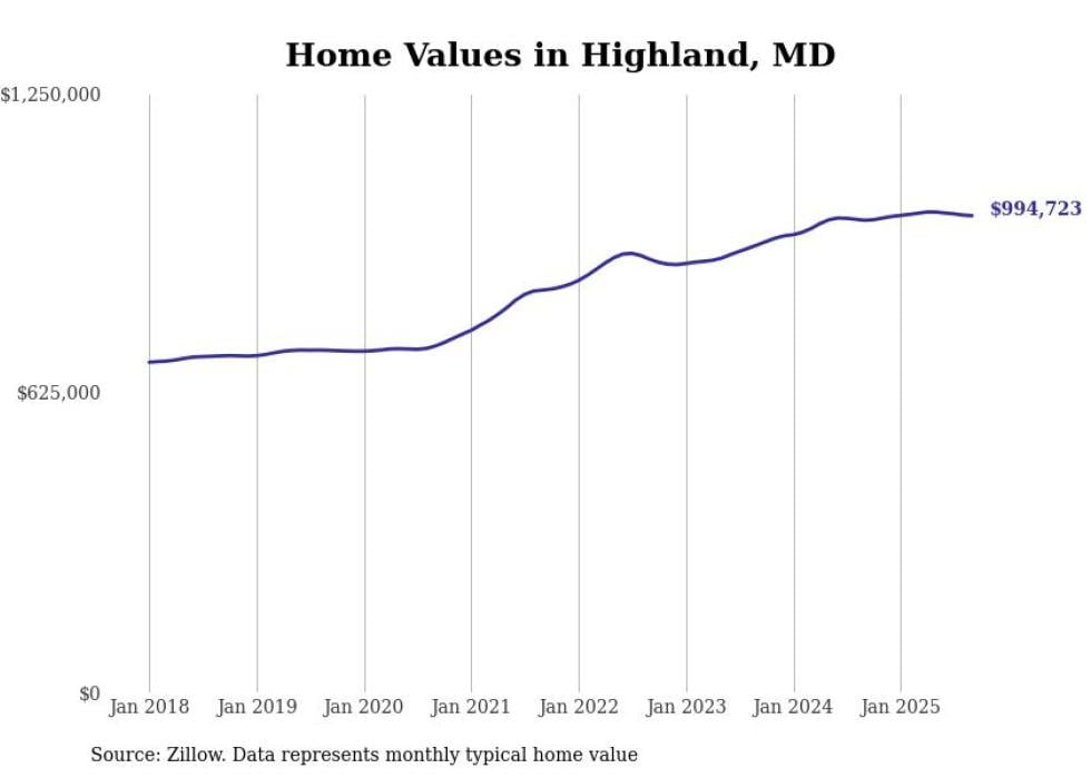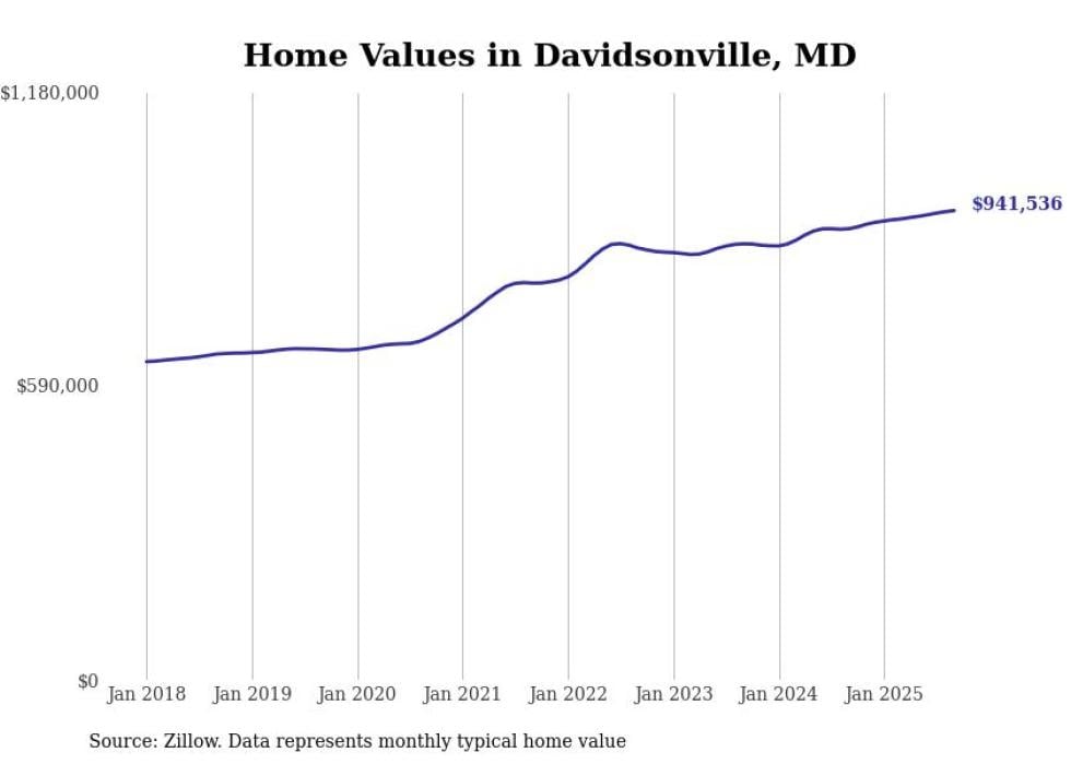 Stacker compiled a list of cities with the most expensive homes in Maryland using data from Zillow. Cities are ranked by the Zillow Home Values Index for all homes as of September 2025. The charts in this story were created automatically using Matplotlib.