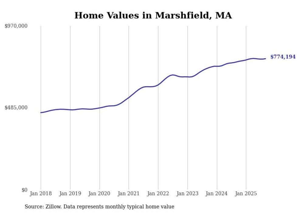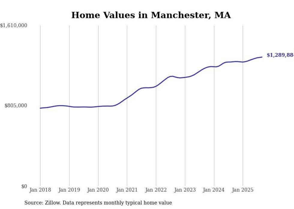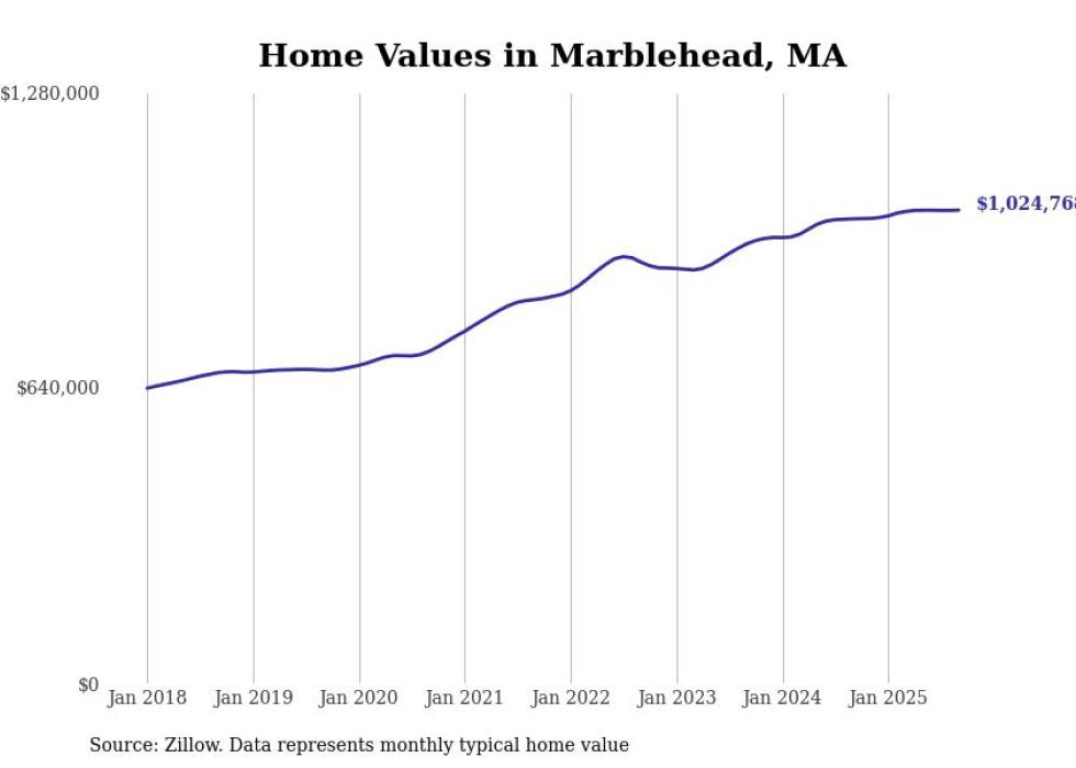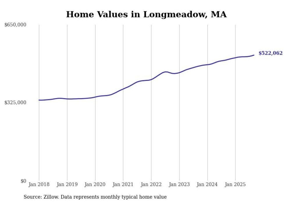 Stacker compiled a list of cities with the fastest-growing home prices in Massachusetts using data from Zillow. Cities are ranked by the dollar change in the Zillow Home Values Index for all homes from the 12 months ending September 2025. The charts in this story were created automatically using Matplotlib. Data was available for 50 cities and towns in Massachusetts.