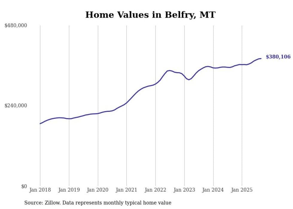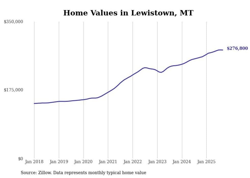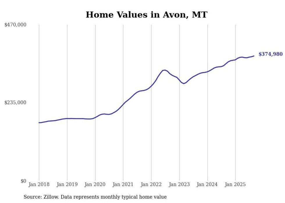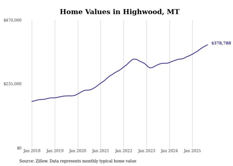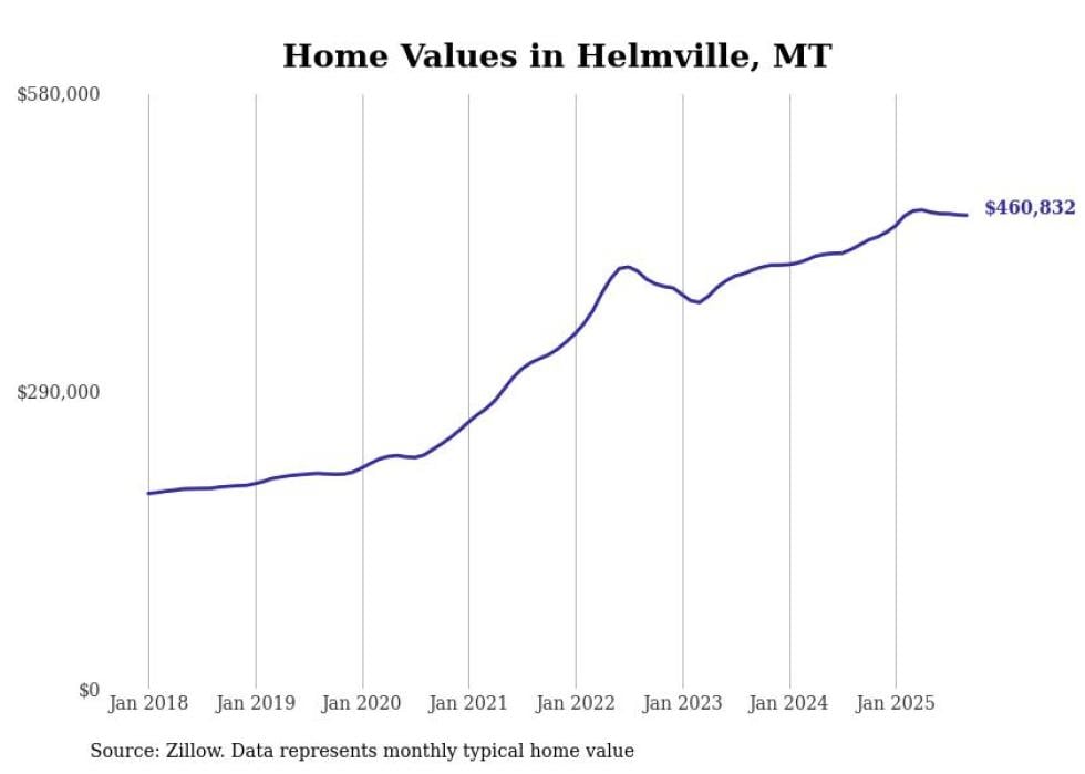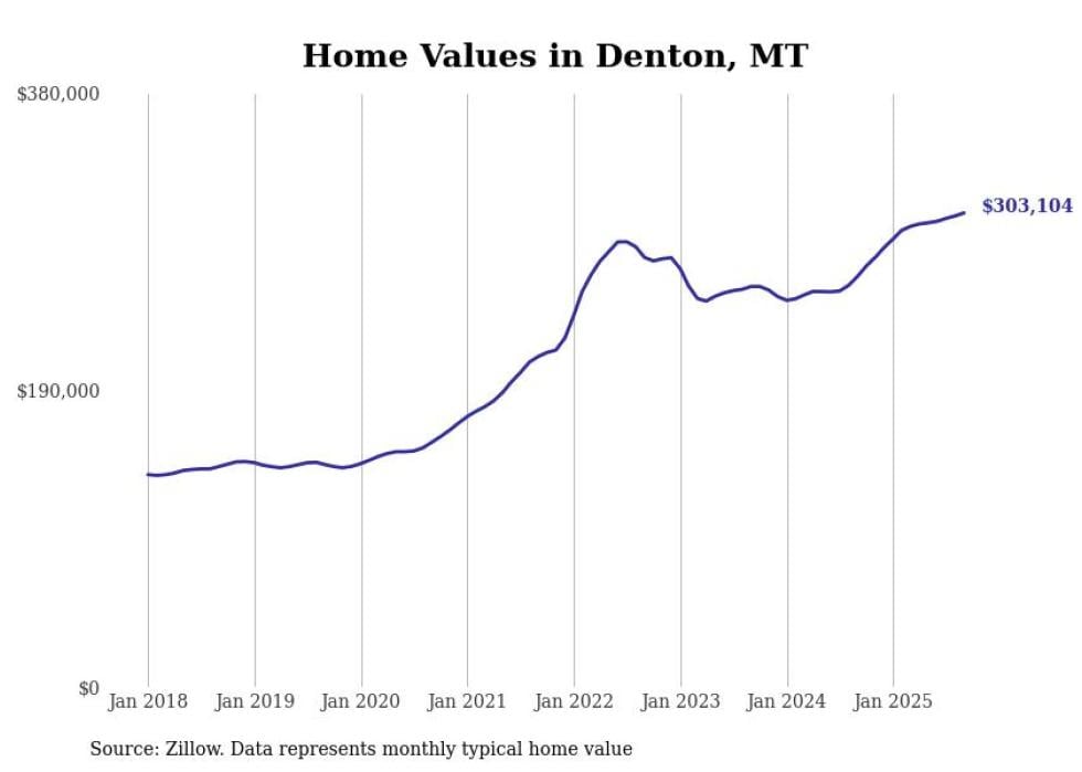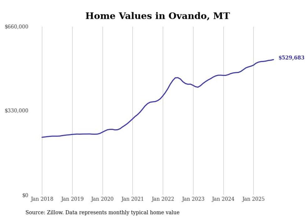 Stacker compiled a list of cities with the fastest-growing home prices in Montana using data from Zillow. Cities are ranked by the dollar change in the Zillow Home Values Index for all homes from the 12 months ending September 2025. The charts in this story were created automatically using Matplotlib. Data was available for 50 cities and towns in Montana.