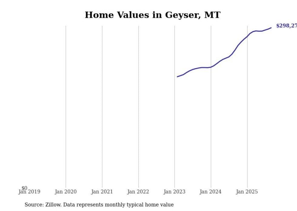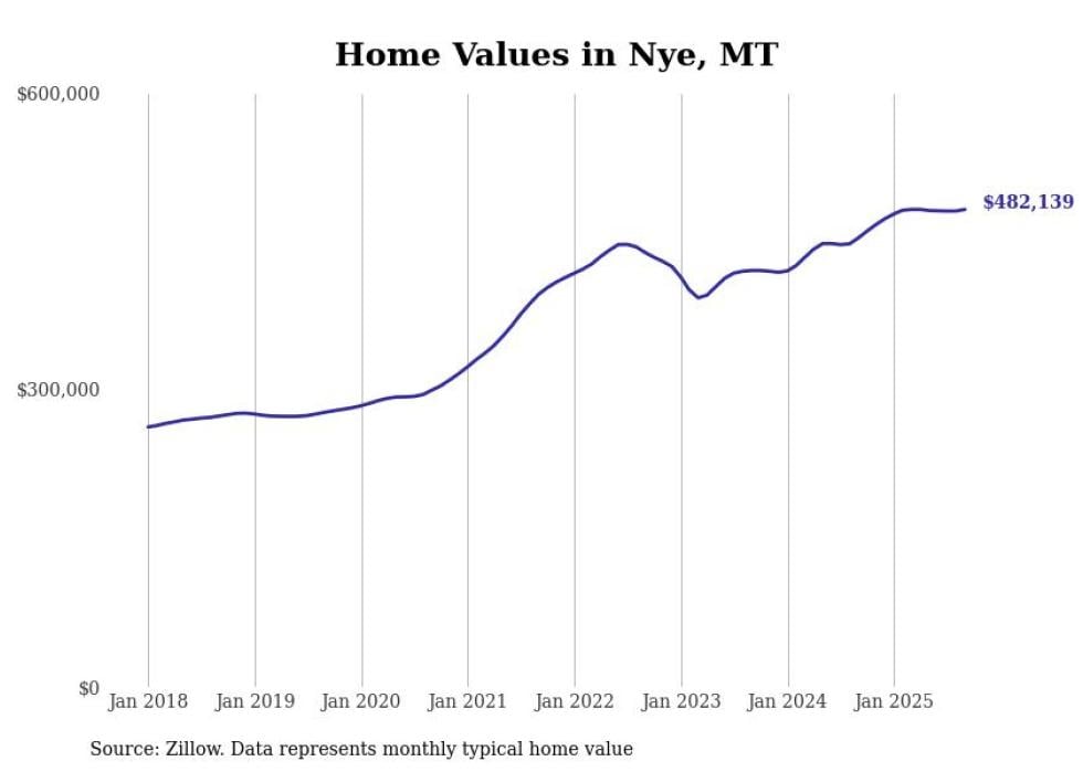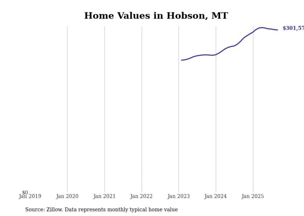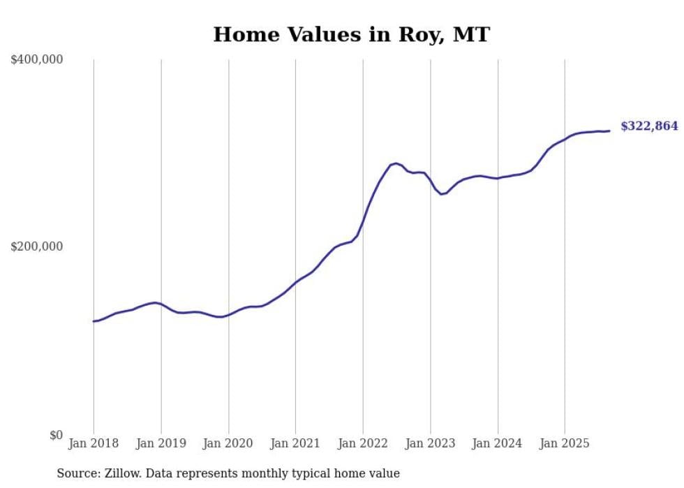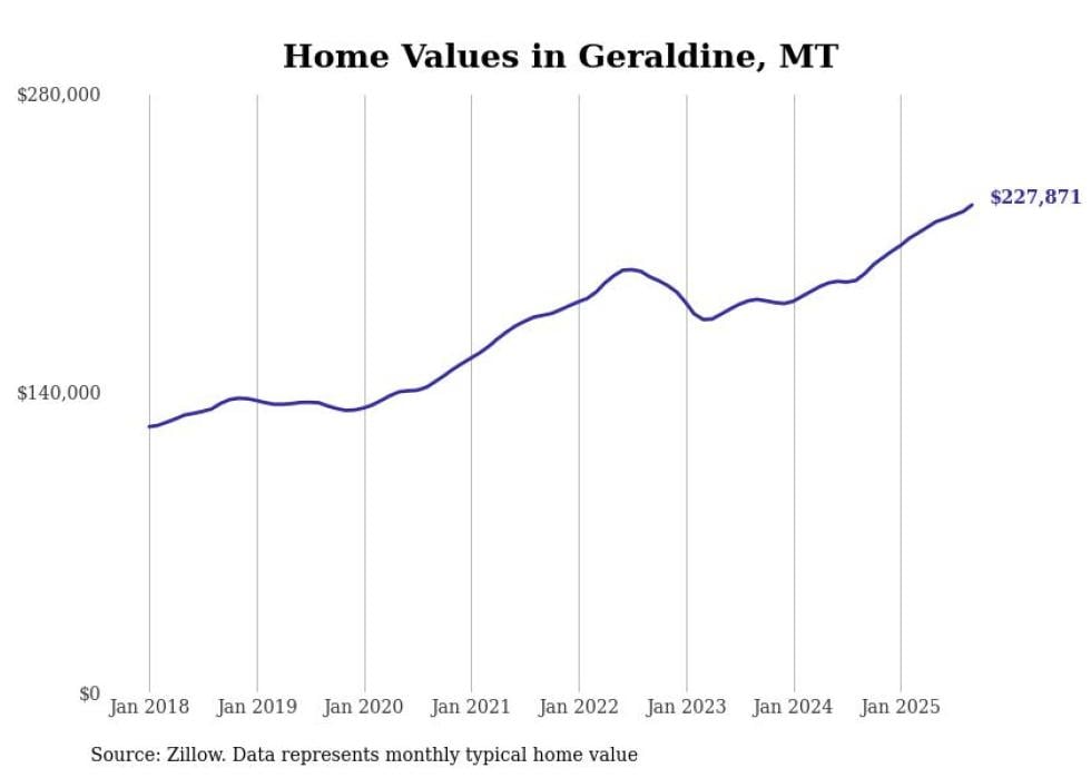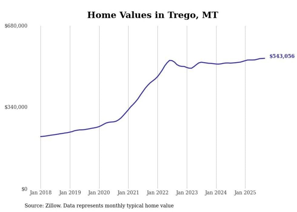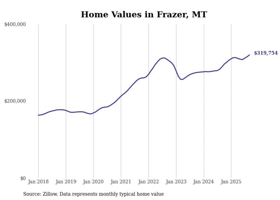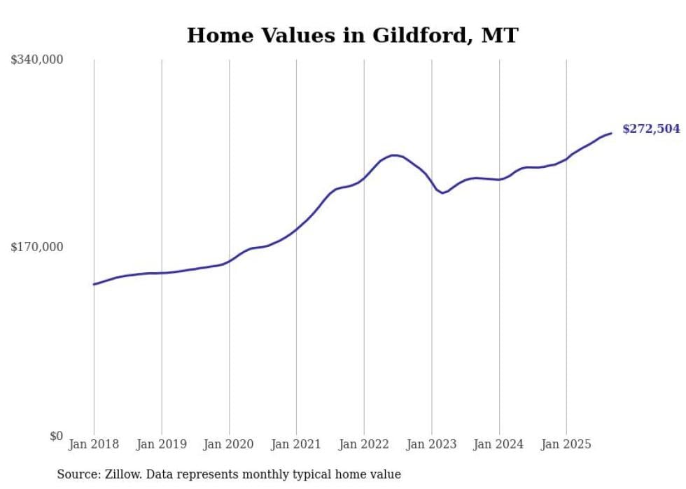 Stacker compiled a list of cities with the fastest-growing home prices in Montana using data from Zillow. Cities are ranked by the dollar change in the Zillow Home Values Index for all homes from the 12 months ending September 2025. The charts in this story were created automatically using Matplotlib. Data was available for 50 cities and towns in Montana.