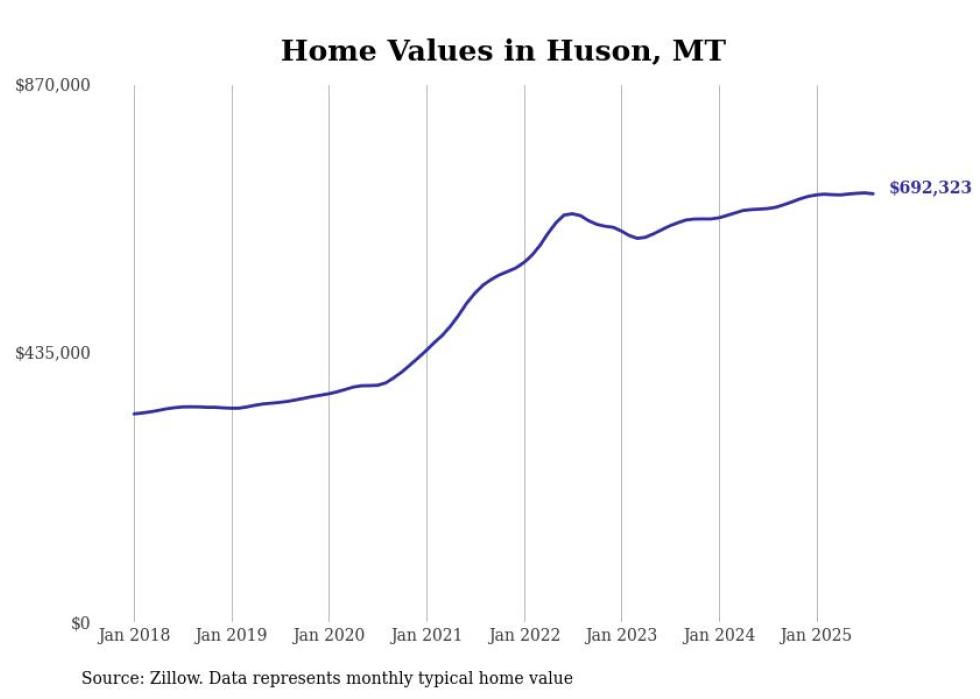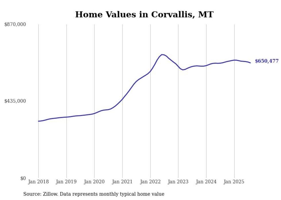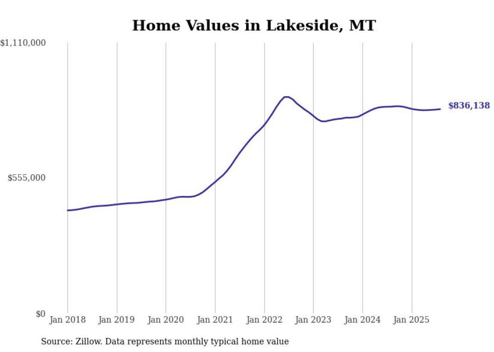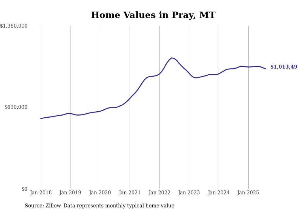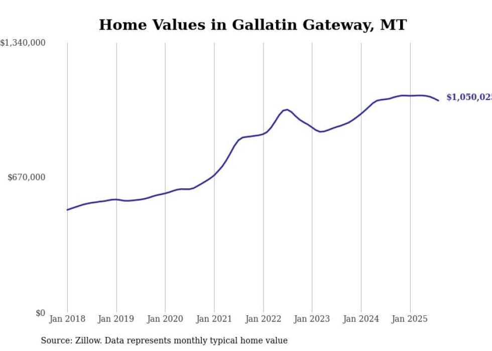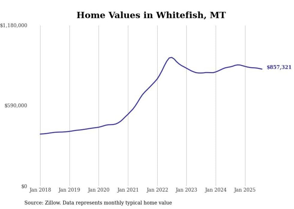 Stacker compiled a list of cities with the most expensive homes in Montana using data from Zillow. Cities are ranked by the Zillow Home Values Index for all homes as of August 2025. The charts in this story were created automatically using Matplotlib.