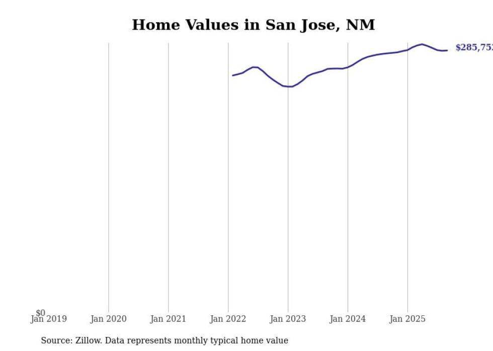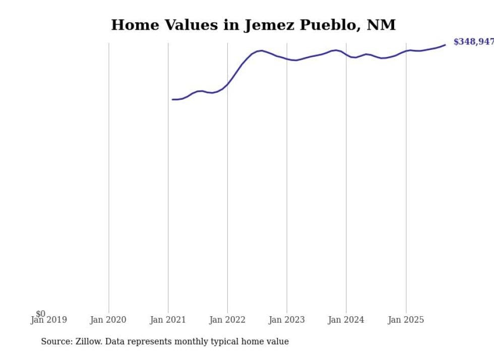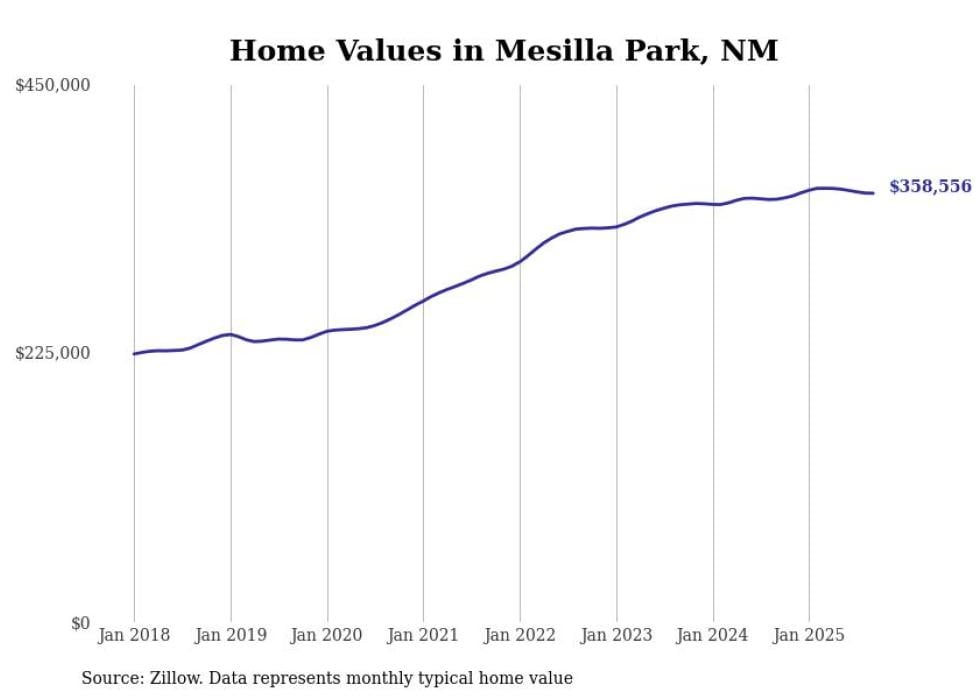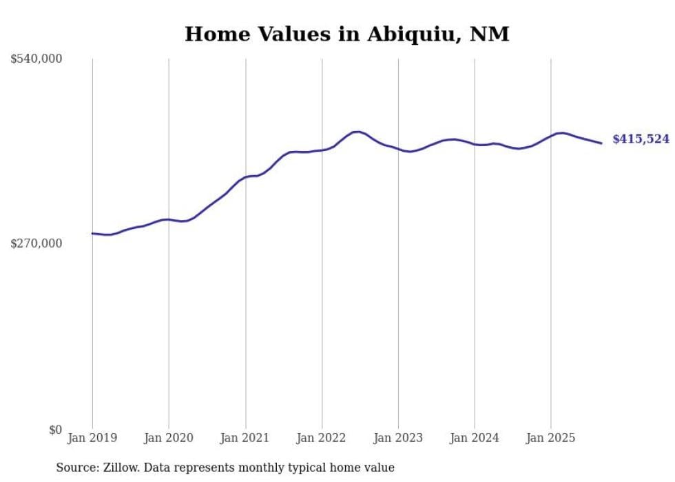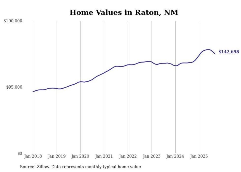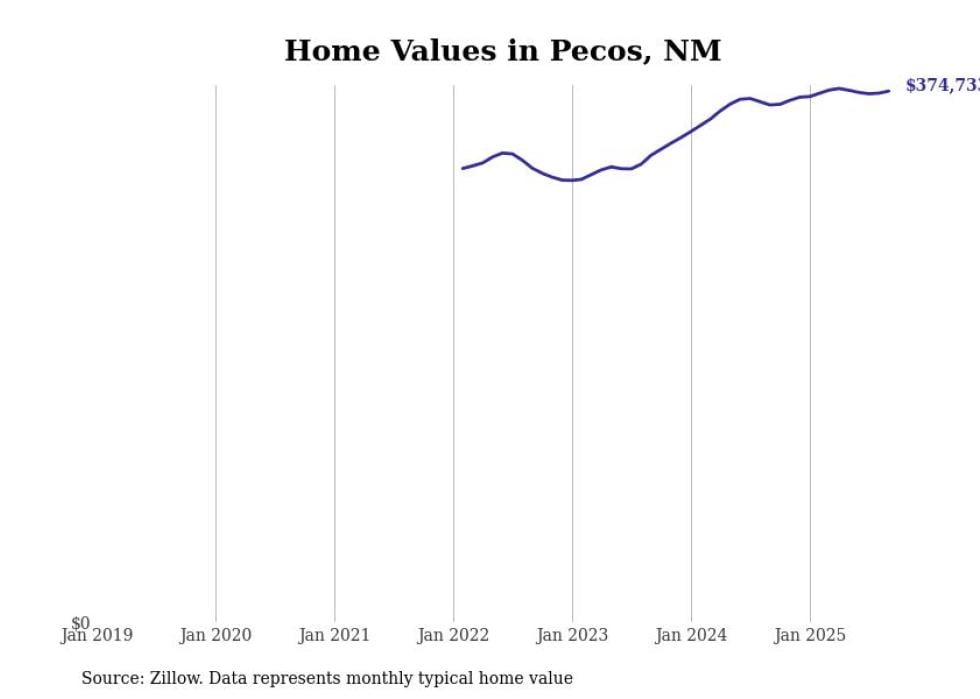 Stacker compiled a list of cities with the fastest-growing home prices in New Mexico using data from Zillow. Cities are ranked by the dollar change in the Zillow Home Values Index for all homes from the 12 months ending September 2025. The charts in this story were created automatically using Matplotlib. Data was available for 50 cities and towns in New Mexico.