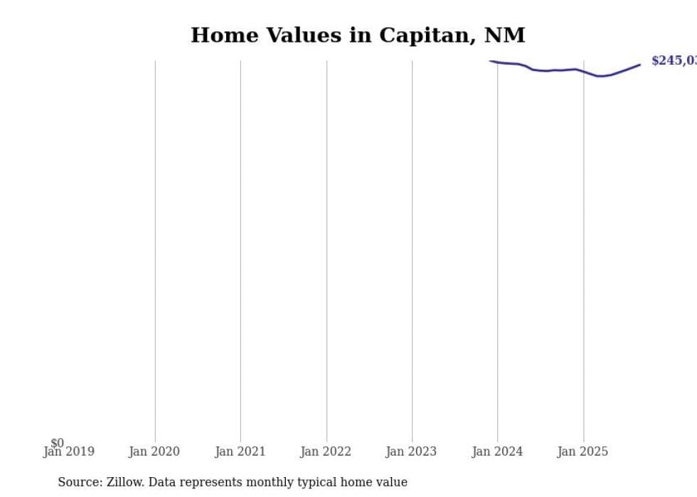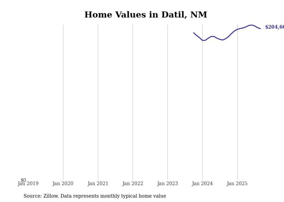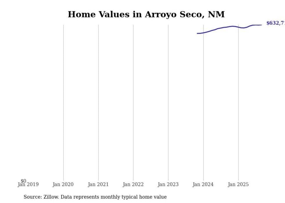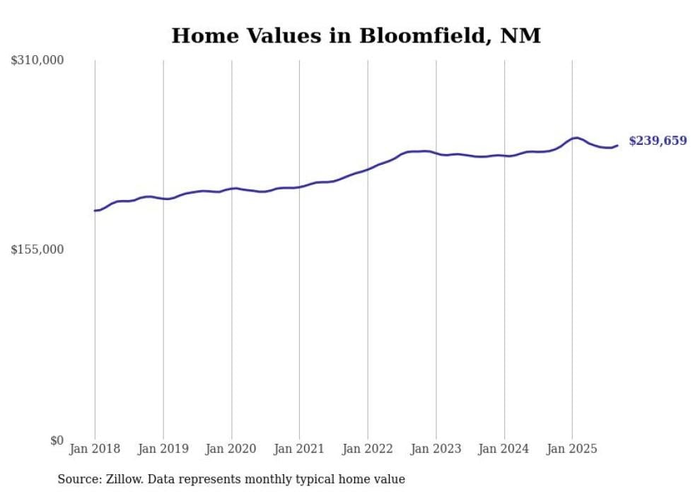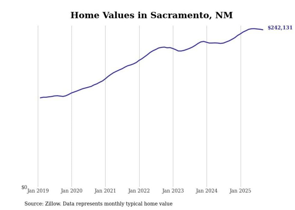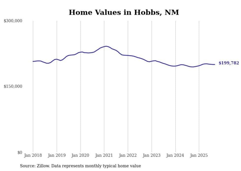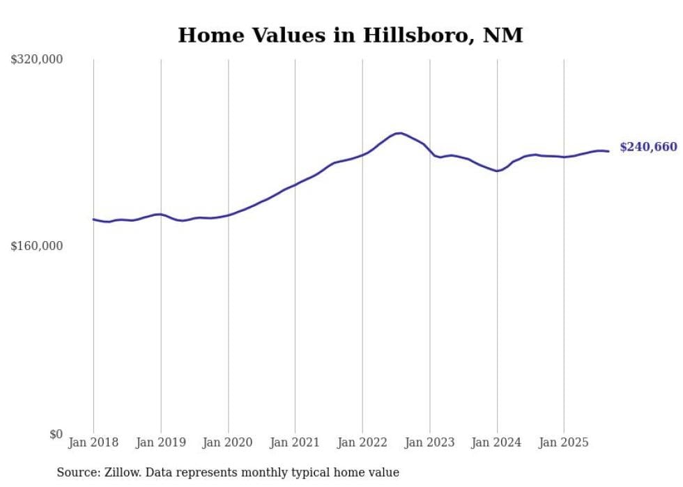 Stacker compiled a list of cities with the fastest-growing home prices in New Mexico using data from Zillow. Cities are ranked by the dollar change in the Zillow Home Values Index for all homes from the 12 months ending September 2025. The charts in this story were created automatically using Matplotlib. Data was available for 50 cities and towns in New Mexico.