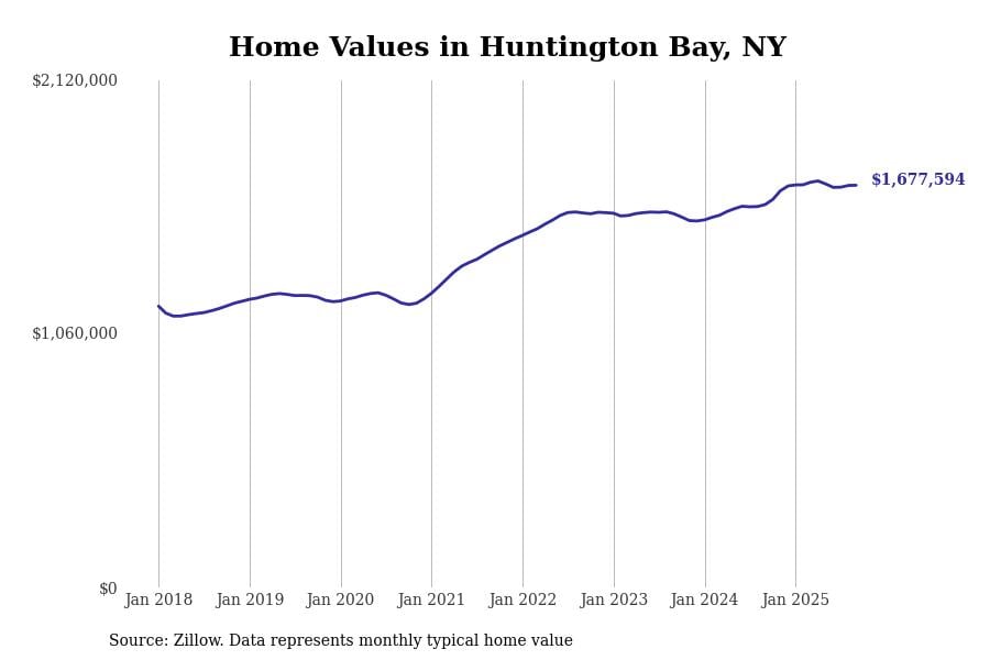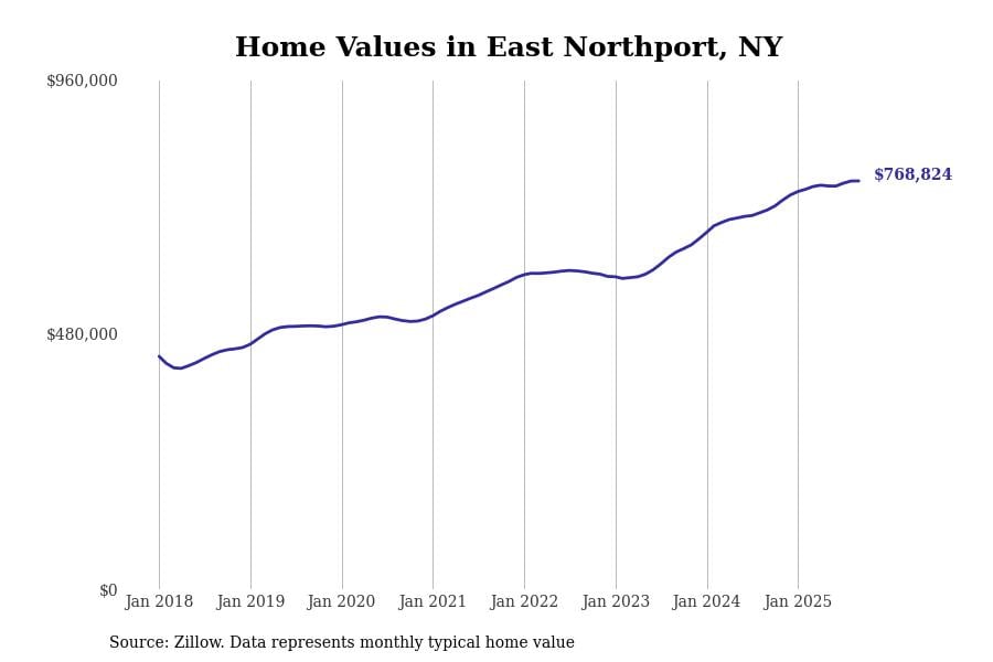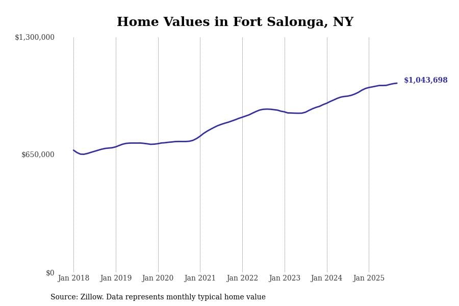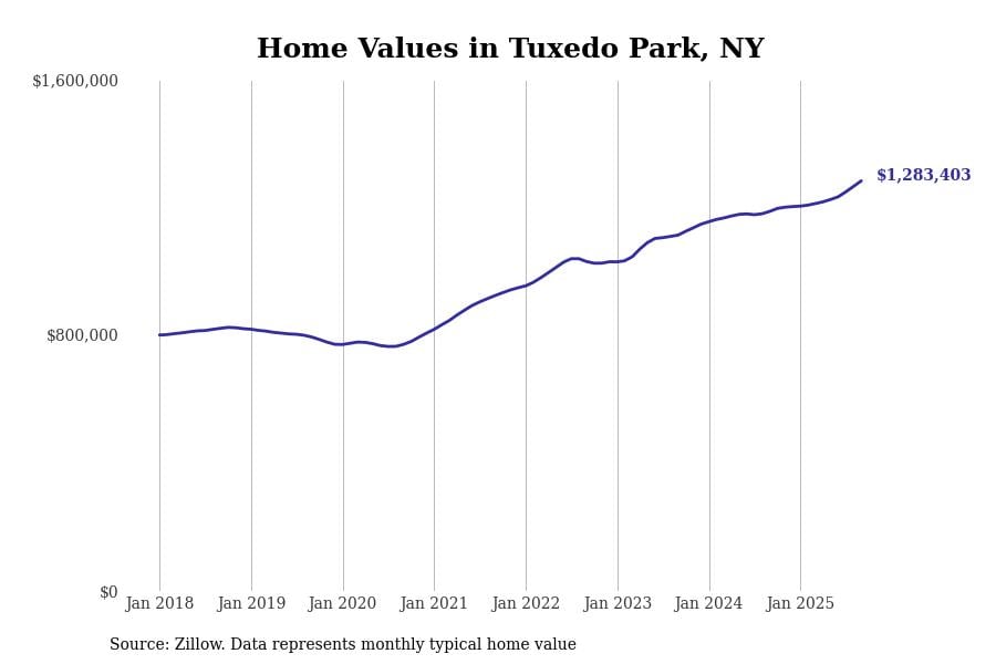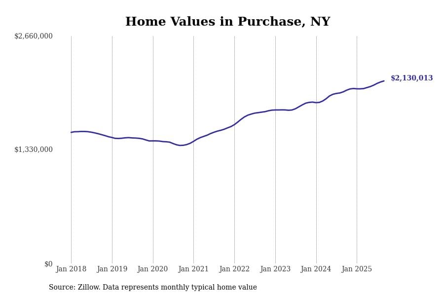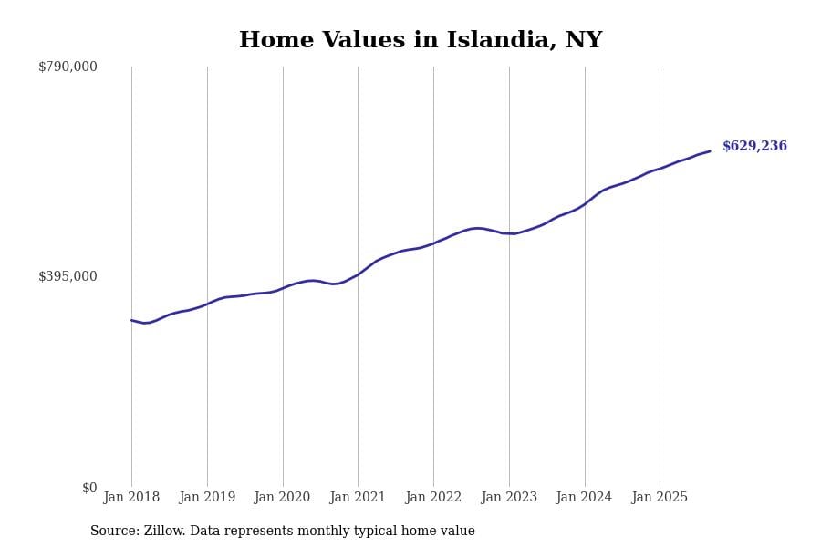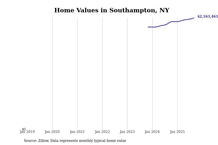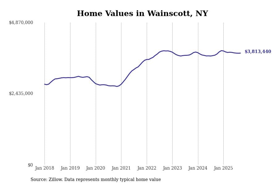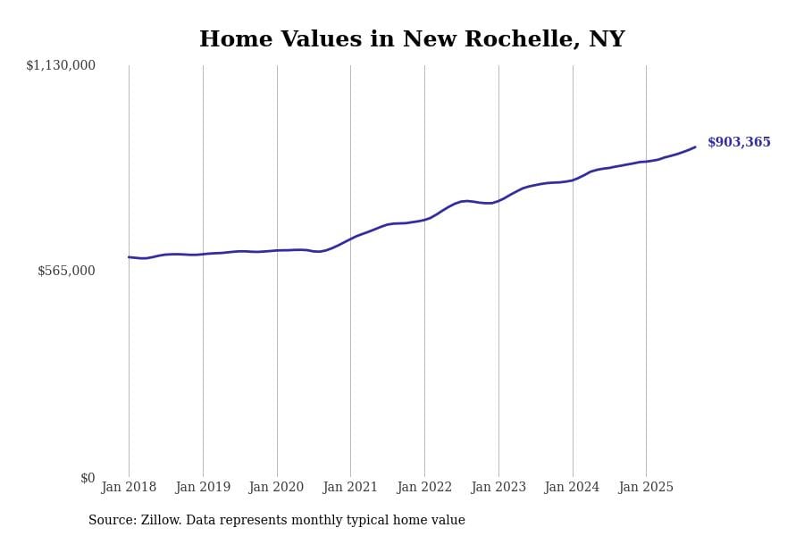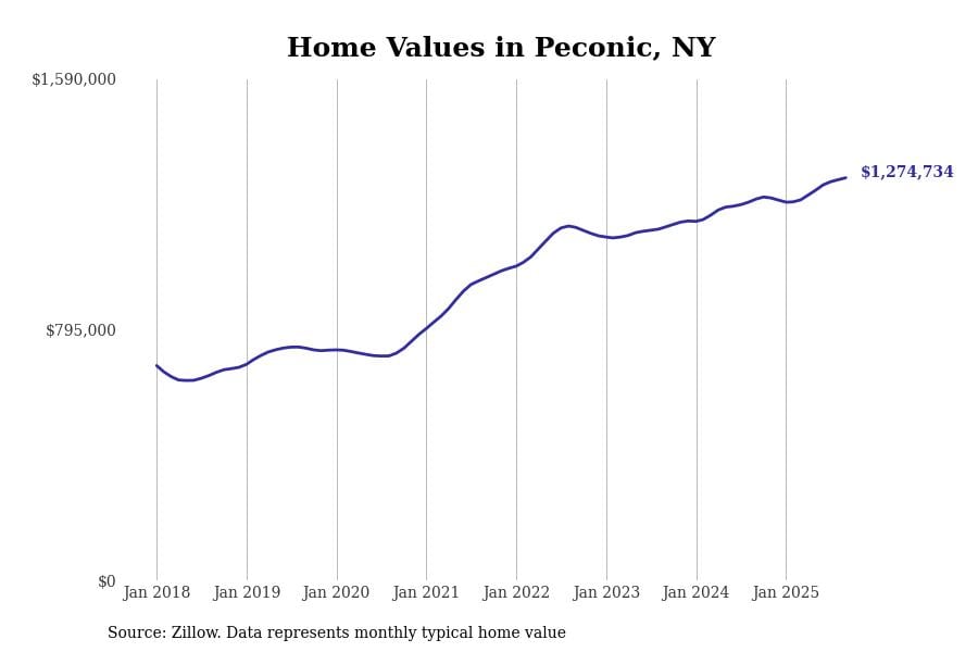 Stacker compiled a list of cities with the fastest-growing home prices in New York using data from Zillow. Cities are ranked by the dollar change in the Zillow Home Values Index for all homes from the 12 months ending September 2025. The charts in this story were created automatically using Matplotlib. Data was available for 50 cities and towns in New York.