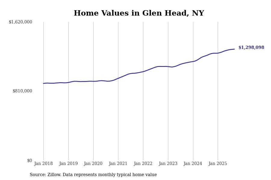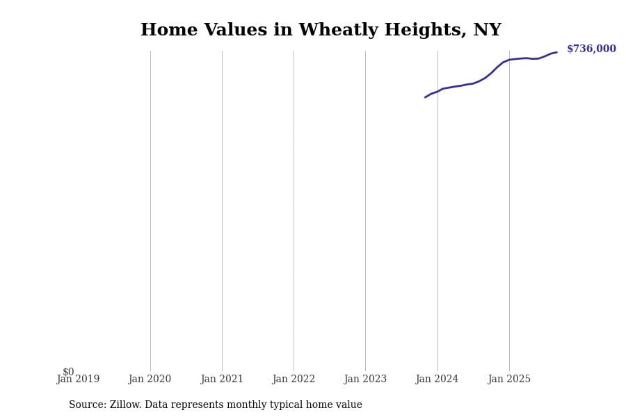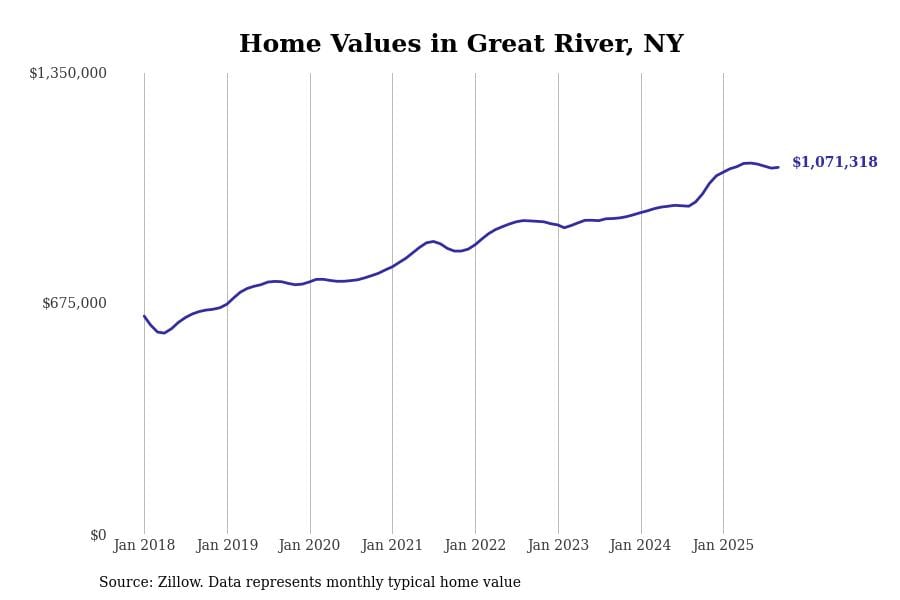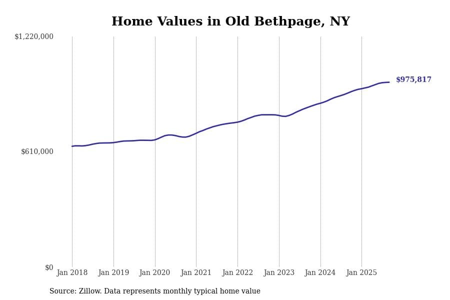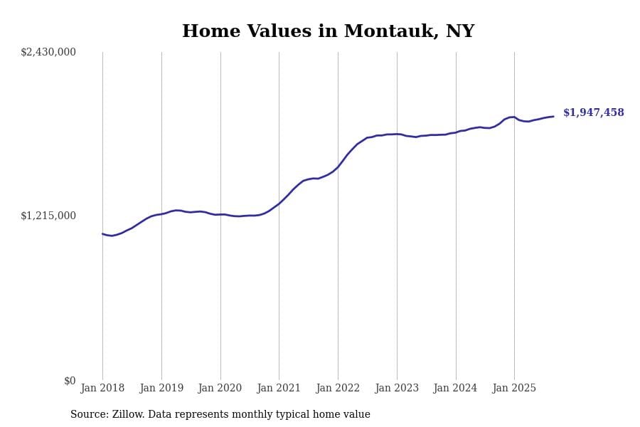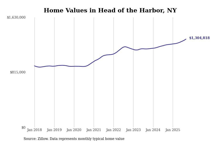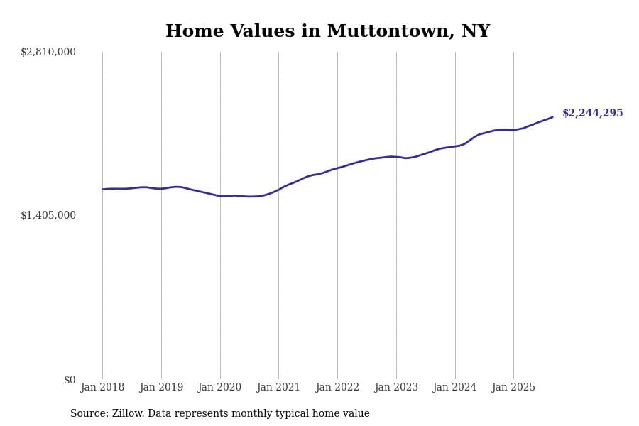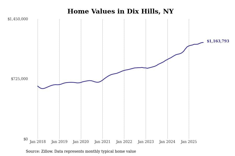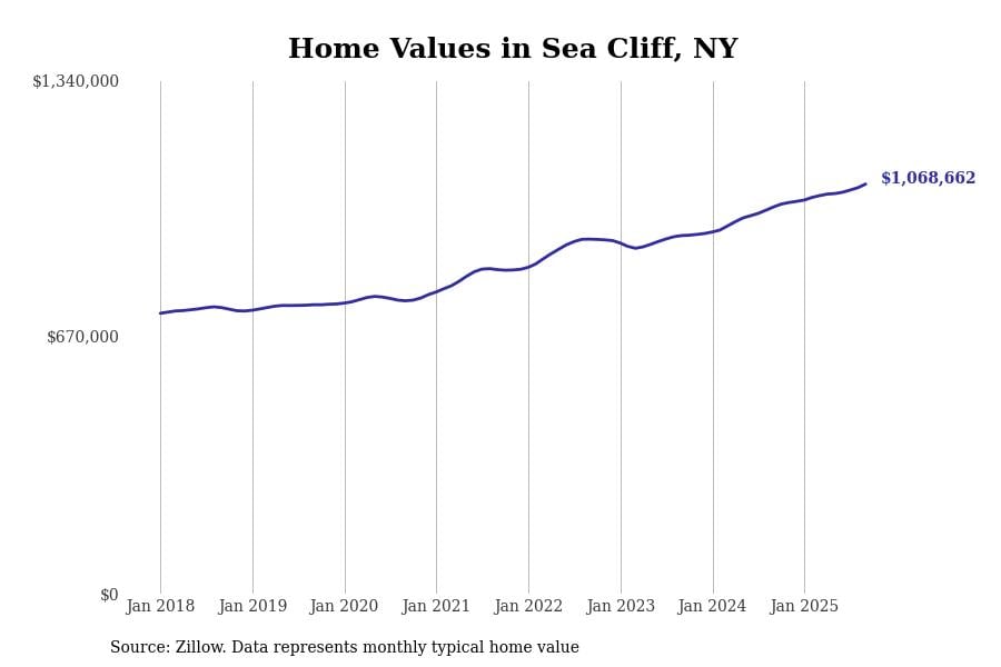 Stacker compiled a list of cities with the fastest-growing home prices in New York using data from Zillow. Cities are ranked by the dollar change in the Zillow Home Values Index for all homes from the 12 months ending September 2025. The charts in this story were created automatically using Matplotlib. Data was available for 50 cities and towns in New York.
