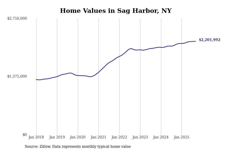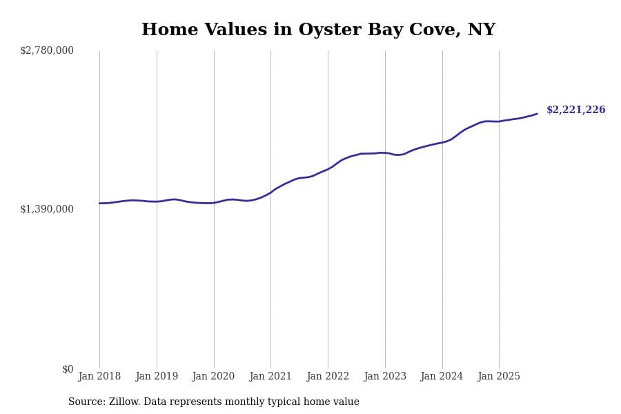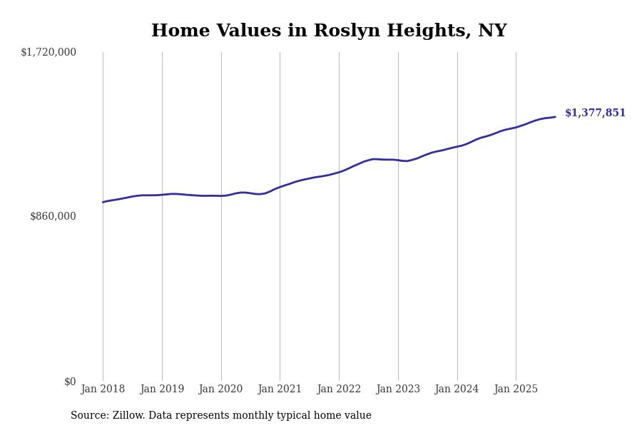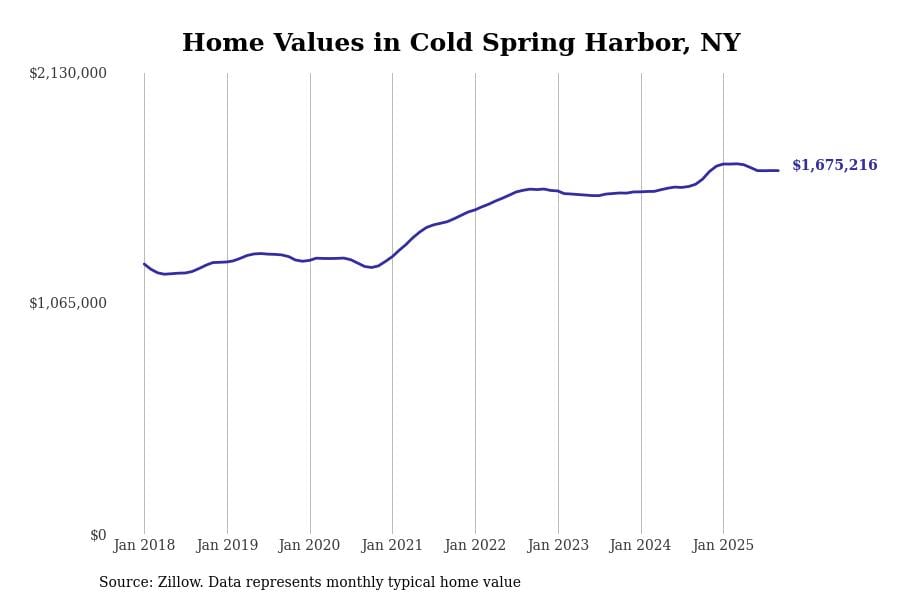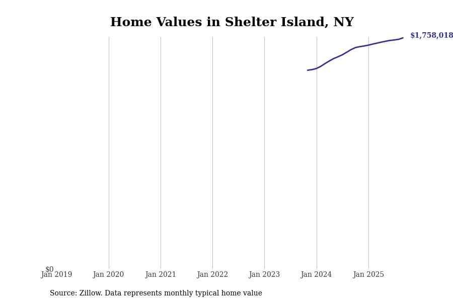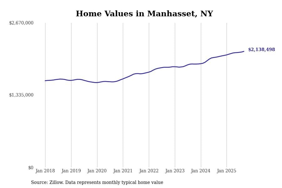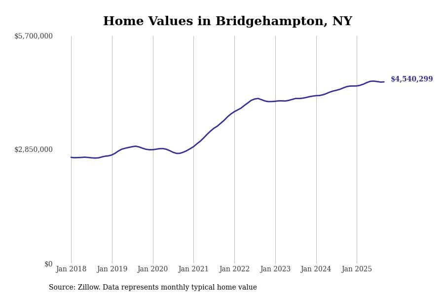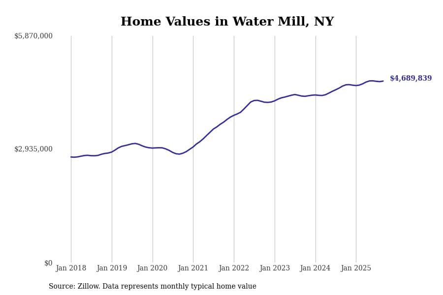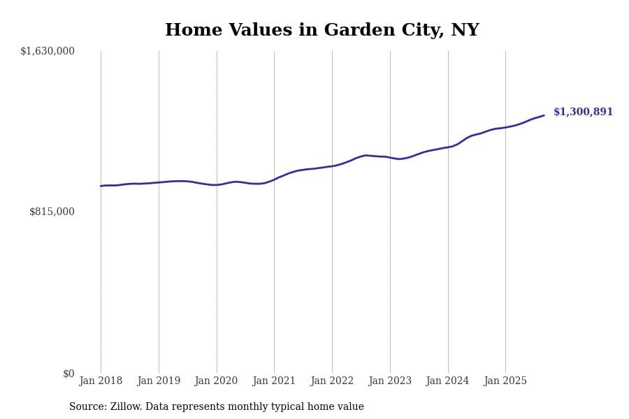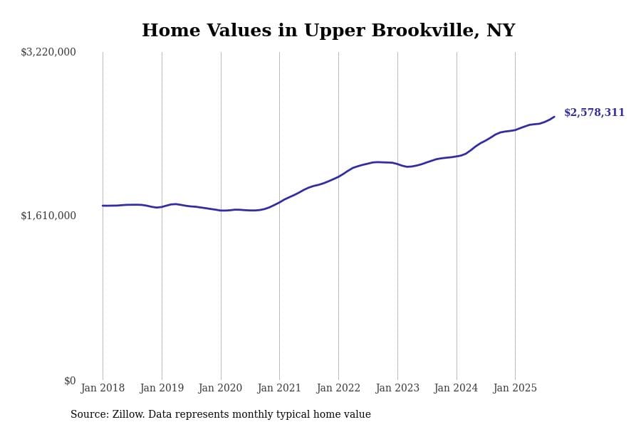Stacker compiled a list of cities with the fastest-growing home prices in New York using data from Zillow. Cities are ranked by the dollar change in the Zillow Home Values Index for all homes from the 12 months ending September 2025. The charts in this story were created automatically using Matplotlib. Data was available for 50 cities and towns in New York.