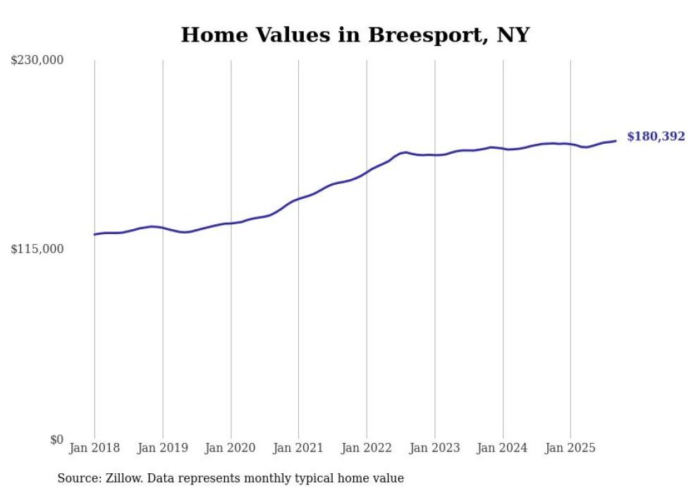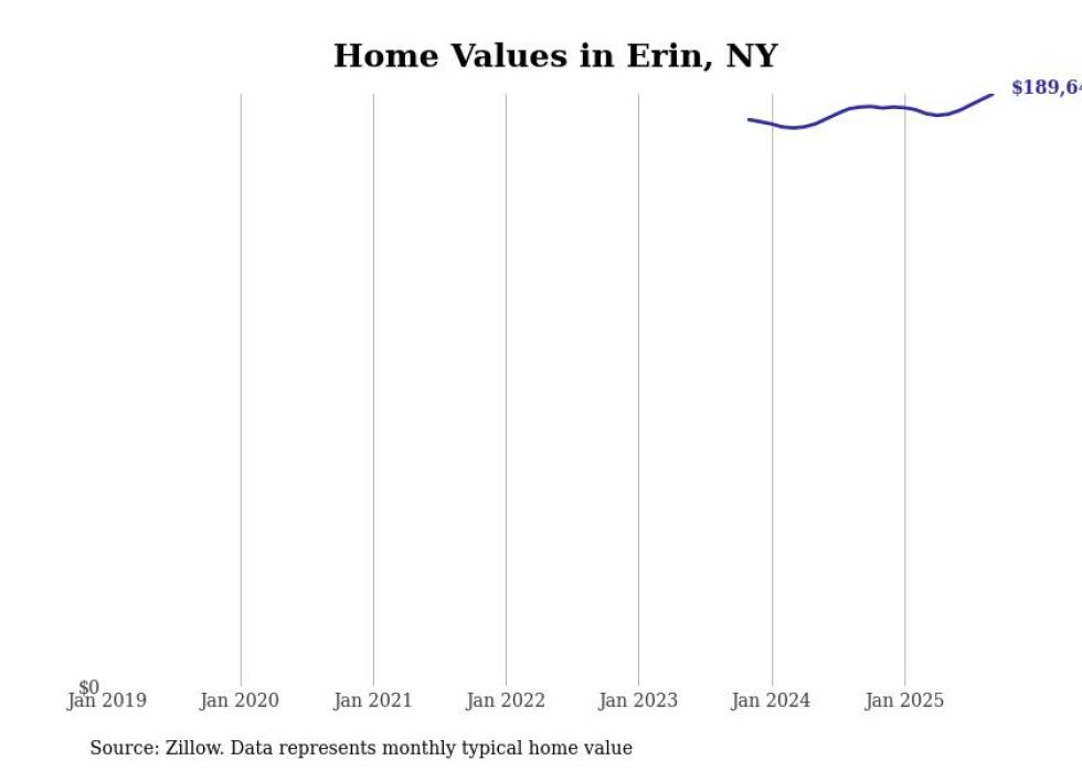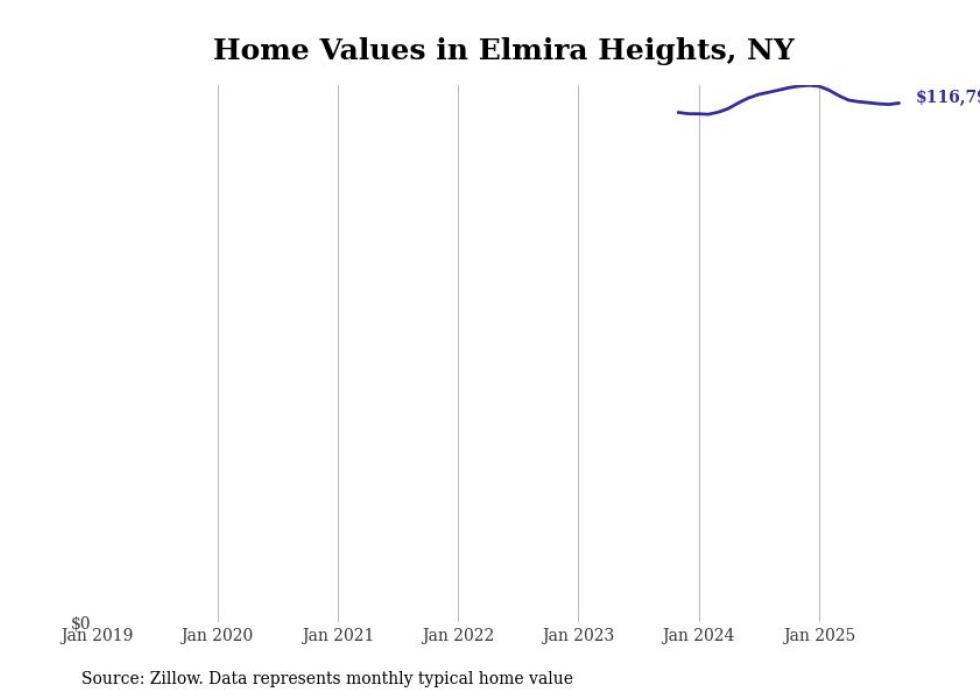 Stacker compiled a list of cities with the most expensive homes in the Elmira, NY metro area using data from Zillow. Charts show the monthly typical home value since January 2018.
