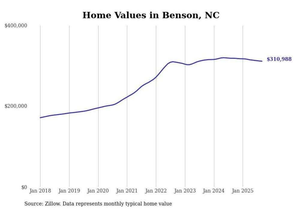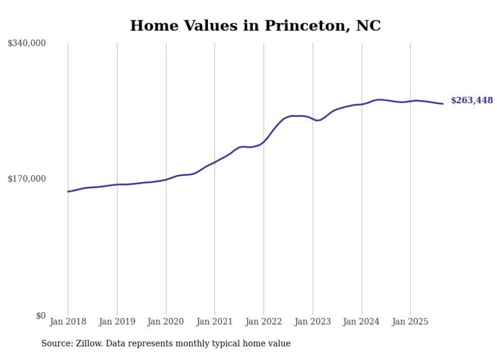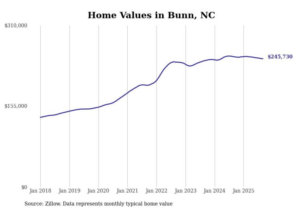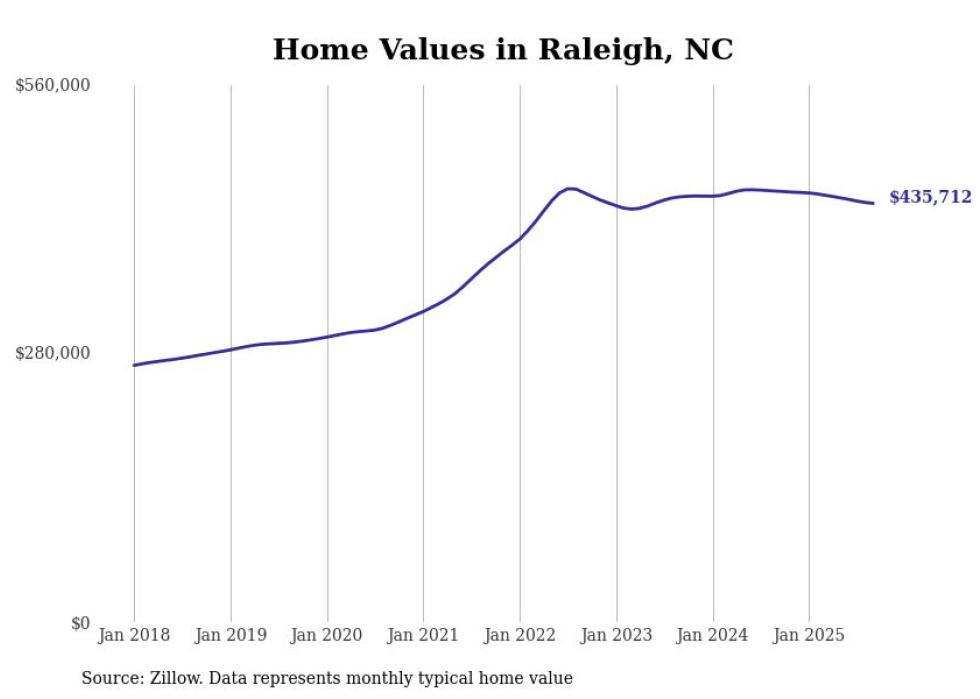 Stacker compiled a list of cities with the most expensive homes in the Raleigh metro area using data from Zillow. Charts show the monthly typical home value since January 2018. All 25 cities and towns with data available were included in the list.