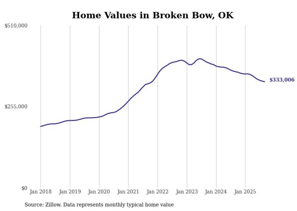 Stacker compiled a list of cities with the most expensive homes in Oklahoma using data from Zillow. Cities are ranked by the Zillow Home Values Index for all homes as of September 2025. The charts in this story were created automatically using Matplotlib.