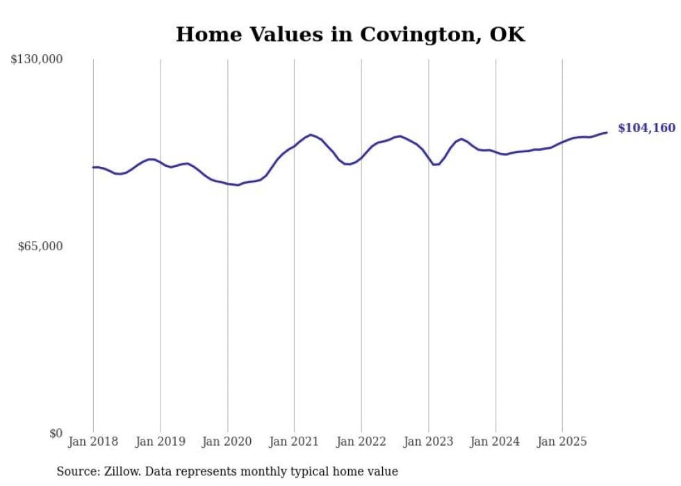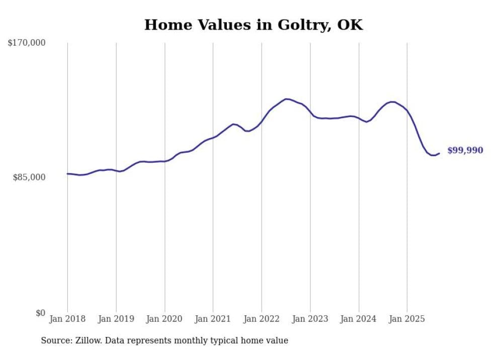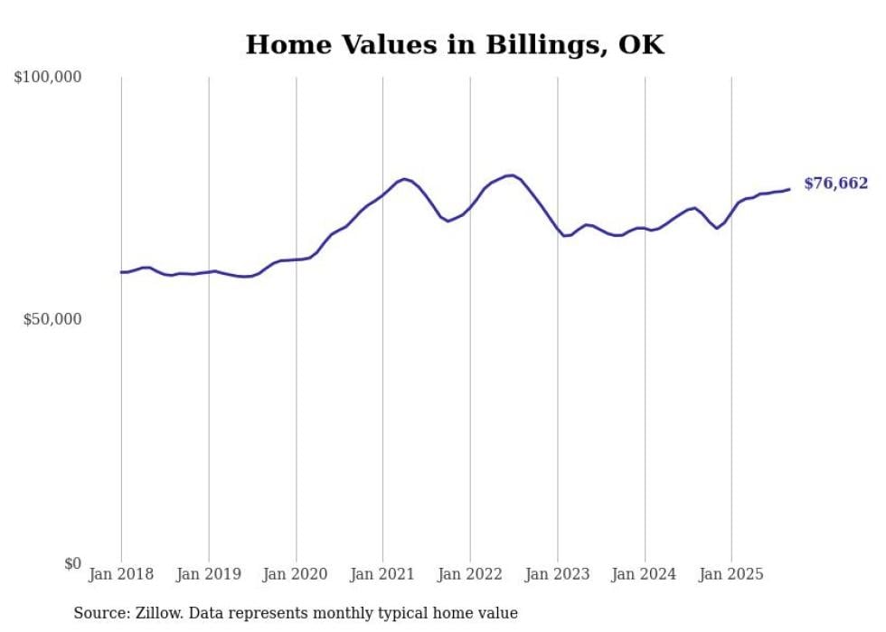 Stacker compiled a list of cities with the most expensive homes in the Enid metro area using data from Zillow. Charts show the monthly typical home value since January 2018. All 11 cities and towns with data available were included in the list.