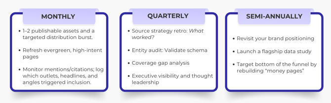 Monthly activity keeps signals fresh and creates more “hooks” for editors and engines.