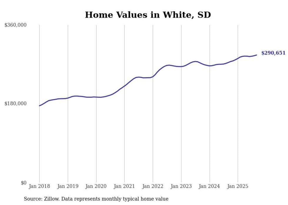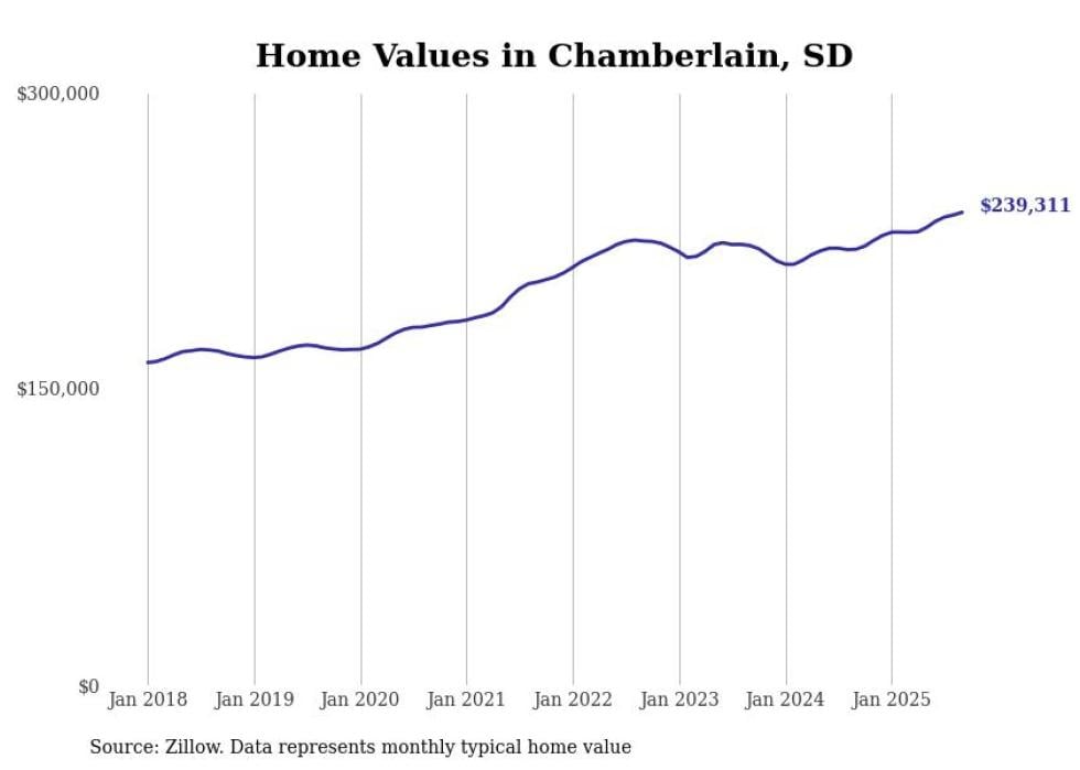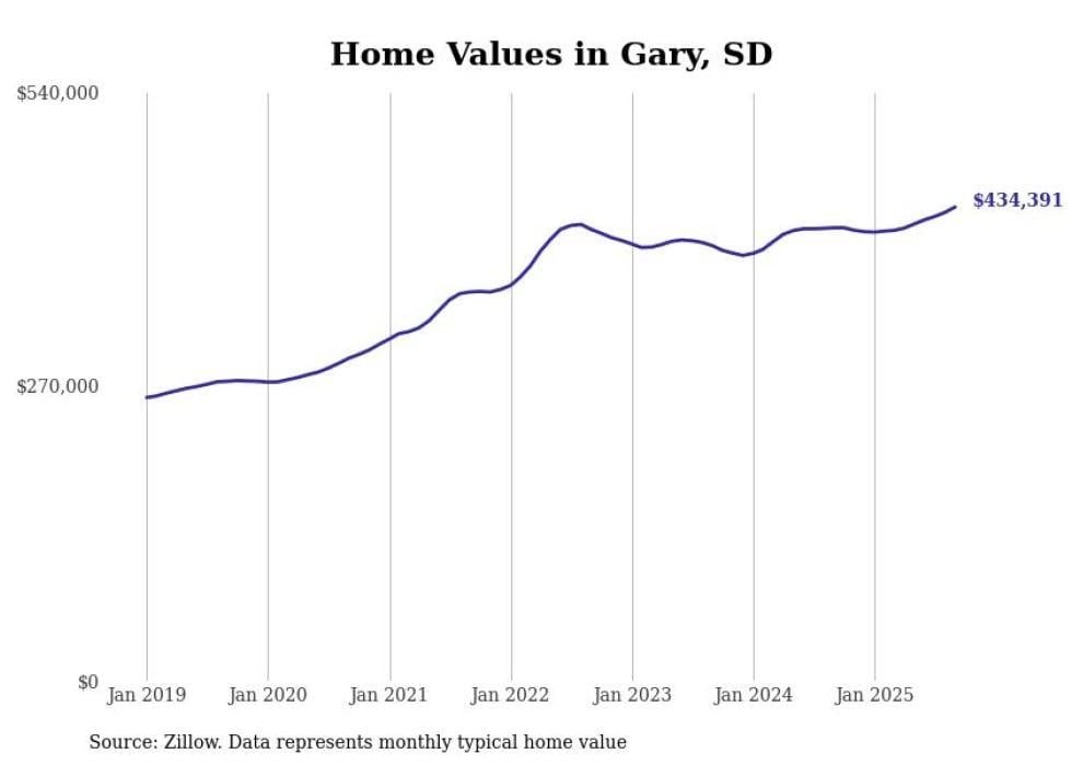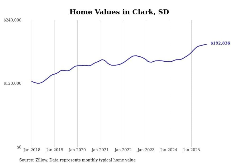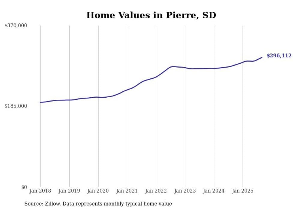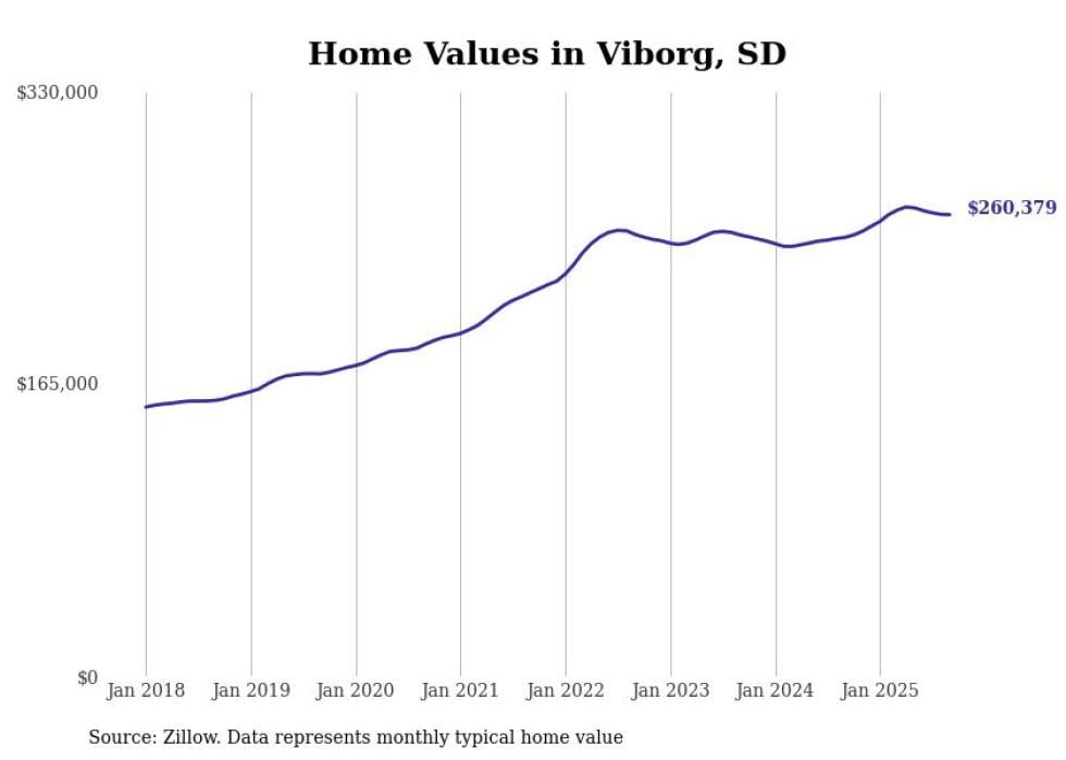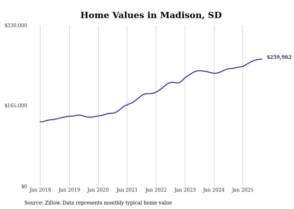 Stacker compiled a list of cities with the fastest-growing home prices in South Dakota using data from Zillow. Cities are ranked by the dollar change in the Zillow Home Values Index for all homes from the 12 months ending September 2025. The charts in this story were created automatically using Matplotlib. Data was available for 50 cities and towns in South Dakota.