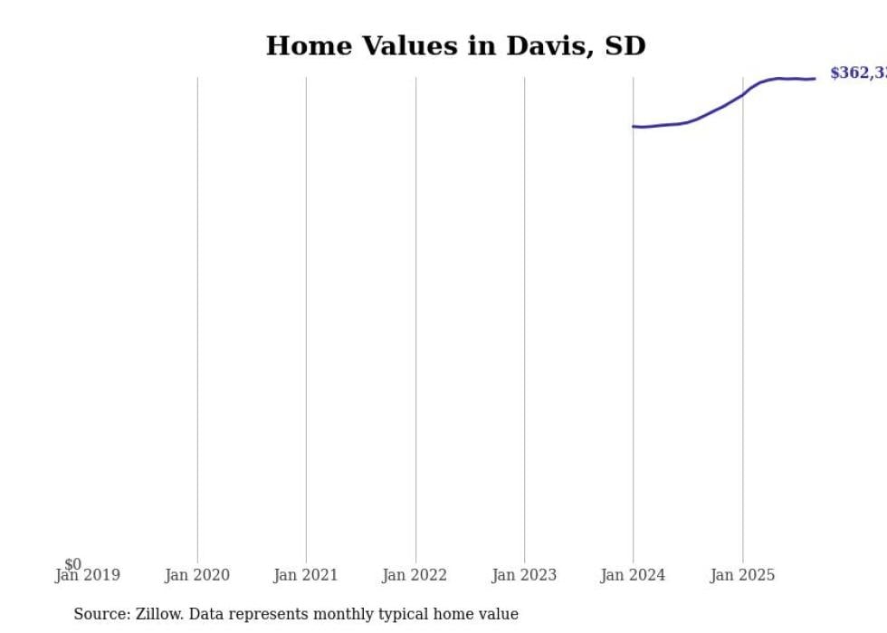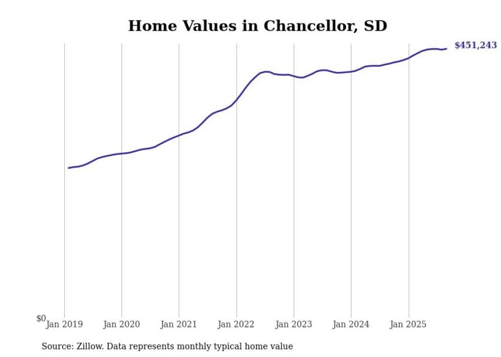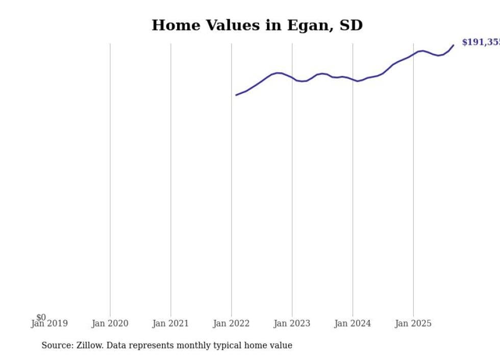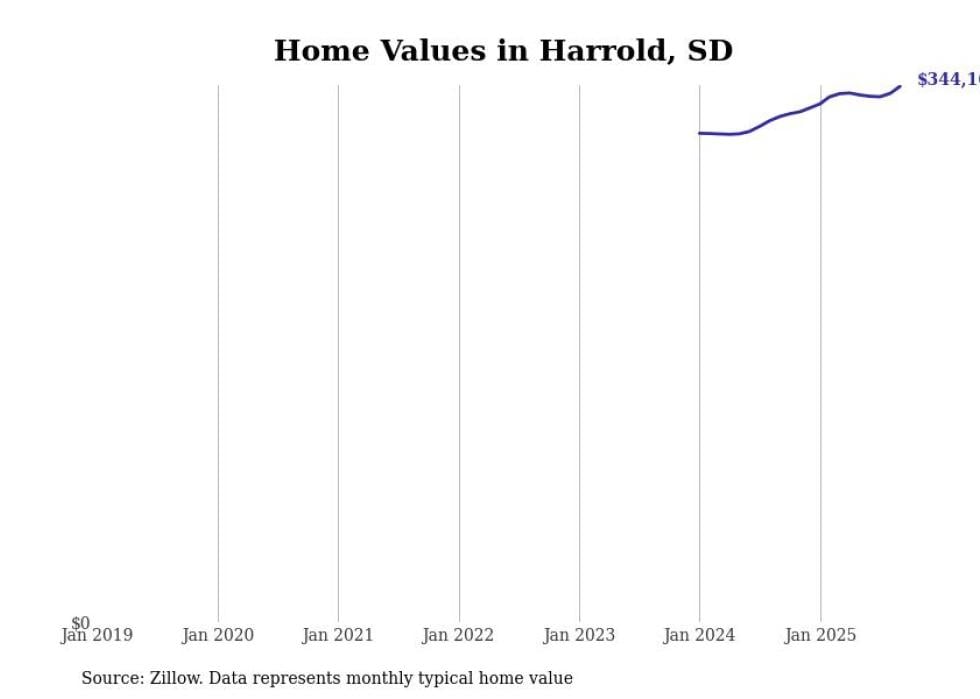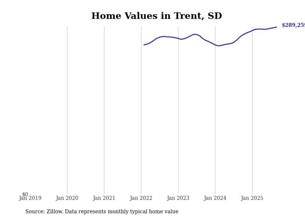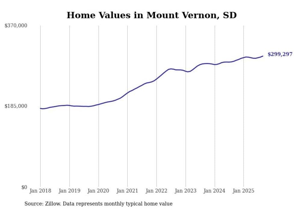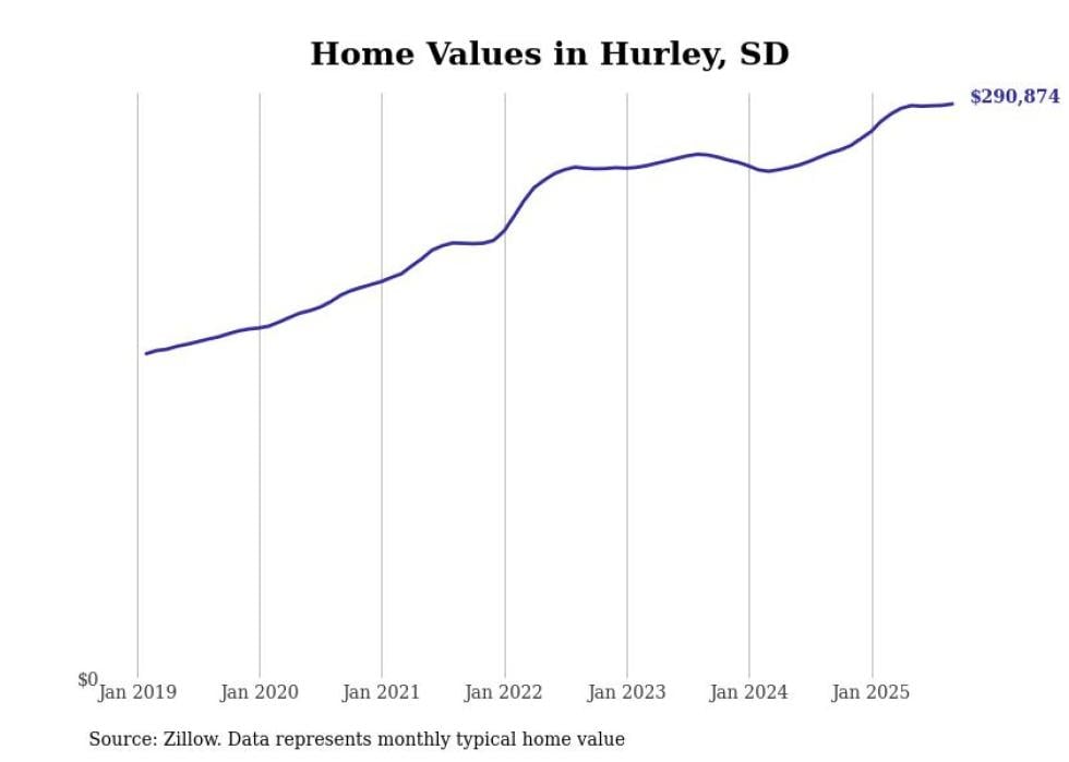 Stacker compiled a list of cities with the fastest-growing home prices in South Dakota using data from Zillow. Cities are ranked by the dollar change in the Zillow Home Values Index for all homes from the 12 months ending September 2025. The charts in this story were created automatically using Matplotlib. Data was available for 50 cities and towns in South Dakota.