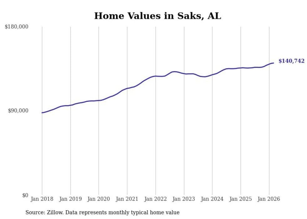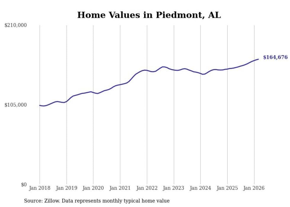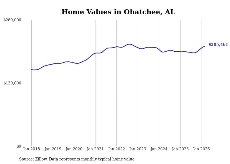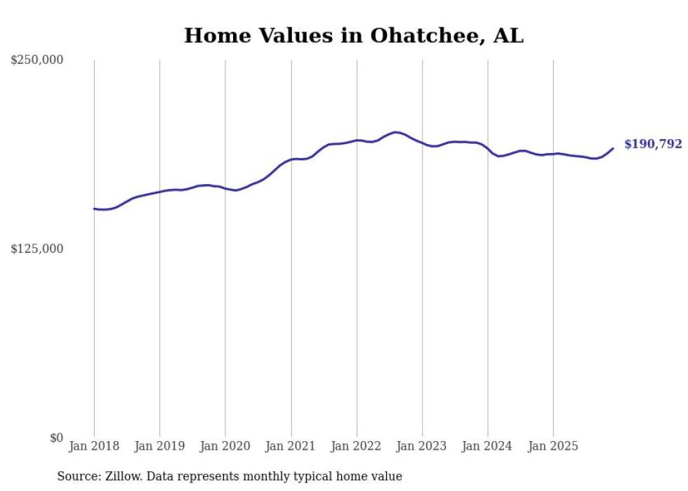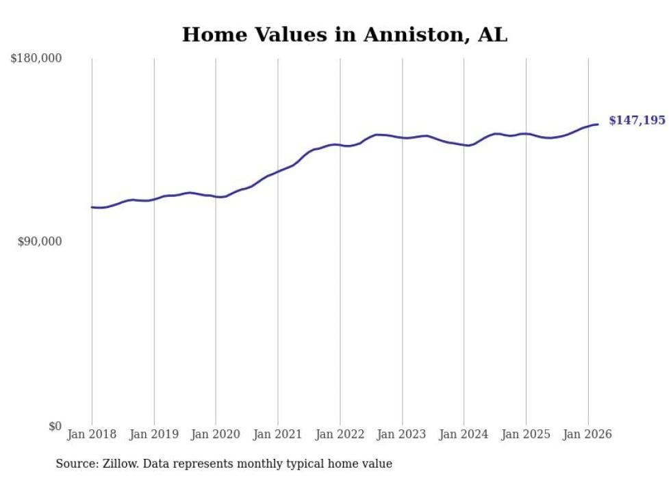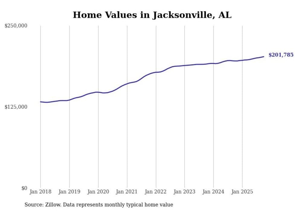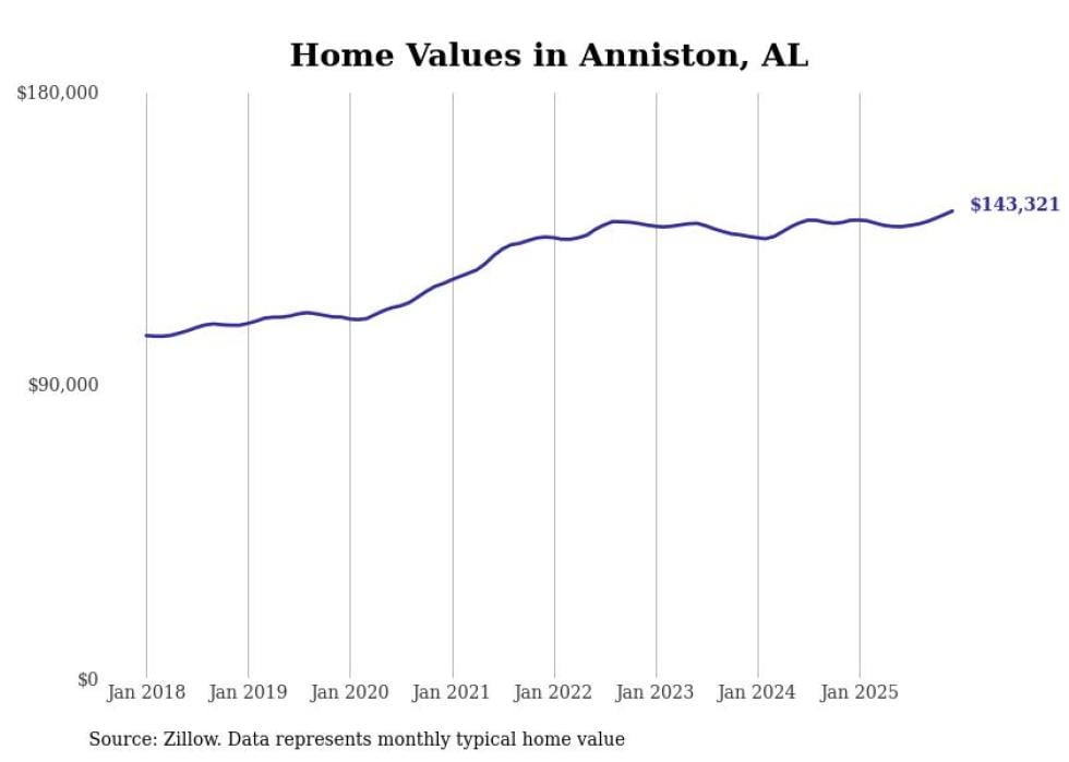 Stacker compiled a list of cities with the most expensive homes in the Anniston metro area using data from Zillow. Charts show the monthly typical home value since January 2018. All 9 cities and towns with data available were included in the list.