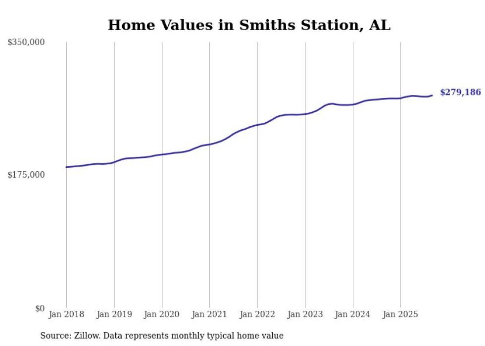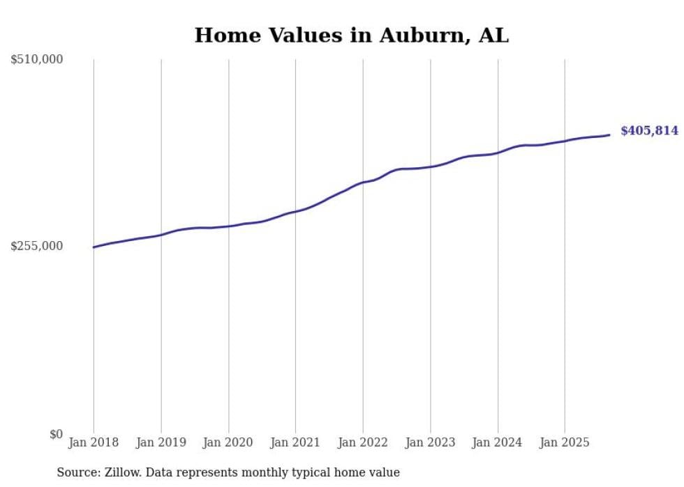 Stacker compiled a list of cities with the most expensive homes in the Auburn-Opelika, AL metro area using data from Zillow. Charts show the monthly typical home value since January 2018.