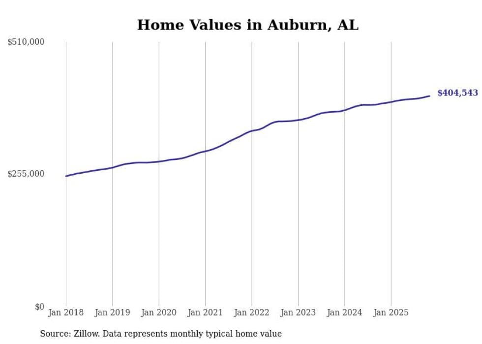 Stacker compiled a list of cities with the most expensive homes in the Auburn metro area using data from Zillow. Charts show the monthly typical home value since January 2018. All 4 cities and towns with data available were included in the list.