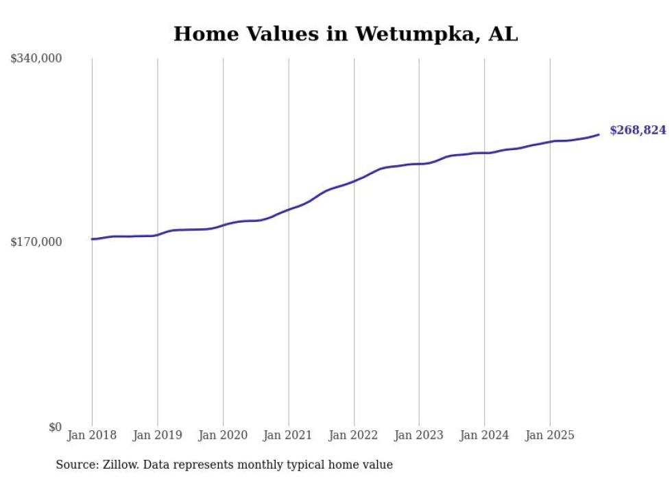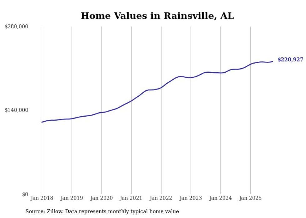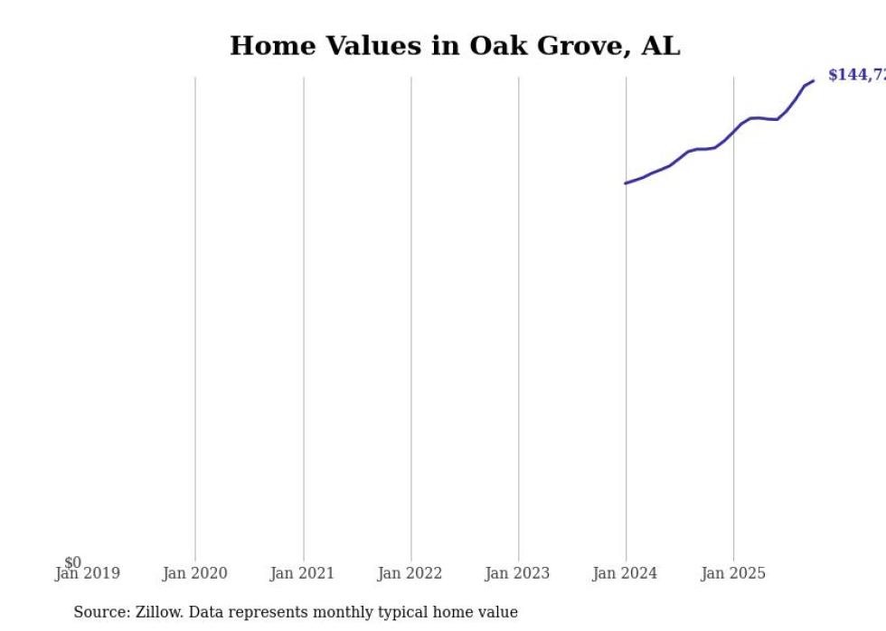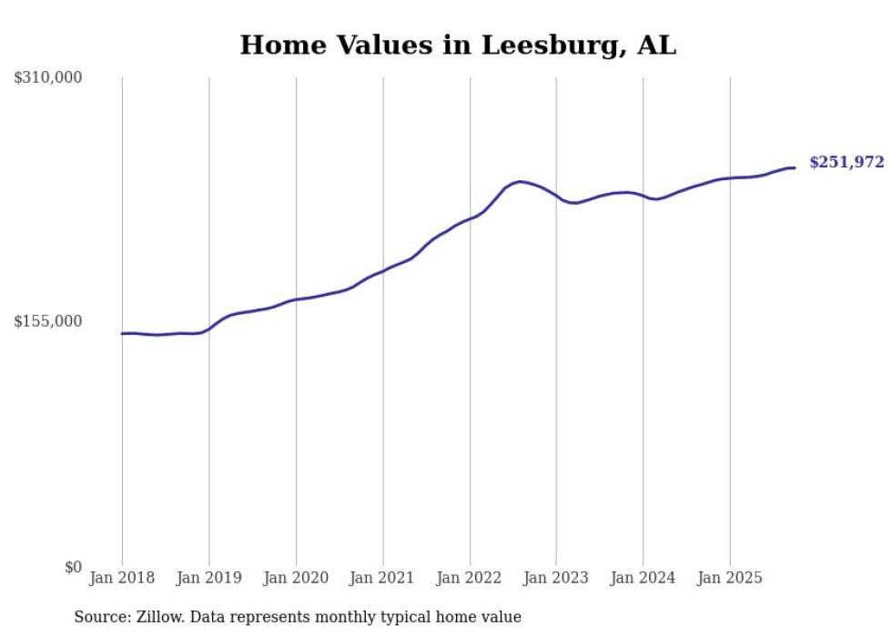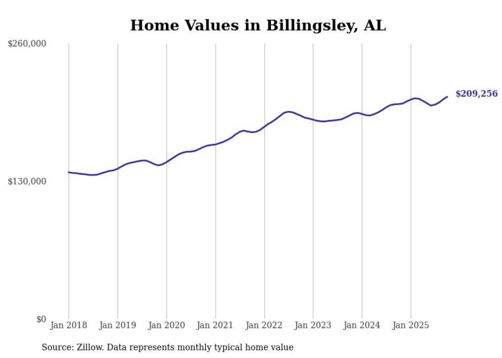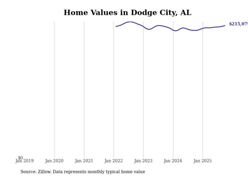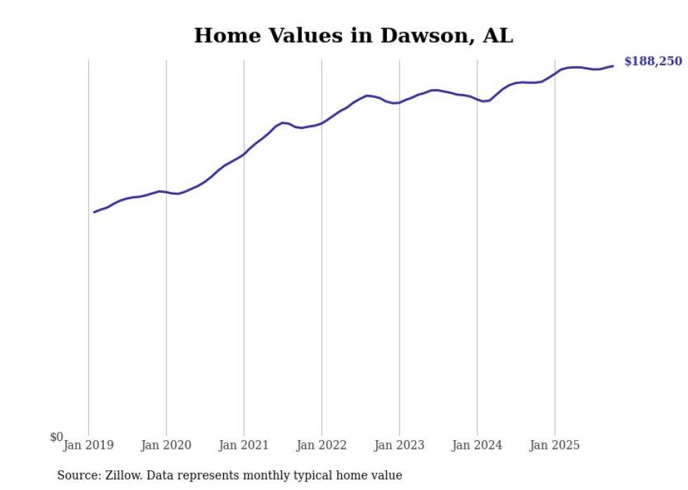 Stacker compiled a list of cities with the fastest-growing home prices in Alabama using data from Zillow. Cities are ranked by the dollar change in the Zillow Home Values Index for all homes from the 12 months ending October 2025. The charts in this story were created automatically using Matplotlib. Data was available for 50 cities and towns in Alabama.