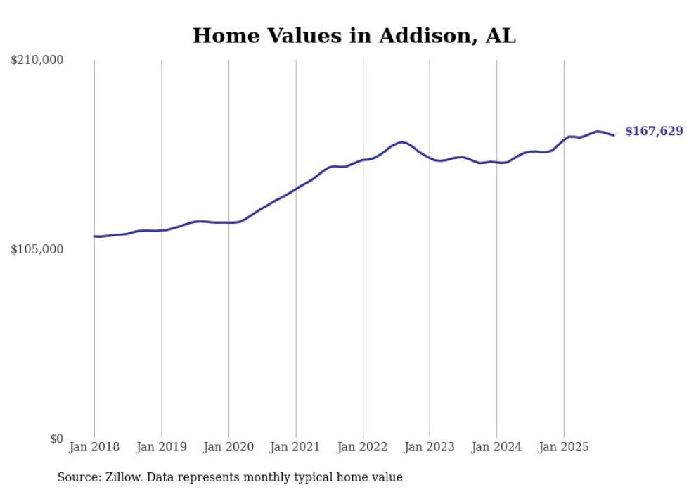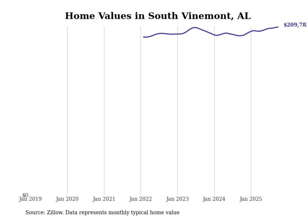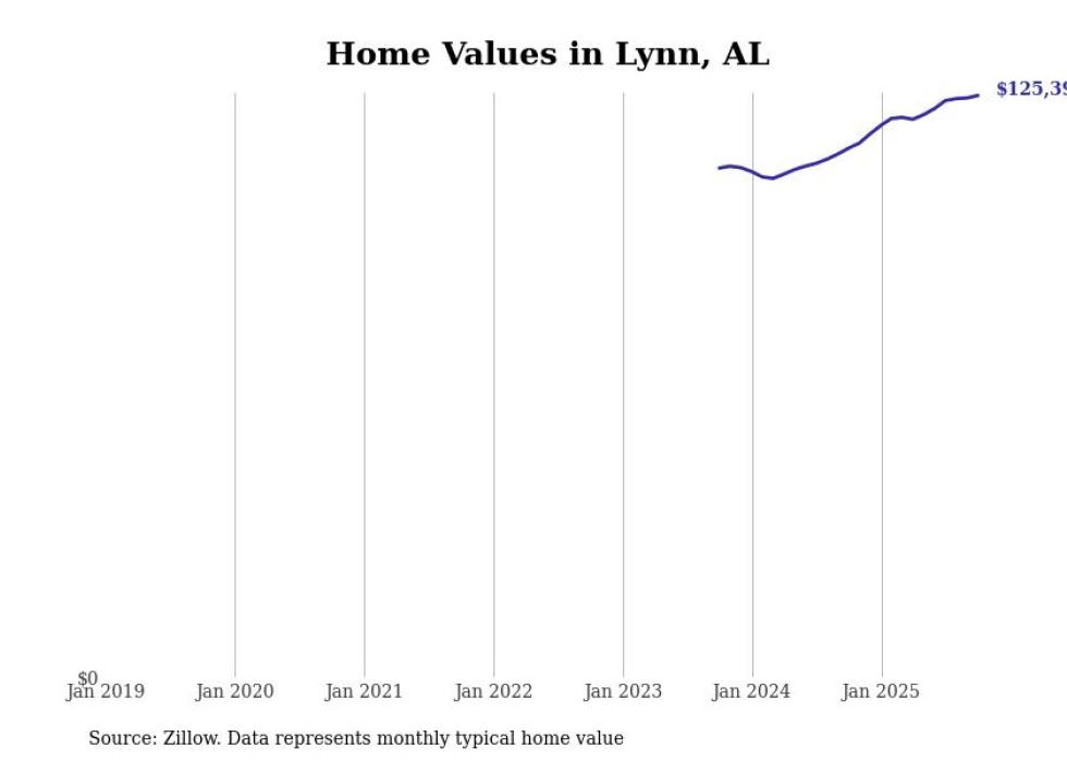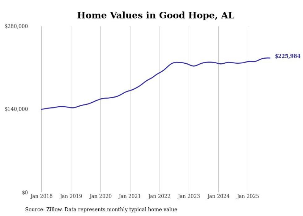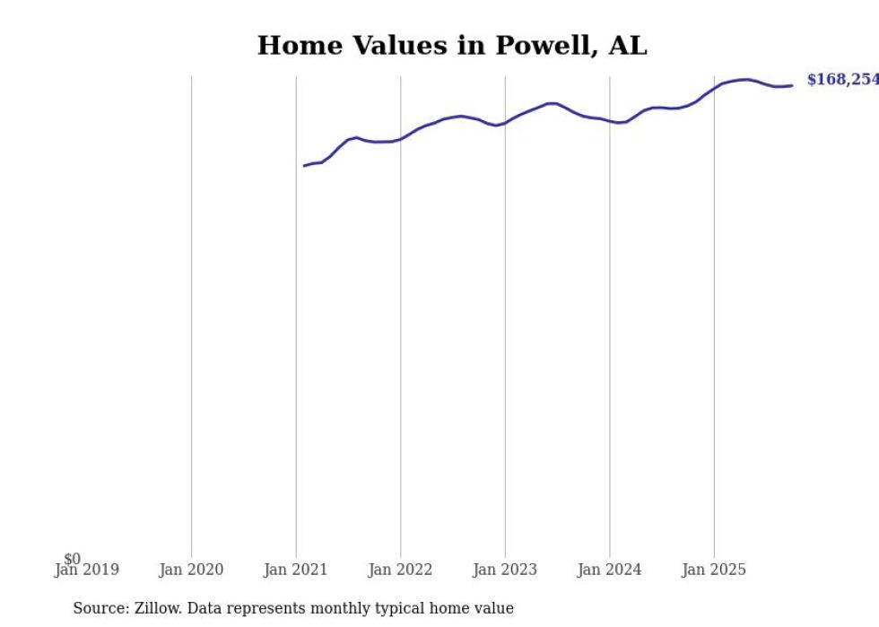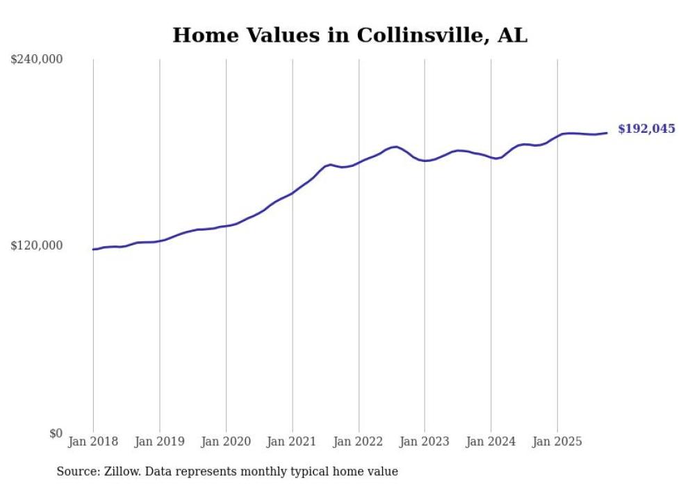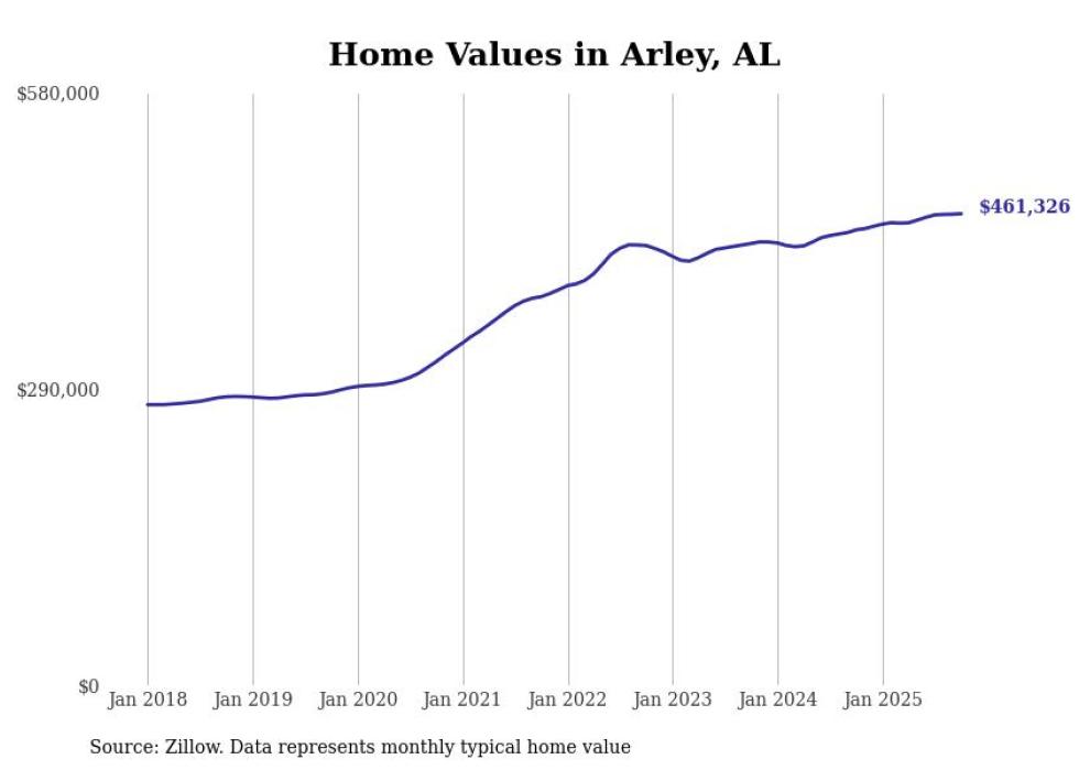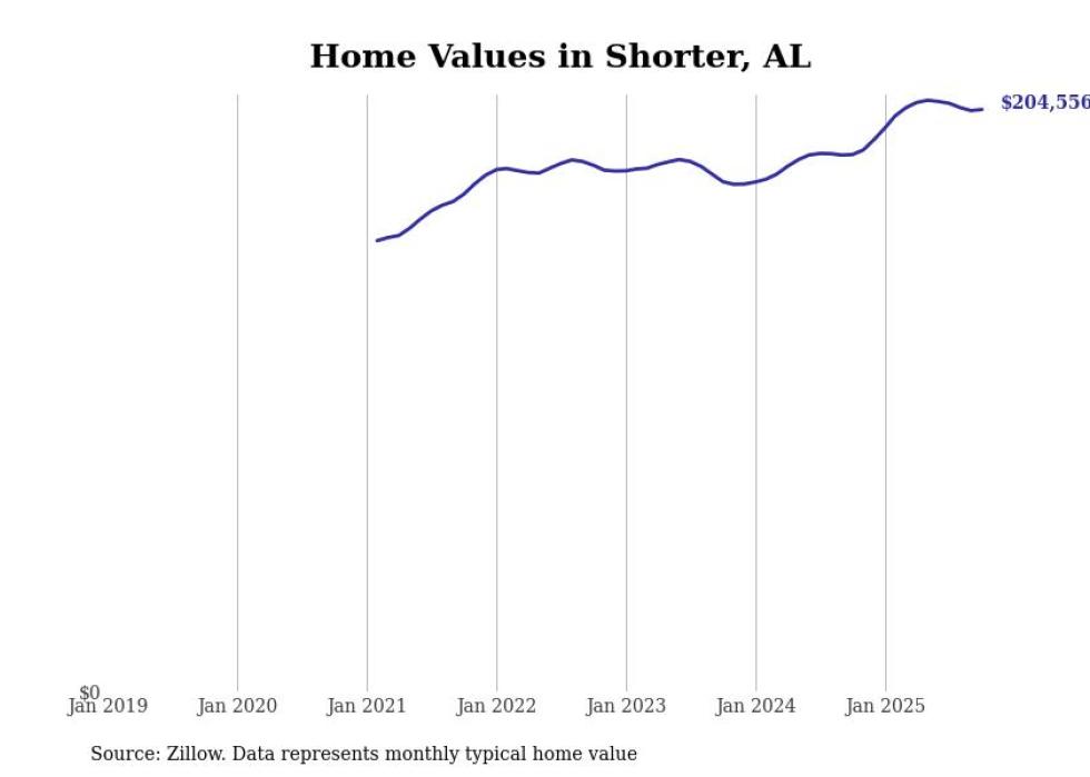 Stacker compiled a list of cities with the fastest-growing home prices in Alabama using data from Zillow. Cities are ranked by the dollar change in the Zillow Home Values Index for all homes from the 12 months ending October 2025. The charts in this story were created automatically using Matplotlib. Data was available for 50 cities and towns in Alabama.