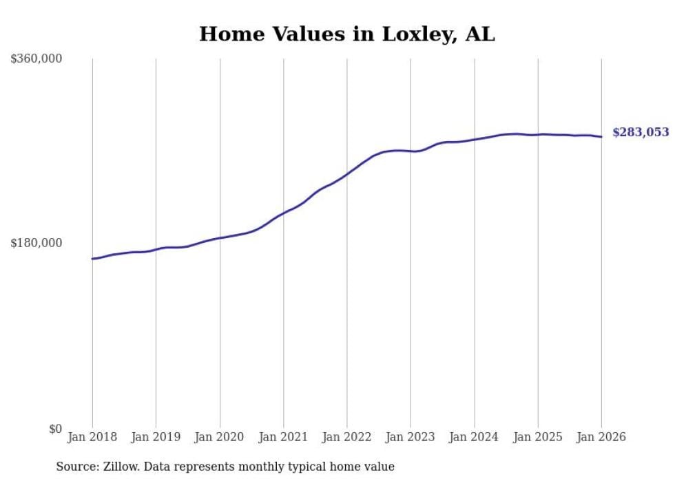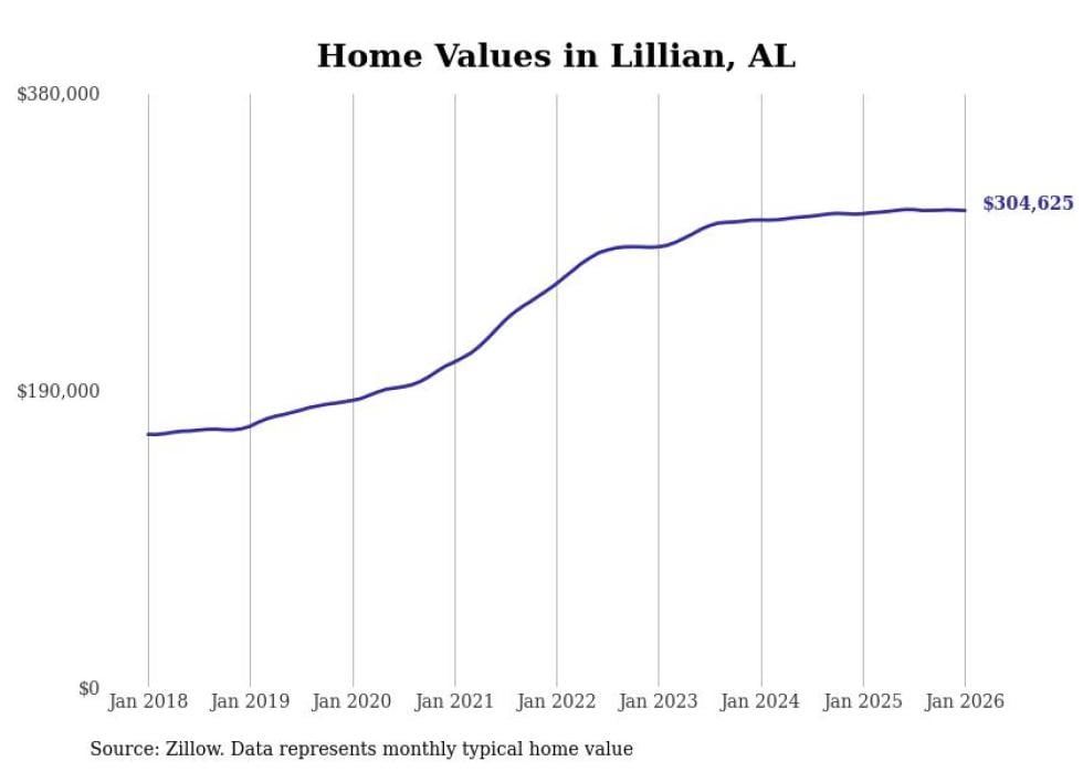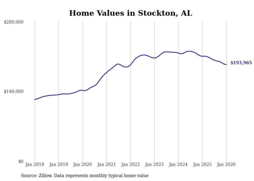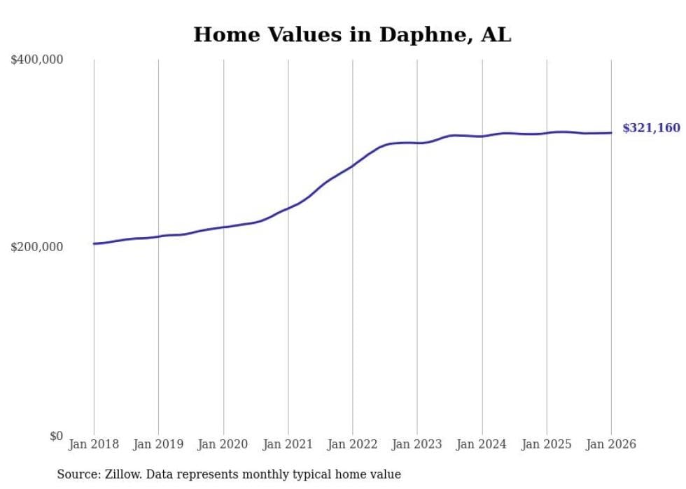 Stacker compiled a list of cities with the most expensive homes in the Daphne metro area using data from Zillow. Charts show the monthly typical home value since January 2018. All 17 cities and towns with data available were included in the list.