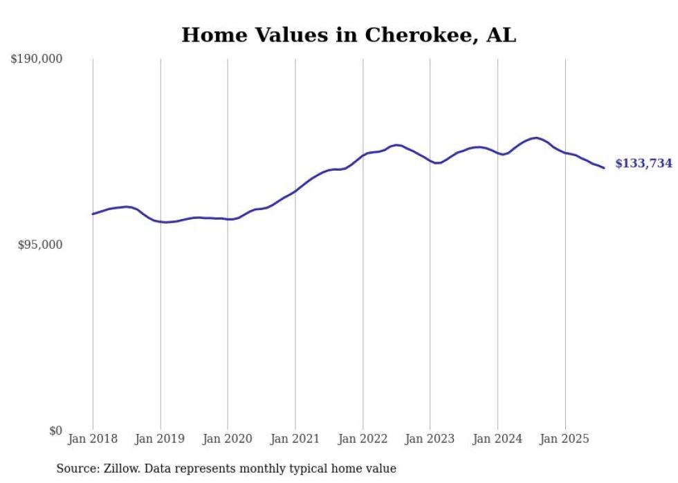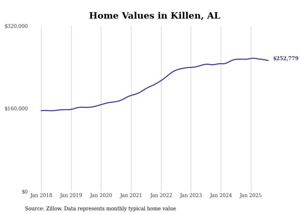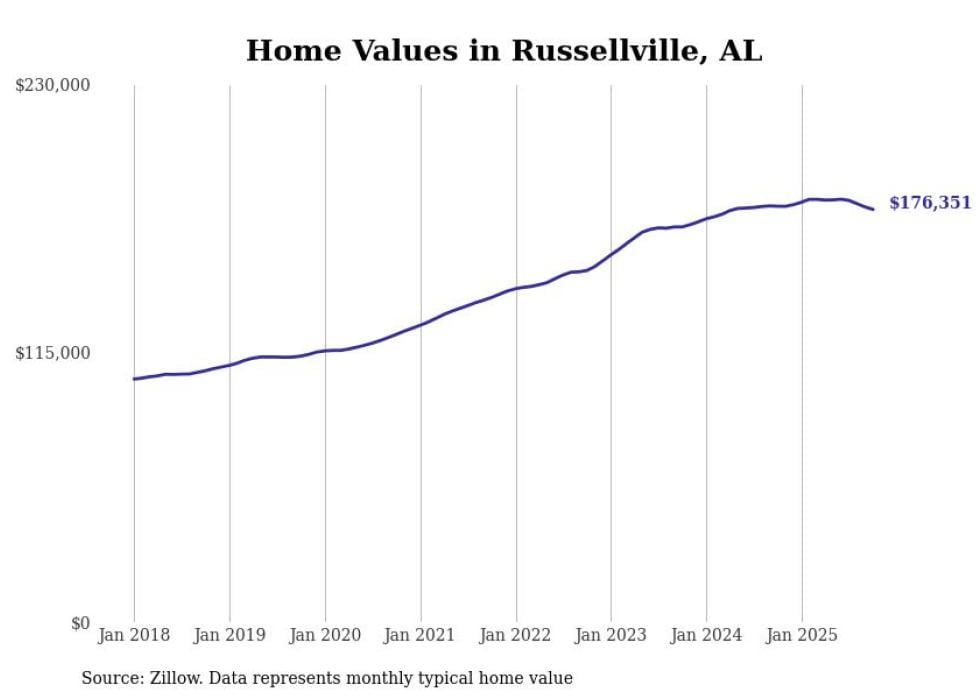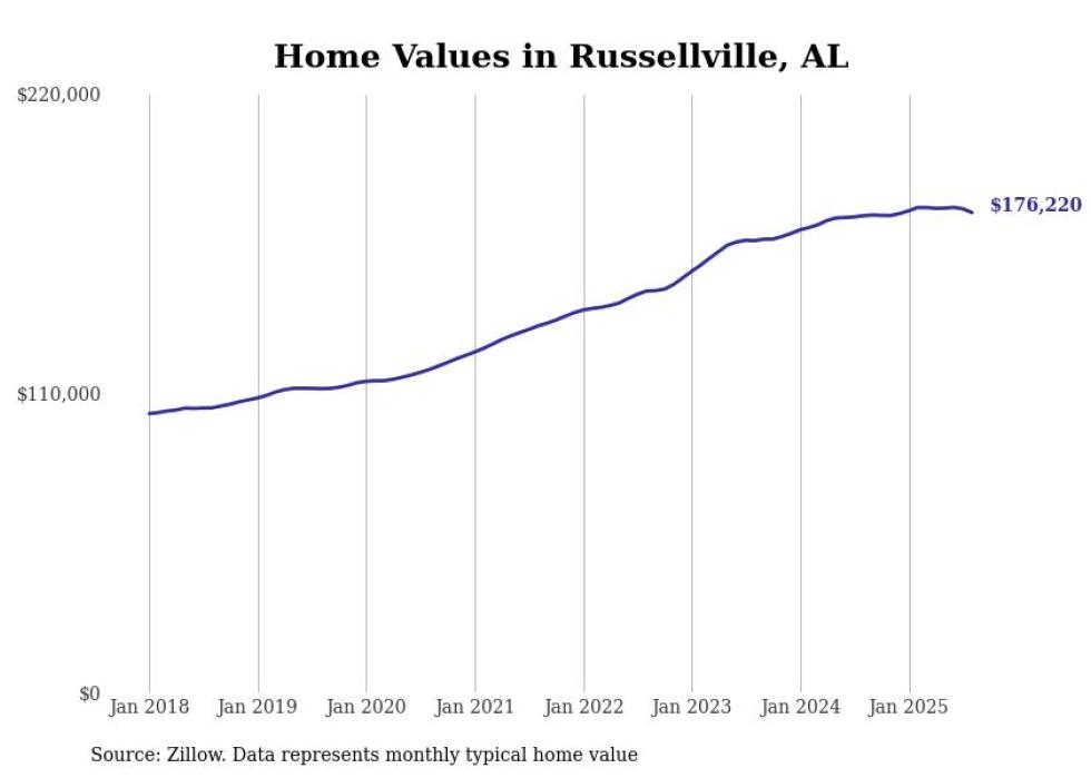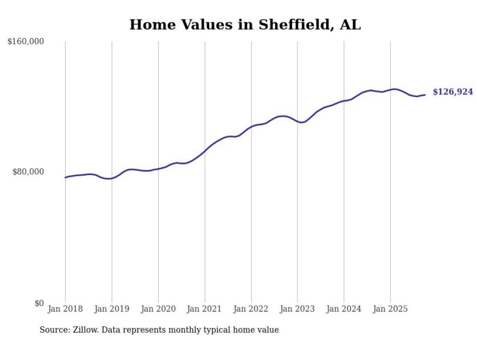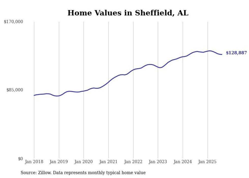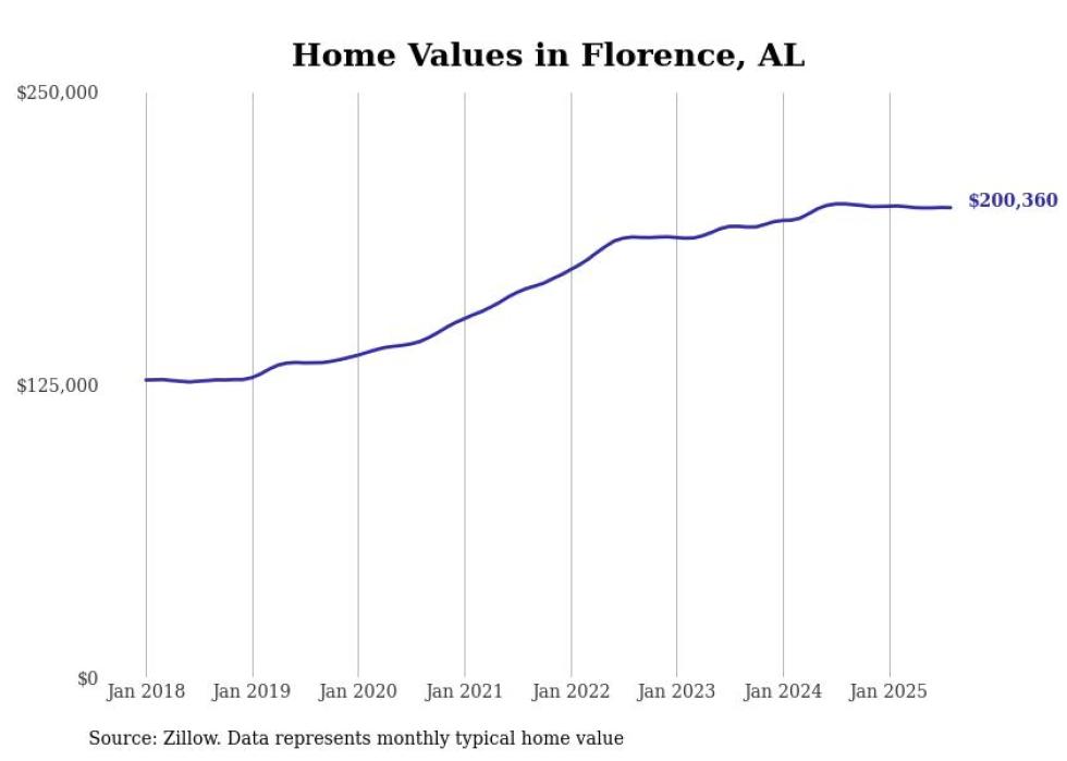 Stacker compiled a list of cities with the most expensive homes in the Florence-Muscle Shoals, AL metro area using data from Zillow. Charts show the monthly typical home value since January 2018.