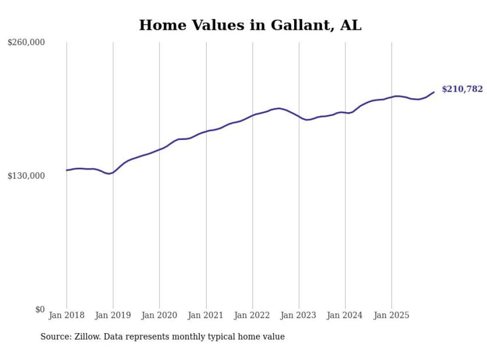 Stacker compiled a list of cities with the most expensive homes in the Gadsden, AL metro area using data from Zillow. Charts show the monthly typical home value since January 2018.