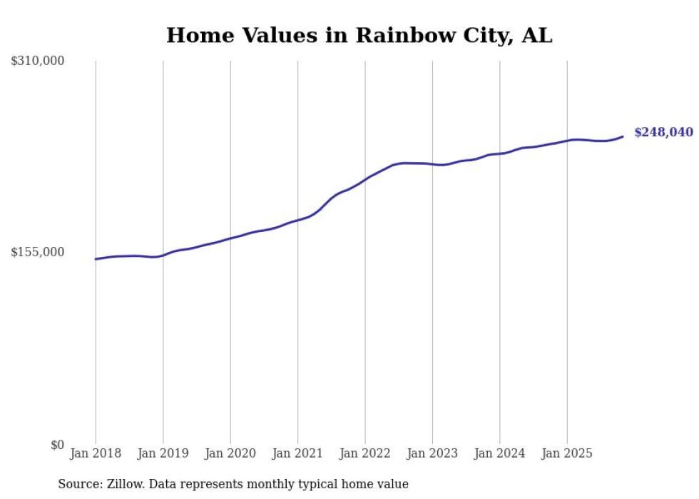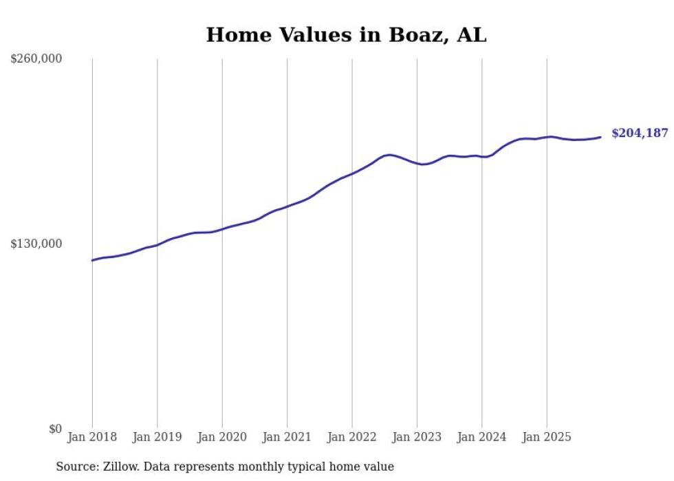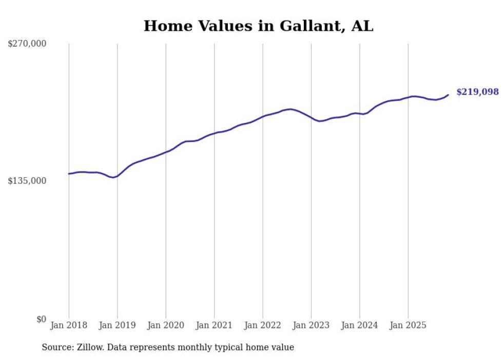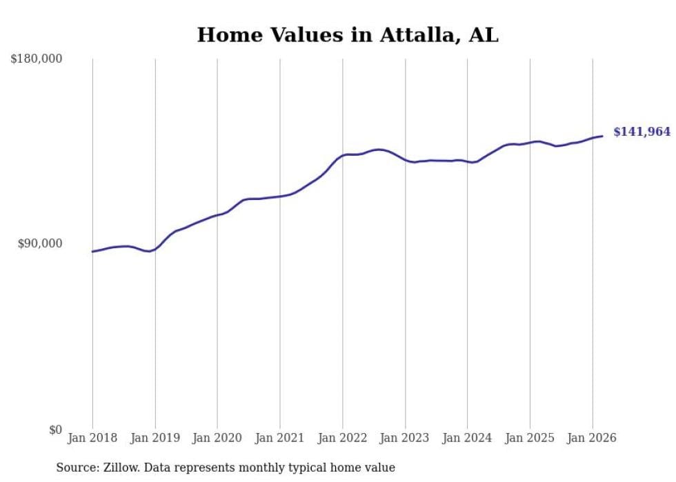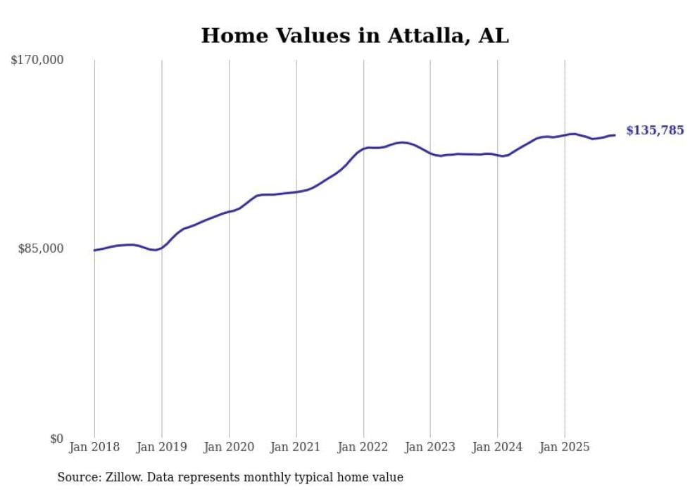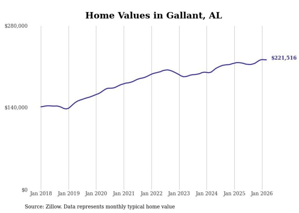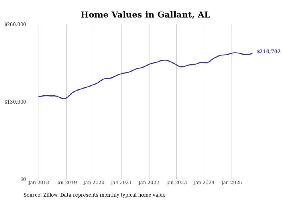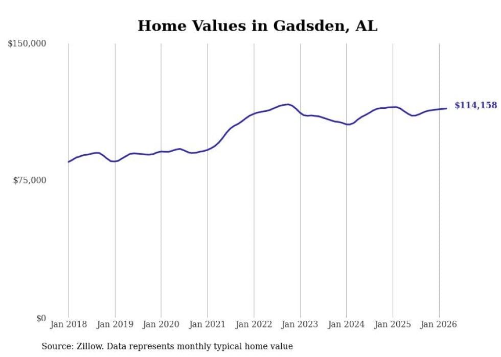 Stacker compiled a list of cities with the most expensive homes in the Gadsden metro area using data from Zillow. Charts show the monthly typical home value since January 2018. All 10 cities and towns with data available were included in the list.