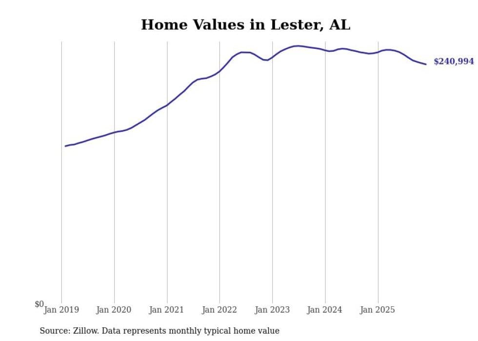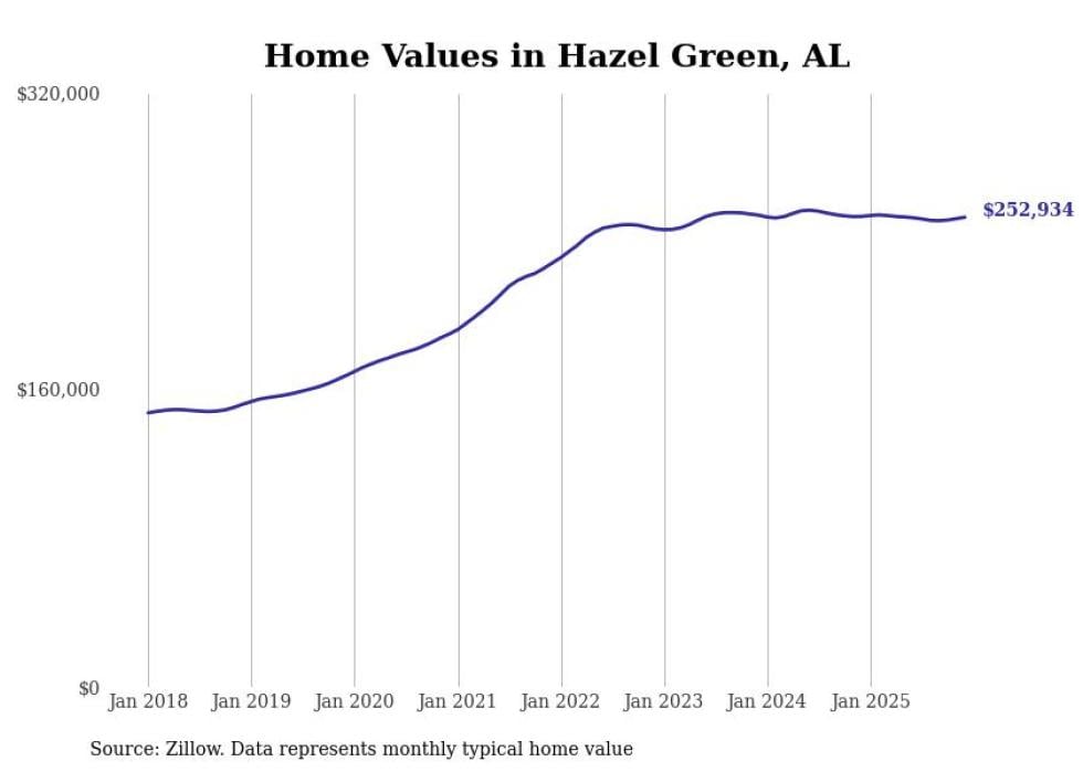 Stacker compiled a list of cities with the most expensive homes in the Huntsville, AL metro area using data from Zillow. Charts show the monthly typical home value since January 2018.