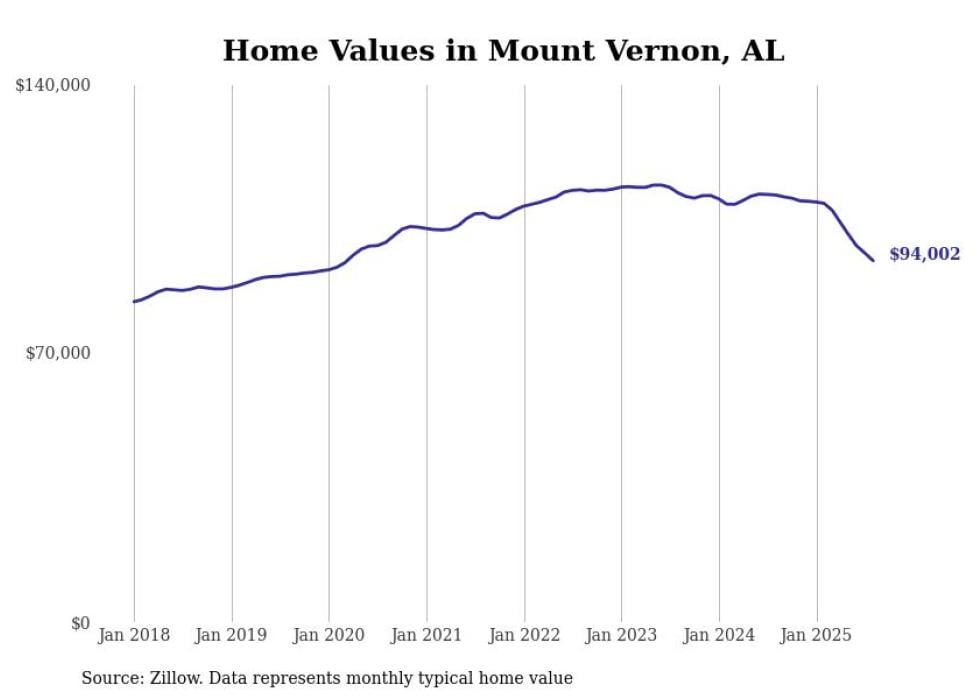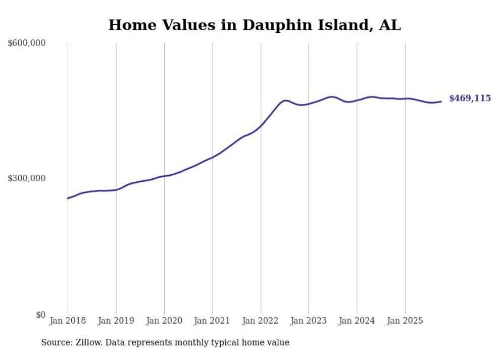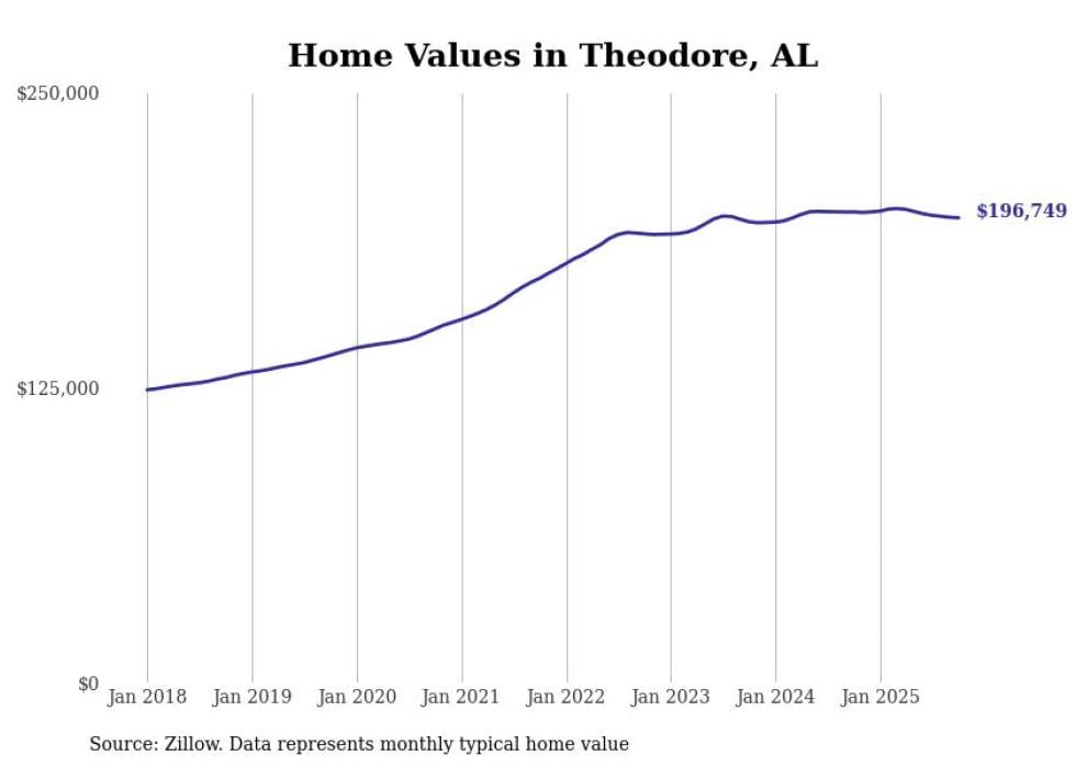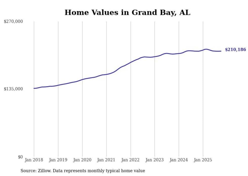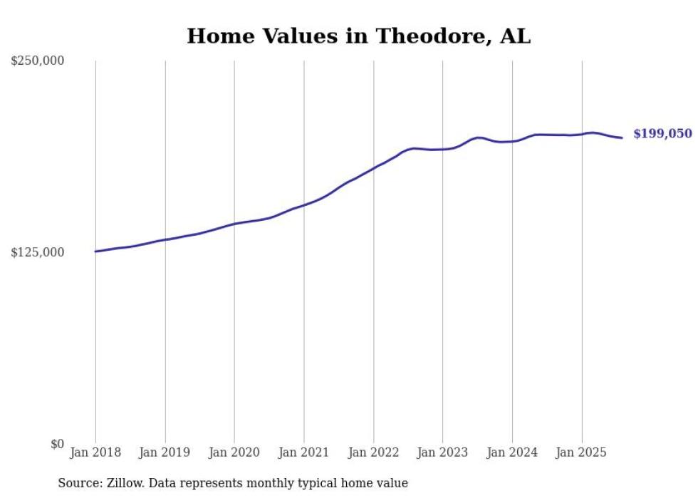 Stacker compiled a list of cities with the most expensive homes in the Mobile metro area using data from Zillow. Charts show the monthly typical home value since January 2018. All 21 cities and towns with data available were included in the list.