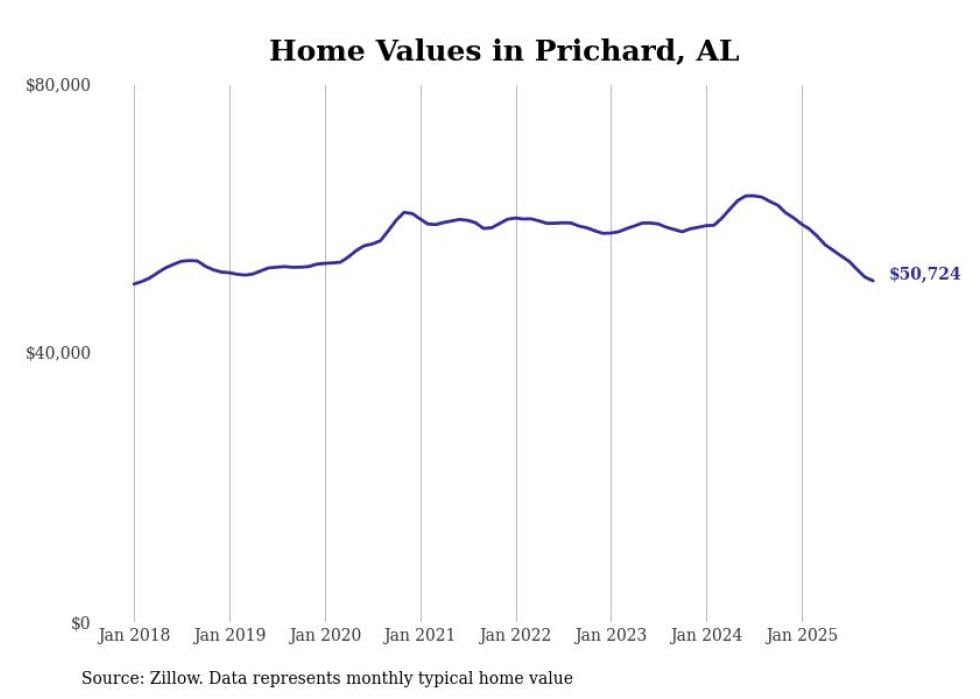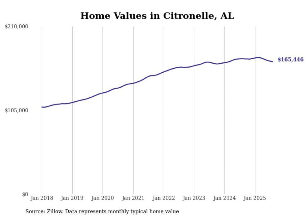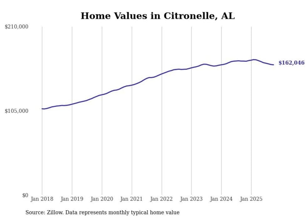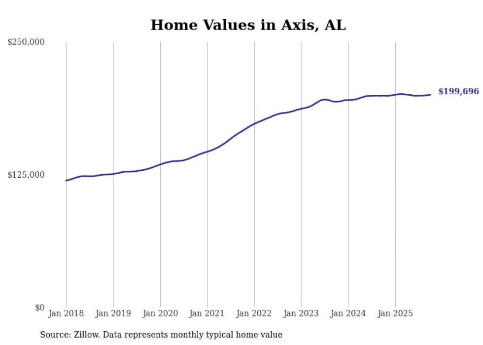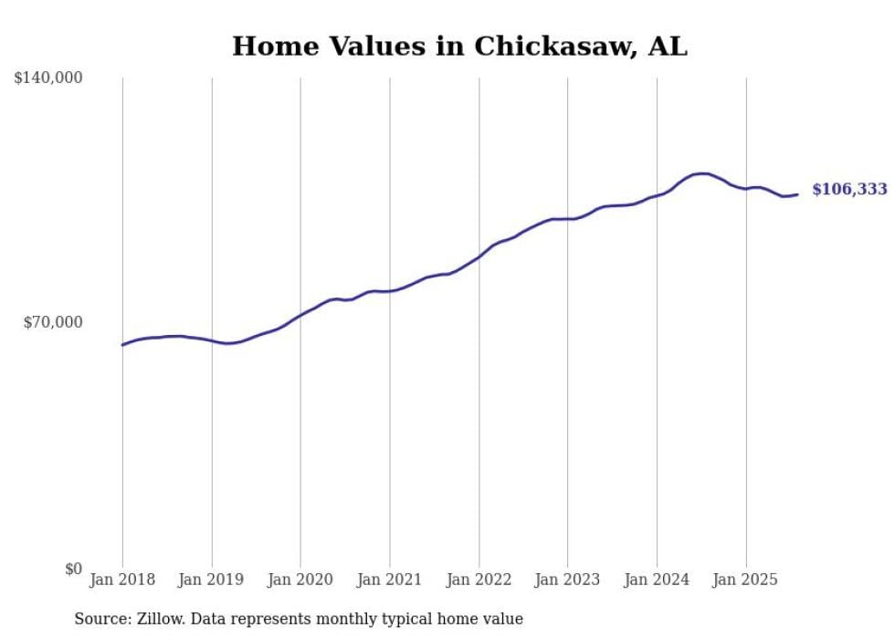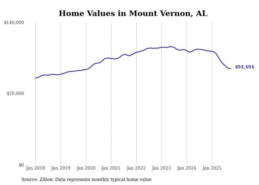 Stacker compiled a list of cities with the most expensive homes in the Mobile metro area using data from Zillow. Charts show the monthly typical home value since January 2018. All 21 cities and towns with data available were included in the list.
