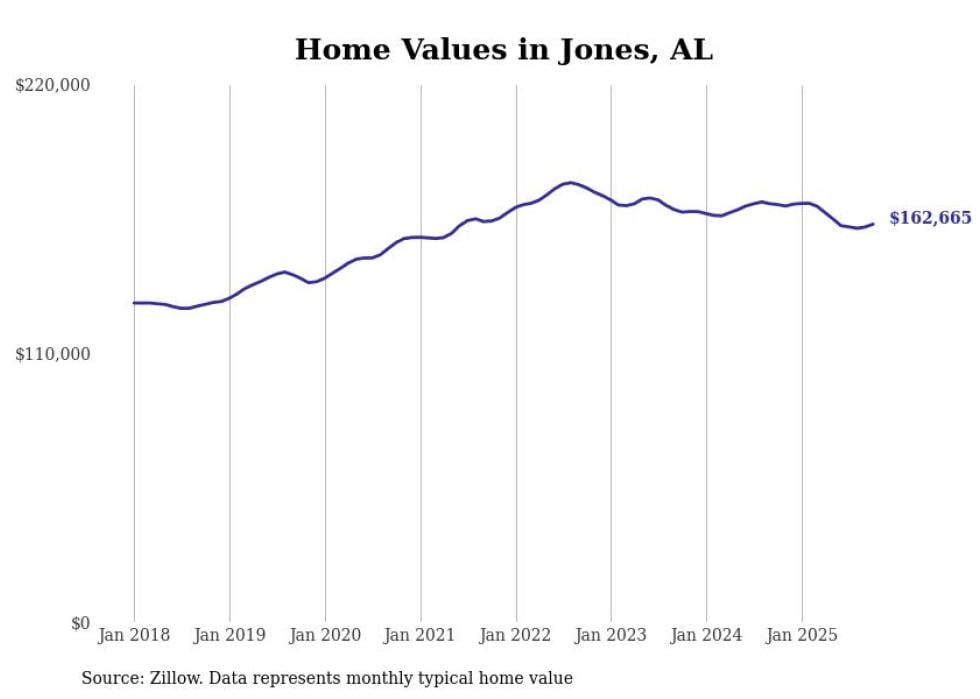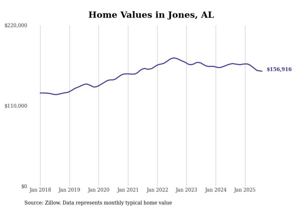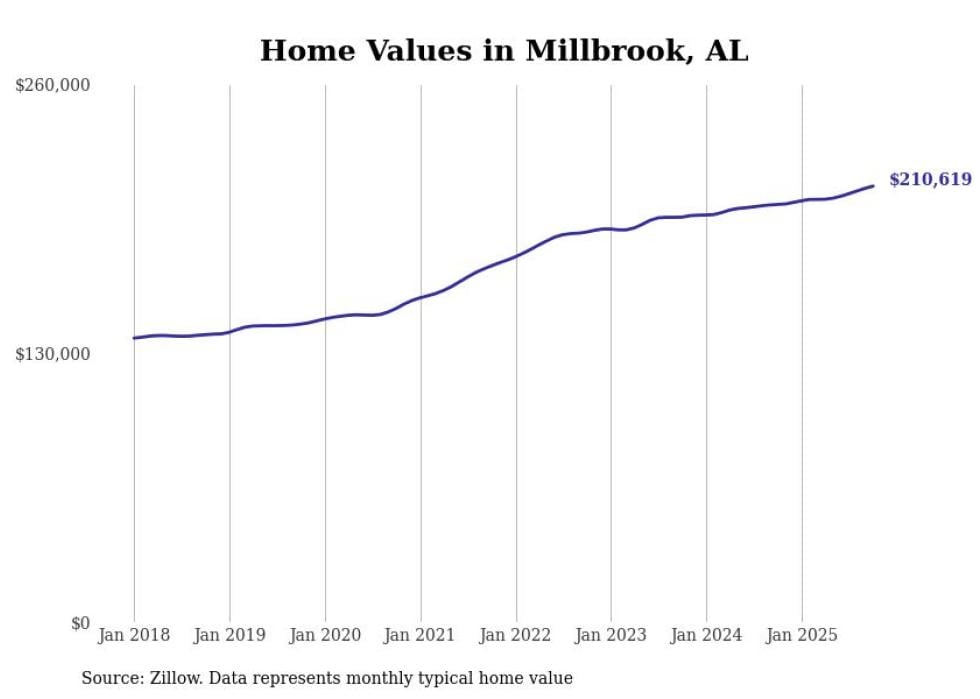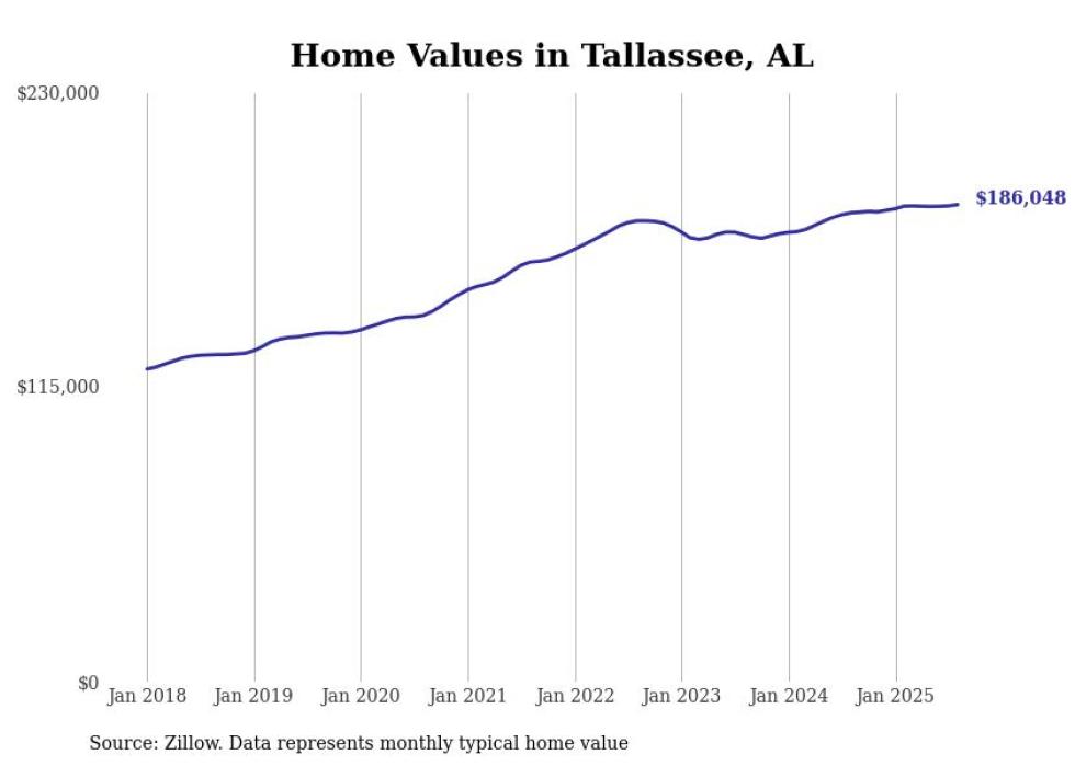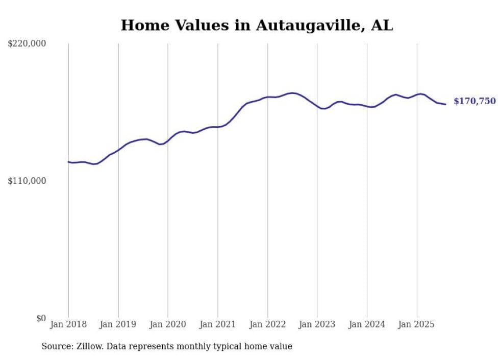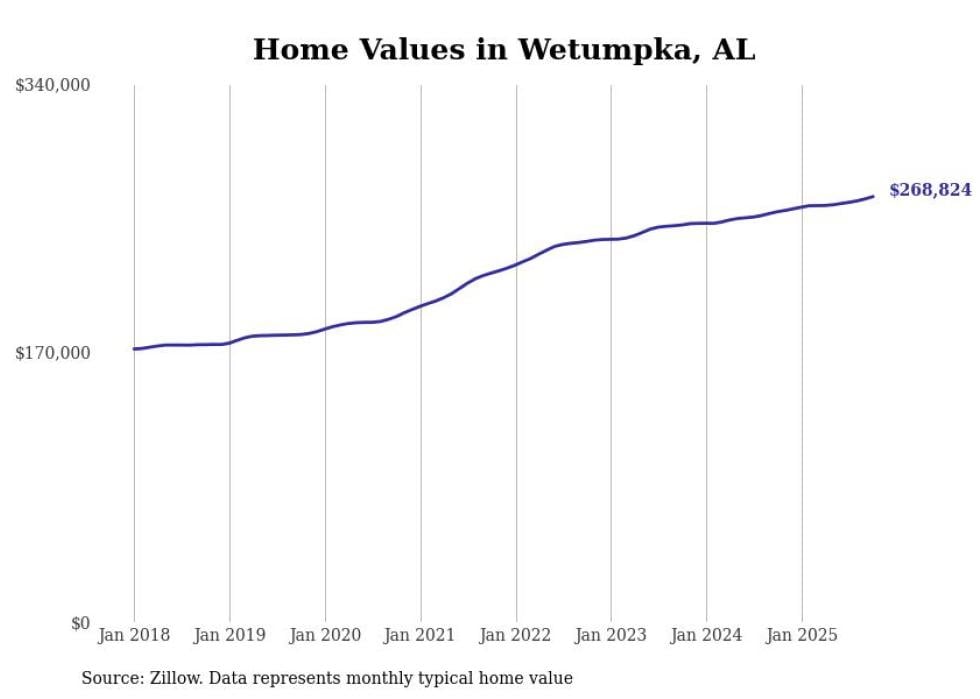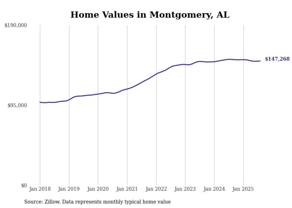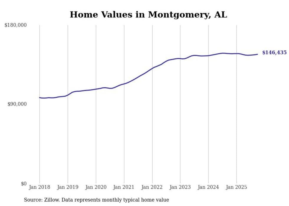 Stacker compiled a list of cities with the most expensive homes in the Montgomery, AL metro area using data from Zillow. Charts show the monthly typical home value since January 2018.