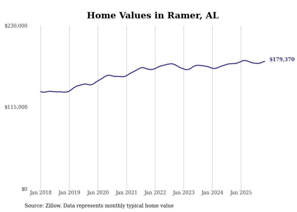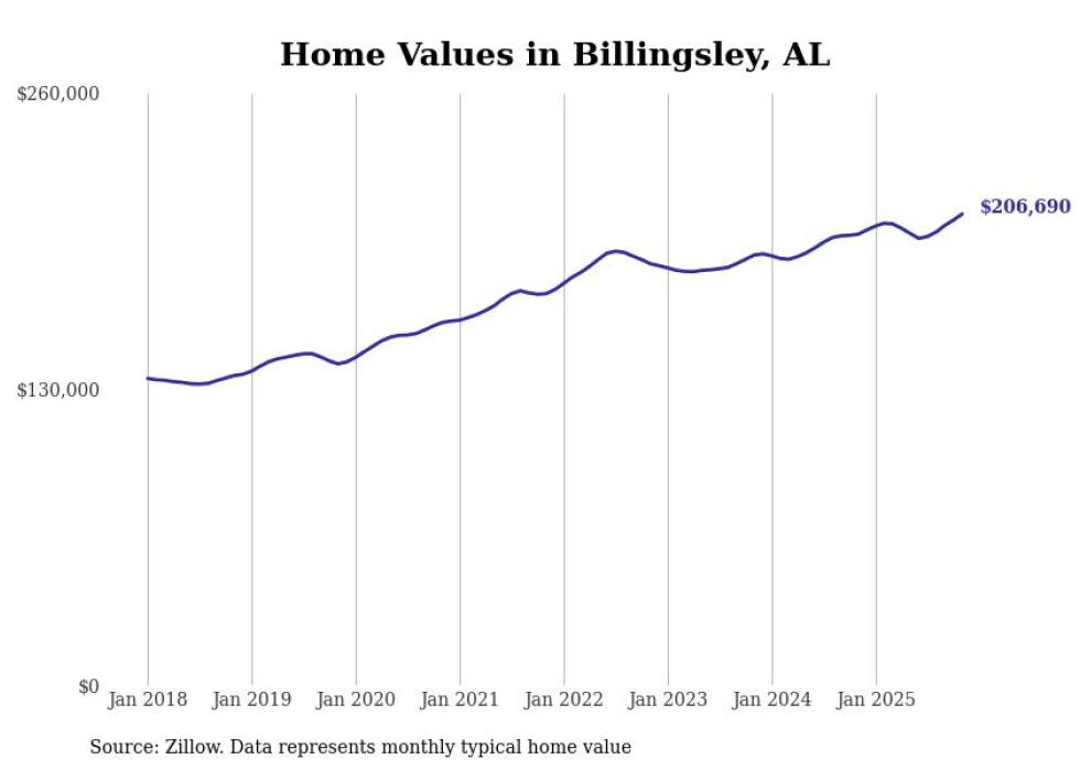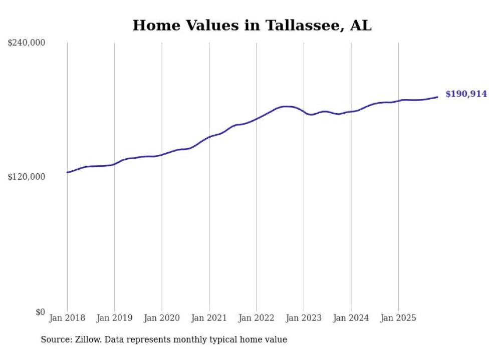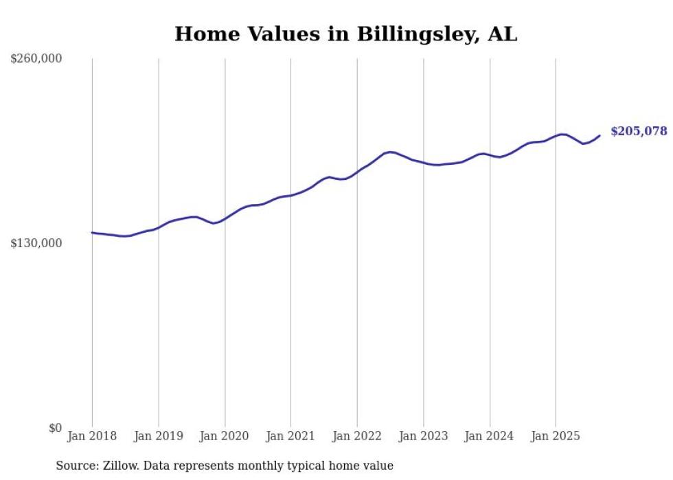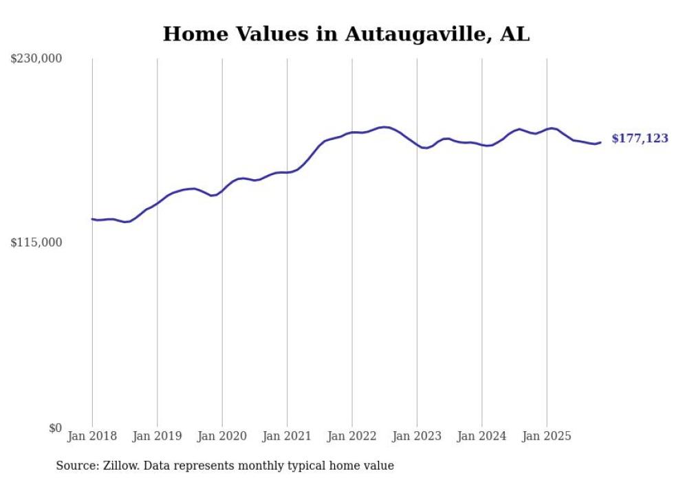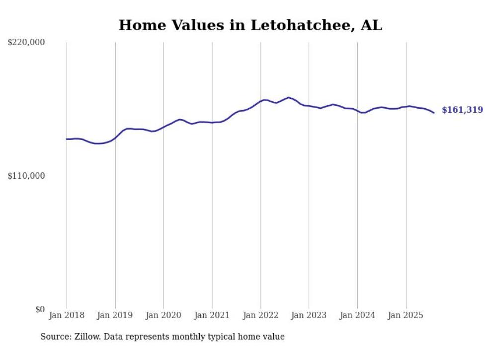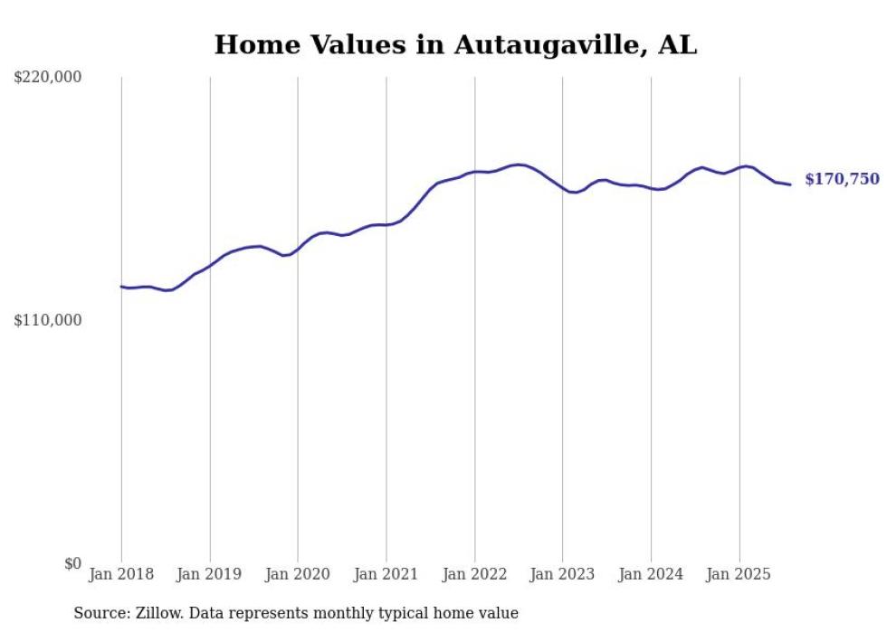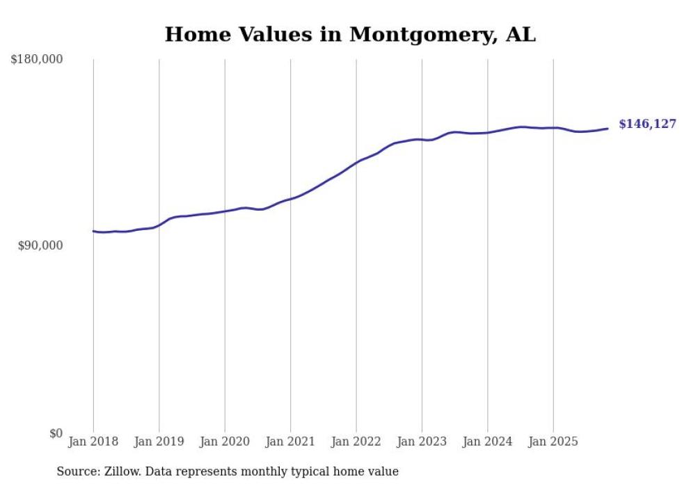 Stacker compiled a list of cities with the most expensive homes in the Montgomery metro area using data from Zillow. Charts show the monthly typical home value since January 2018. All 21 cities and towns with data available were included in the list.